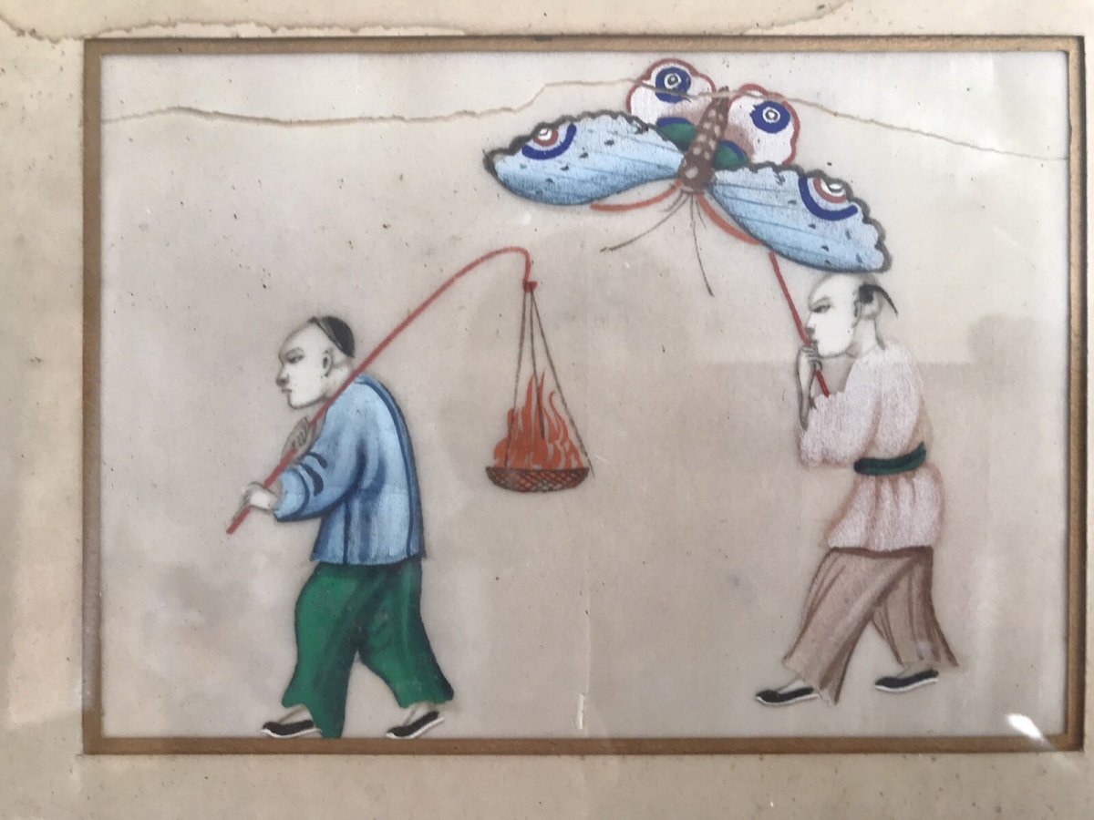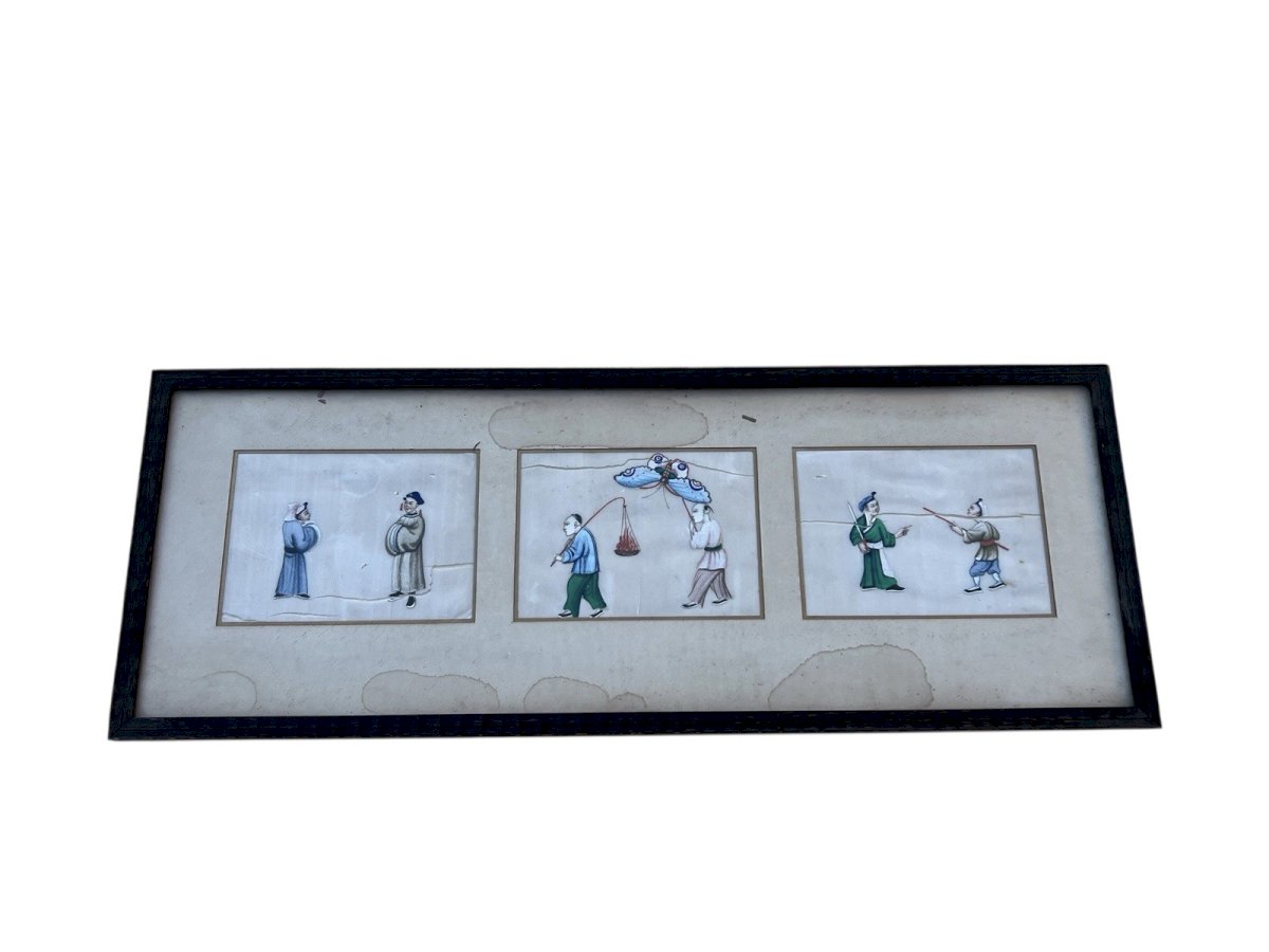 Split canvas, stains. Wooden frame. Panel sold as is. The photos serve as description. Panel dimensions approximately 56x20.5cms. Type: Oil. Country of origin: China. Genre: Classicism. Features: On silk. Theme: Genre scene.