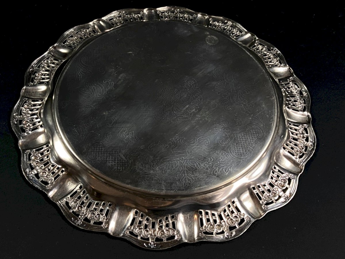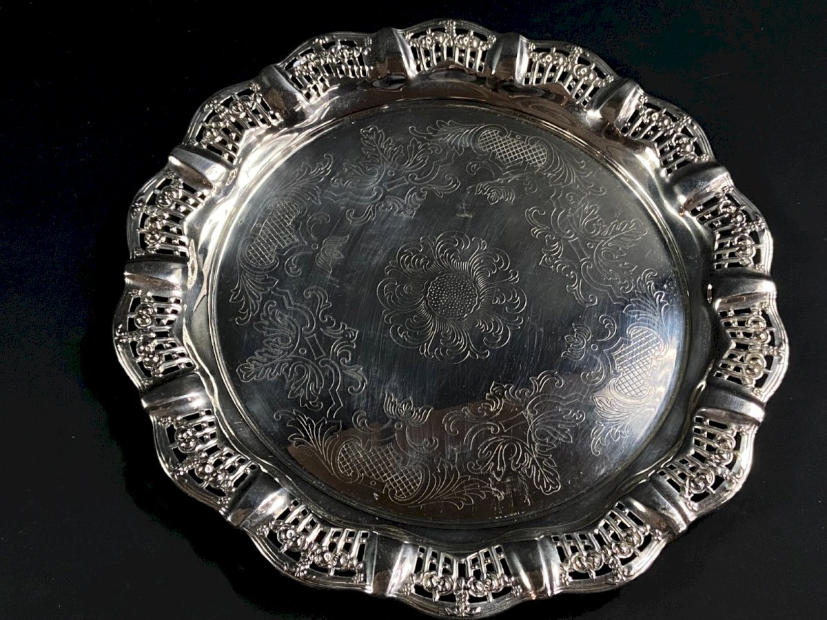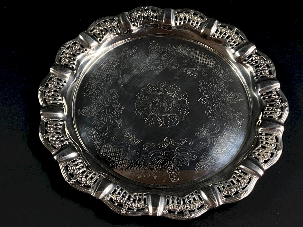 Circular tray with pierced border in Silver Plate Regency style, 20th century. Maximum dimensions: Diameter 33.3 x 2.2 cm. Weight: 447 grams. I will only mention fine usual scratches. Ultra-secure shipping worldwide - Order pickup available by appointment, 7 Rue Notre-Dame, 18000 Bourges. - Possibility of combining items in the same package: please contact me beforehand so I can calculate your optimized shipping costs. Authenticity: Original. Type: Tableware, Kitchen. Origin: United Kingdom. Country of origin: United Kingdom. Subtype: Tray. Material: Silver plate. Style: Regency.