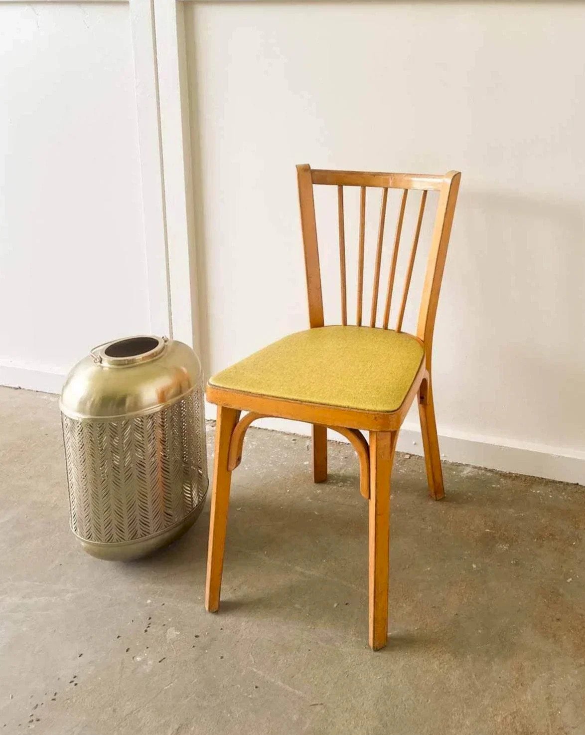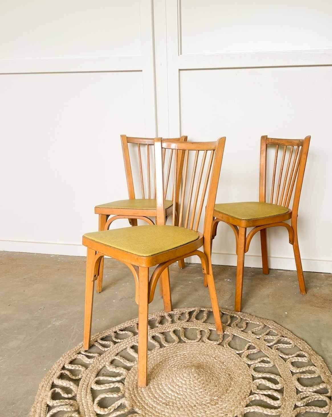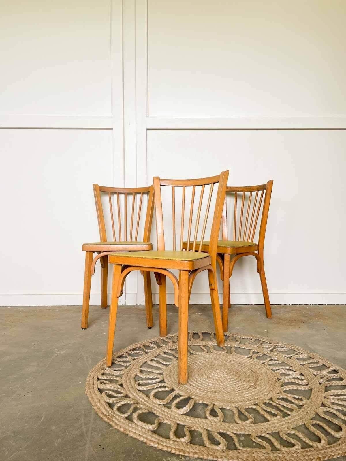 These Baumann wooden spindle chairs appeal to us for their originality and lovely details. In both vintage and contemporary settings, they will make an impact with their pretty yellow hue. Around a table, in the bedroom, or in front of a desk, they fit in anywhere. Sold individually and available in three copies. Unfortunately, this product is not visible in the store. Length: 36 cm Width: 34 cm Seat height: 44 cm Total height: 80 cm Condition: Used: Item has been used. Item shows some signs of superficial wear, fully operational and working correctly. It may be a display model or an item returned to the store after a short period of use. Possible imperfections. Color: Multicolor Height: Wood Width: Chairs Brand: Debongout Type: Secondhand product Material: Wood Style: Country