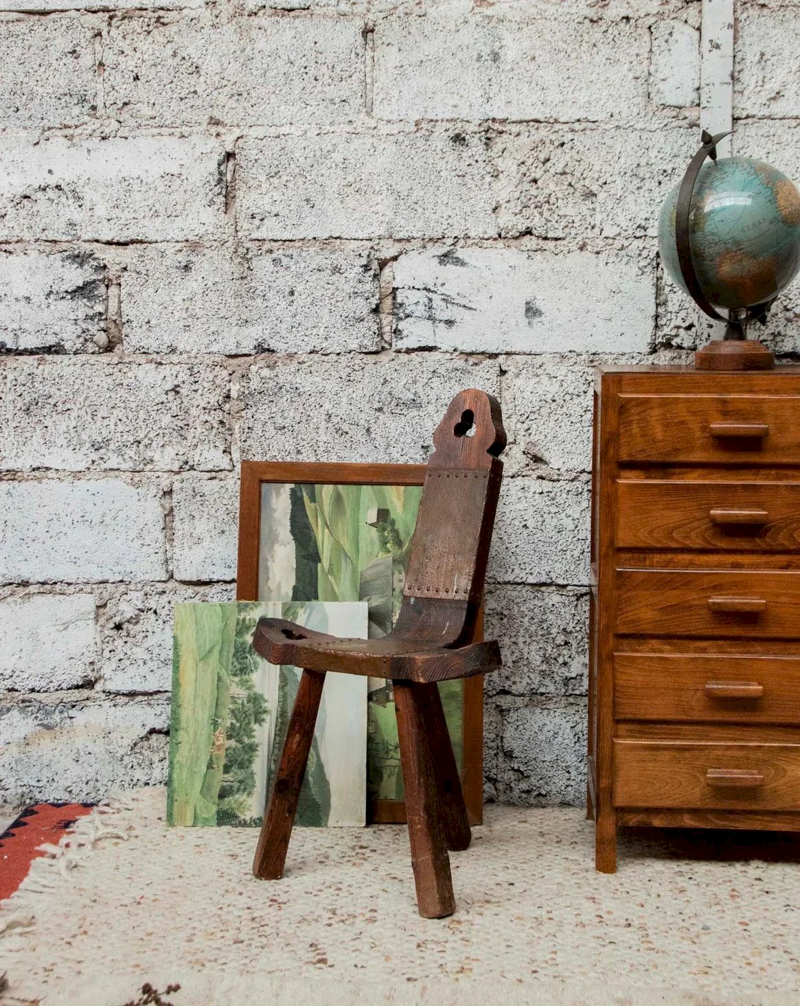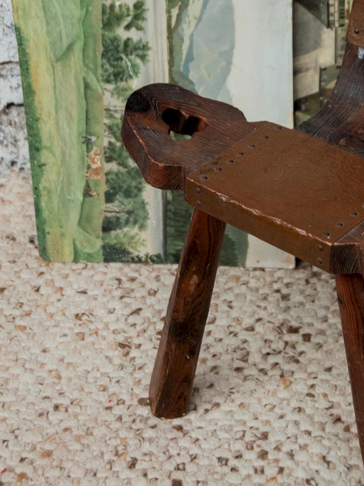 Discover the tripod brutalist chair, a unique piece that combines character and originality. Its delicate seat, designed to bring a touch of elegance, features a clover-shaped hole that adds an artistic note to its design. Although the front leg has a slightly wobbly appearance, it contributes to its raw and authentic charm, making this chair a perfect choice for those seeking eclectic and evocative furniture. Add a touch of boldness to your interior with this functional work of art. Length: 48 cm Width: 40 cm Height: 80 cm Seat height: 40 cm Condition: Used item with some superficial wear marks, fully operational and functioning correctly. It may be a demonstration model or an item returned to the store after a short period of use, including any potential imperfections. Color: Multicolor Height: Wood Width: Chairs Brand: Debongout Type: Thrifted product Material: Wood Style: Countryside