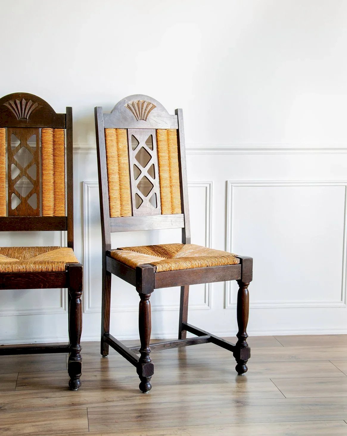 Bring a touch of natural elegance with this chair featuring a sturdy wooden structure. The cane backrest and seat add a refined texture and timeless style to the piece. Pretty details adorn the entire chair, highlighting its neat design. The cane shows some signs of wear, adding character and history to the whole. A unique piece that combines functionality and aesthetics, perfect for a warm decor. Sold individually, three quantities are available! Length: 49 cm Height: 112 cm Seat height: 47 cm Depth: 46 cm Condition: Used: Item that has been used. Item showing some superficial wear marks, ...Used: Item that has been used. Item showing some superficial wear marks, fully operational and functioning properly. It may be a display model or an item returned to the store after a short period of use. Any imperfections. Color: Multicolor Height: Wood, Cane Width: Chairs Brand: Debongout Type: Vintage product Material: Wood, Cane Style: Country