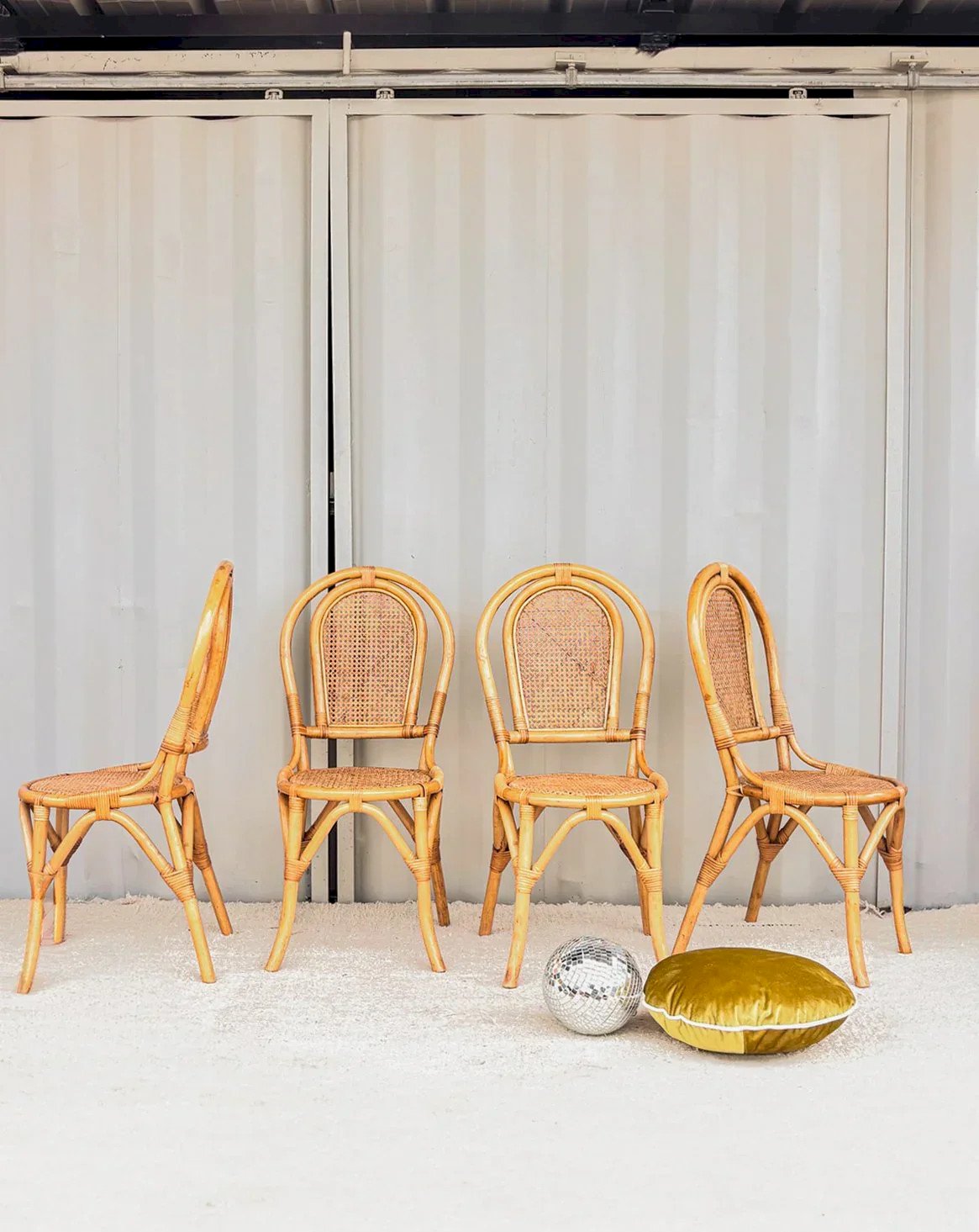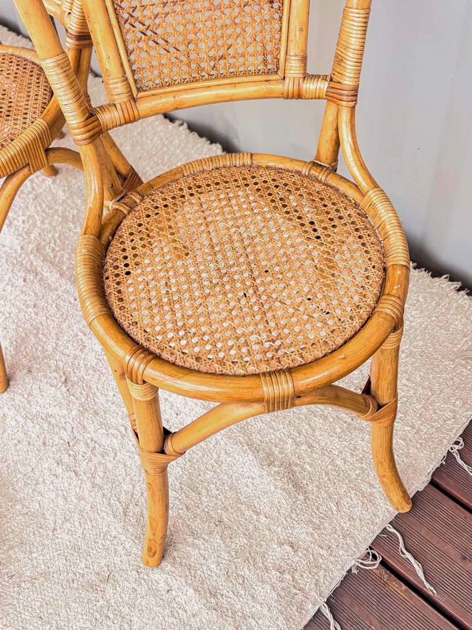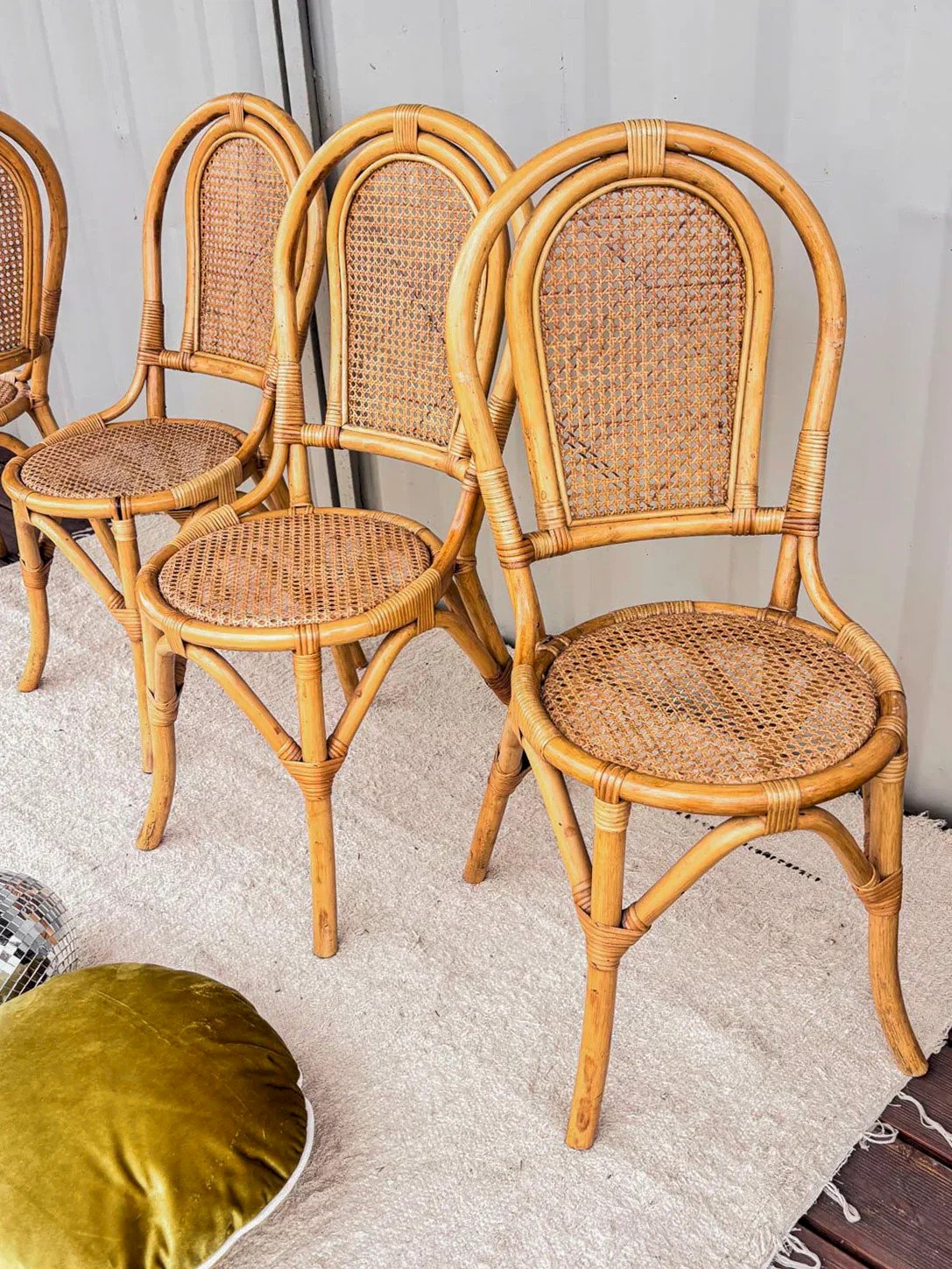 This set of 4 rattan chairs from the 1950s combines elegance and authenticity with its caned seats and backs. Their vintage design will add a touch of retro charm to your interior while providing optimal comfort for your moments of conviviality. Ideal for a dining room or a relaxation corner, these chairs are a must-have for lovers of unique decoration full of history. Easy to pair, they will blend harmoniously with all styles of decor. Width: 41 cm Height: 96 cm Seat height: 44 cm Depth: 52 cm Seat depth: 41 cm Condition:Used: Item has been used. Item shows some superficial signs of wear, ...Used: Item has been used. Item shows some superficial signs of wear, fully operational and functioning correctly. It may be a demonstration model or a returned item after a short period of use. any possible imperfections. Color:Multicolored Height:Rattan, Caning Width:Chairs Brand:Debongout Type:Thrifted product Material:Rattan, Caning Style:Country