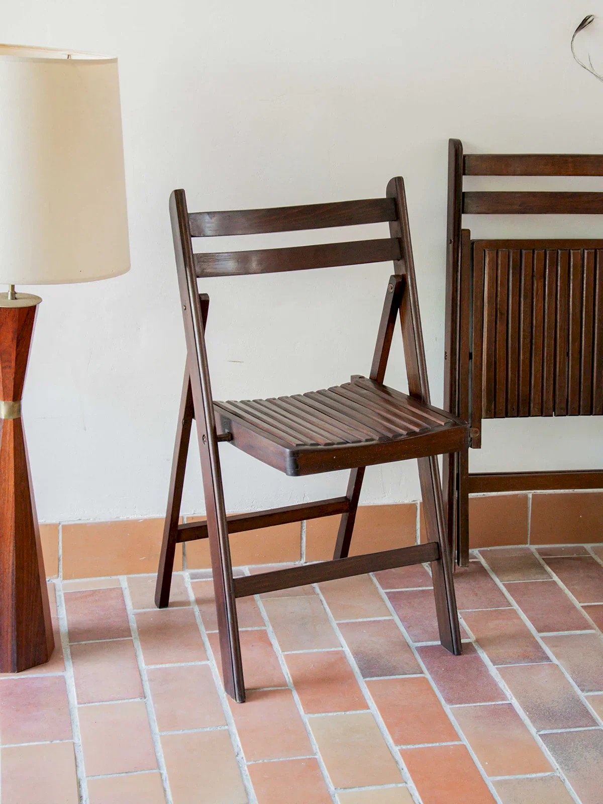Invite the retro charm of these dark wood folding chairs, dating from the 80s, with a simple and authentic design. This set of two practical and compact chairs folds for clever space-saving, and is suitable for both everyday use and occasional receptions. Their seat with balanced proportions and wooden structure provides a stable sitting experience, while their dark patina gives a warm and vintage atmosphere to the kitchen, terrace, or living room. Length: 46 cm Height: 85 cm Seat height: 46 cm Depth: 42 cm Condition: Used: Item that has been used. Item showing some superficial signs of wear, ... Used: Item that has been used. Item showing some superficial signs of wear, fully operational and functioning correctly. It may be a display model or an item returned to the store after a short period of use. the possible imperfections. Color: Multicolor Height: Wood Width: Chairs Brand: Debongout Type: Thrifted product Material: Wood Style: Country