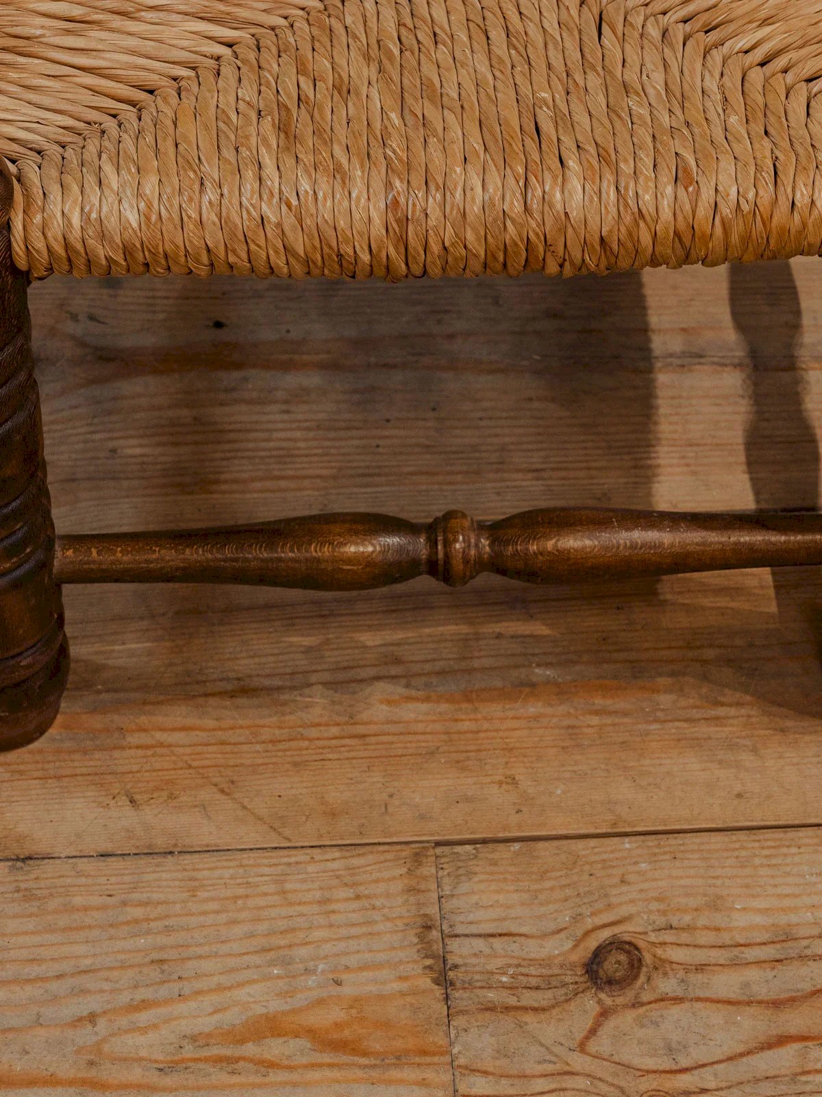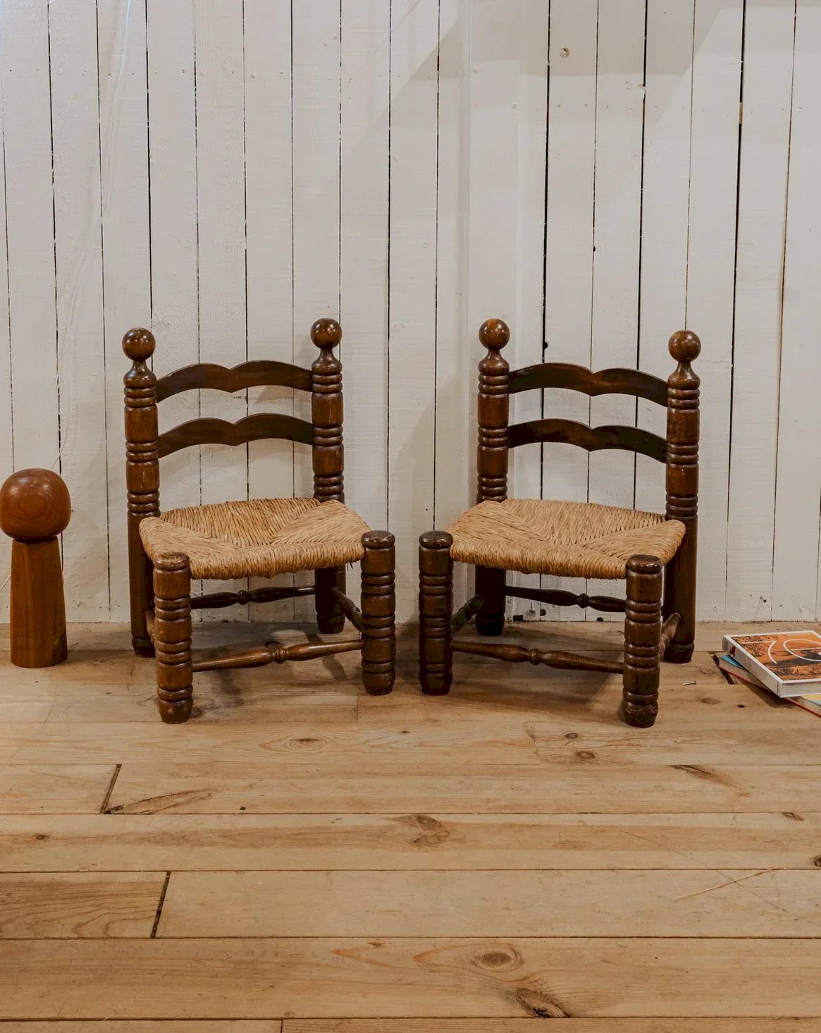 Invite this pair of low chairs, old fireplace chairs, made of wood with straw seating, whose simple lines and round legs evoke artisanal and warm furniture. Low in height, they easily slide near the hearth or into a reading nook, providing a comfortable and sociable extra seat. The wood/straw contrast adds a natural and textured touch, ideal for creating a cozy and authentic atmosphere. Some signs of time are present, telling their story. Length: 44 cm Width: 41 cm Height: 60 cm Seat height: 29 cm Condition: Used: Item has been used. Item shows some superficial wear, fully operational and functioning correctly. It may be a demonstration model or an item returned to the store after a short period of use. Possible imperfections. Color: Multicolor Height: Wood, Straw Width: Chairs Brand: Debongout Type: Thrifted product Material: Wood, Straw Style: Country