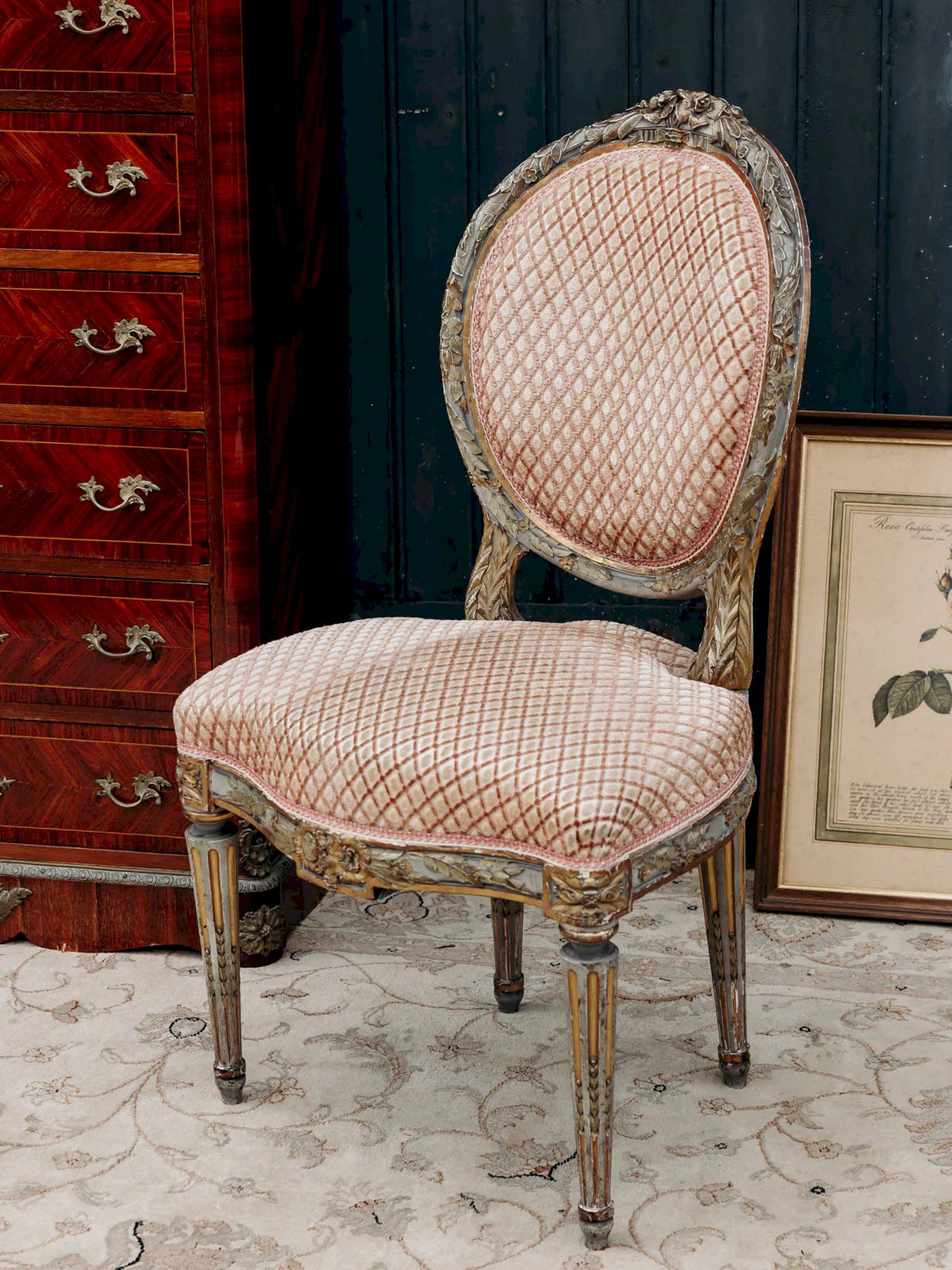 Discover this pair of wooden chairs with a rounded design, dressed in a pink upholstery on the seat and backrest. Their warm structure and soft lines offer an elegant silhouette that fits well around a dining table as well as in a reading nook or a bedroom. The wood ensures stability and sobriety while the pink fabric introduces a bright and delicate note. Proportioned to guarantee a comfortable seat without cluttering the space, they create a soft and refined atmosphere. Light signs of wear. Length: 50 cm Width: 45 cm Height: 92 cm Seat height: 46 cm Condition: Used: Item that has been used. Item showing some signs of superficial wear, ... Used: Item that has been used. Item showing some signs of superficial wear, fully operational and functioning correctly. It may be a demonstration model or an item returned to the store after a short period of use. any potential imperfections. Color: Multicolor Height: Wood, Fabric Width: Chairs Brand: Debongout Type: Thrifted product Material: Wood, Fabric Style: Country
