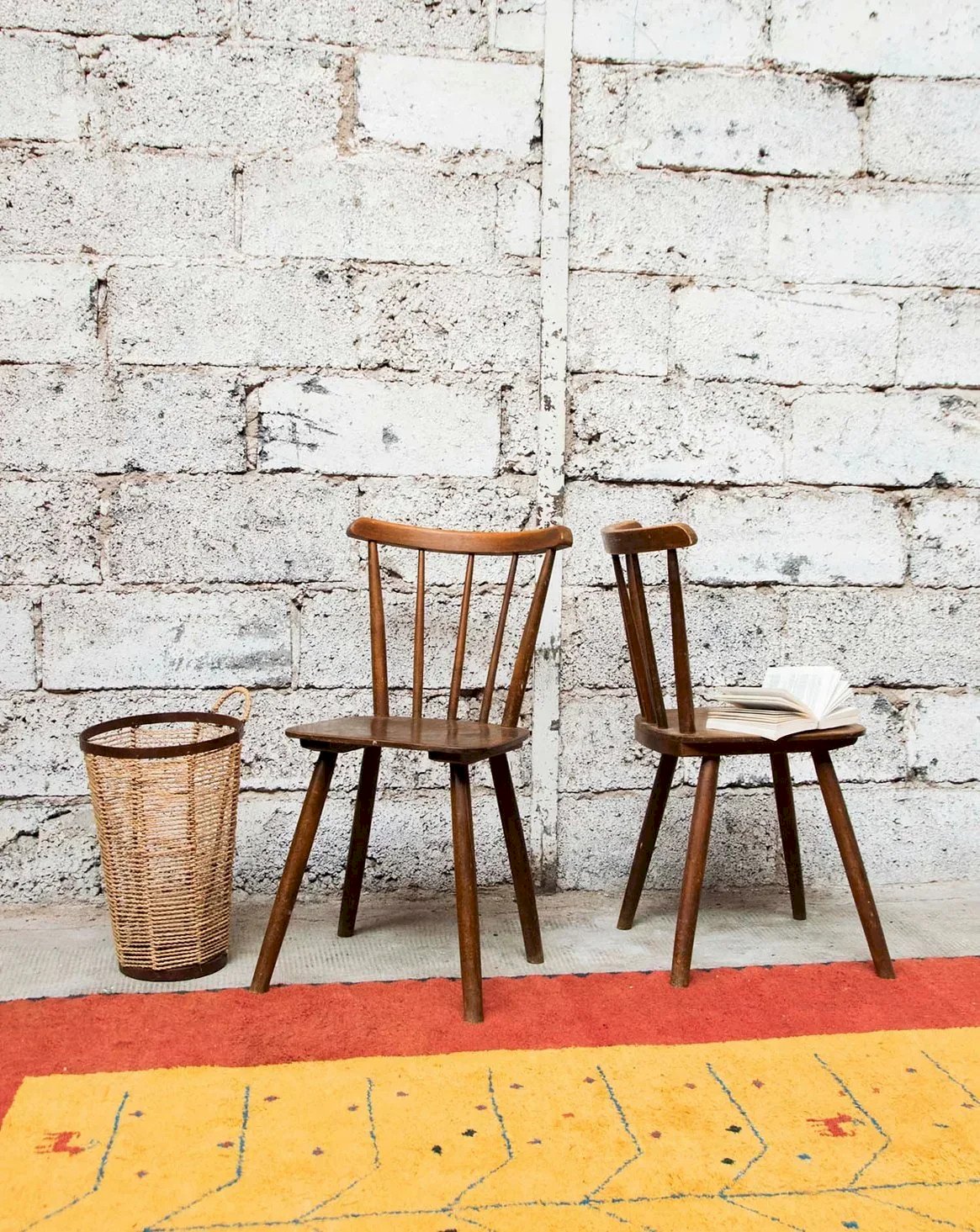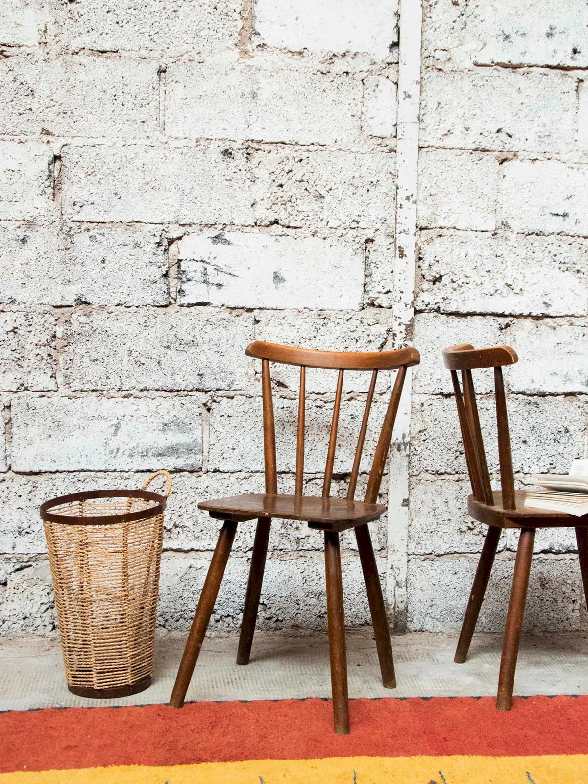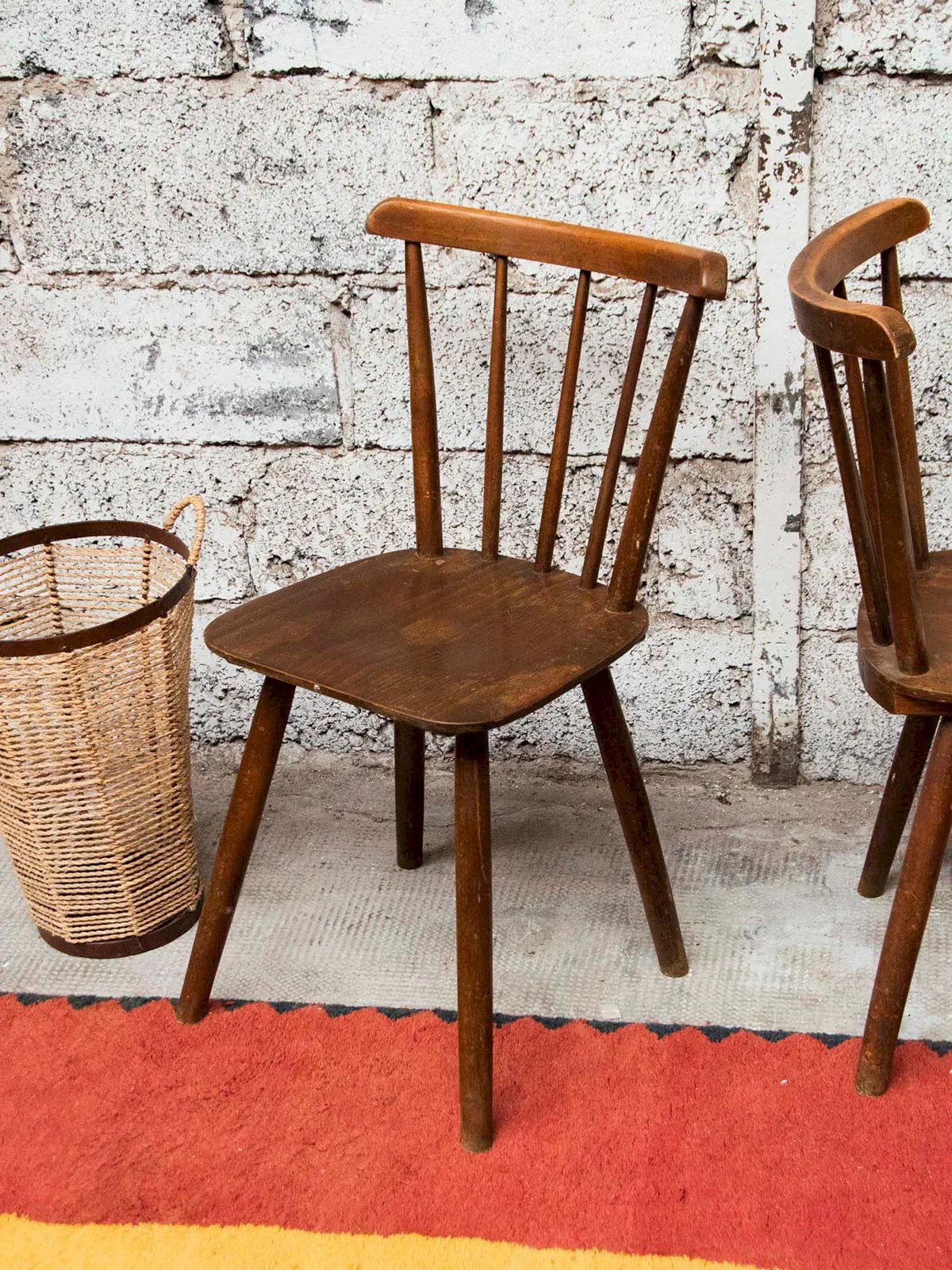 Discover this elegant pair of dark wood chairs with practical and contemporary splayed legs. Although they show some signs of wear, they add an authentic charm to your interior. Perfect for a dining room or a reading nook, these chairs are not only aesthetically pleasing but also comfortable. Three pairs are available for sale, each with varying signs of wear depending on the pair, so don't wait any longer to bring a vintage touch to your decor! Length: 39 cm Width: 39 cm Height: 82 cm Seat height: 44 cm Condition: Used: Item that has been used. Item showing some superficial signs of wear, fully operational and functioning properly. It may be a display model or an item returned to the store after a short period of use. Any possible imperfections. Color: Multicolor Height: Wood Width: Chairs Brand: Debongout Type: Thrifted Product Material: Wood Style: Country