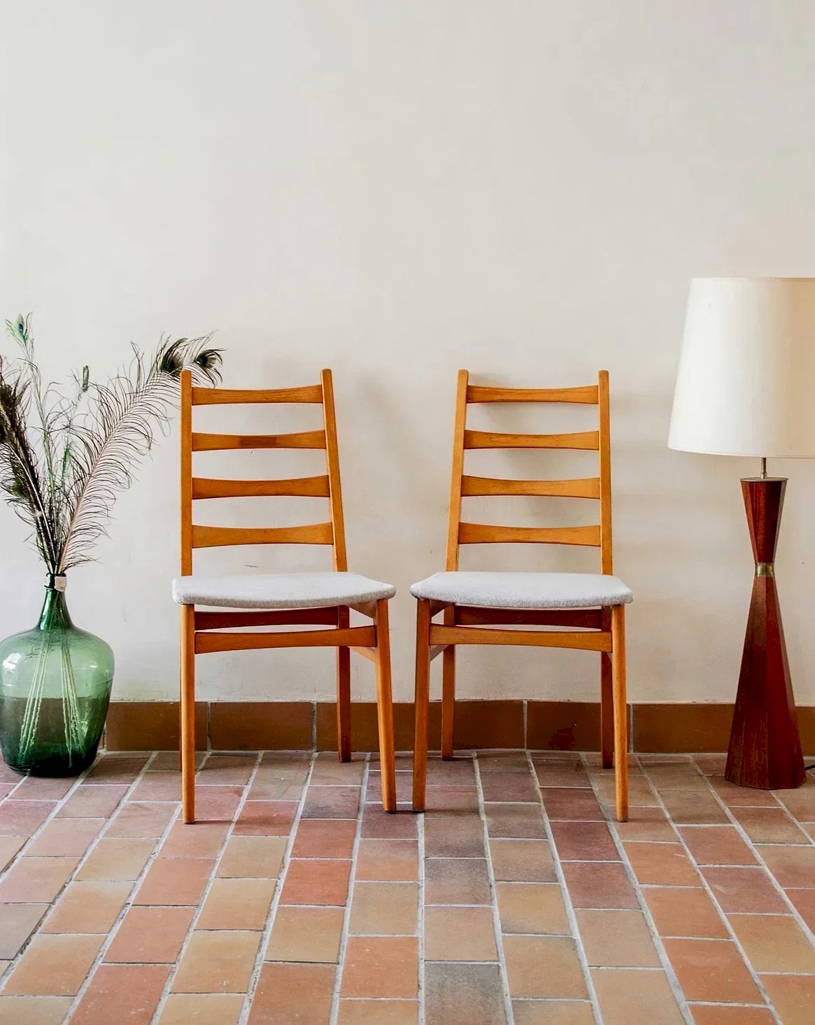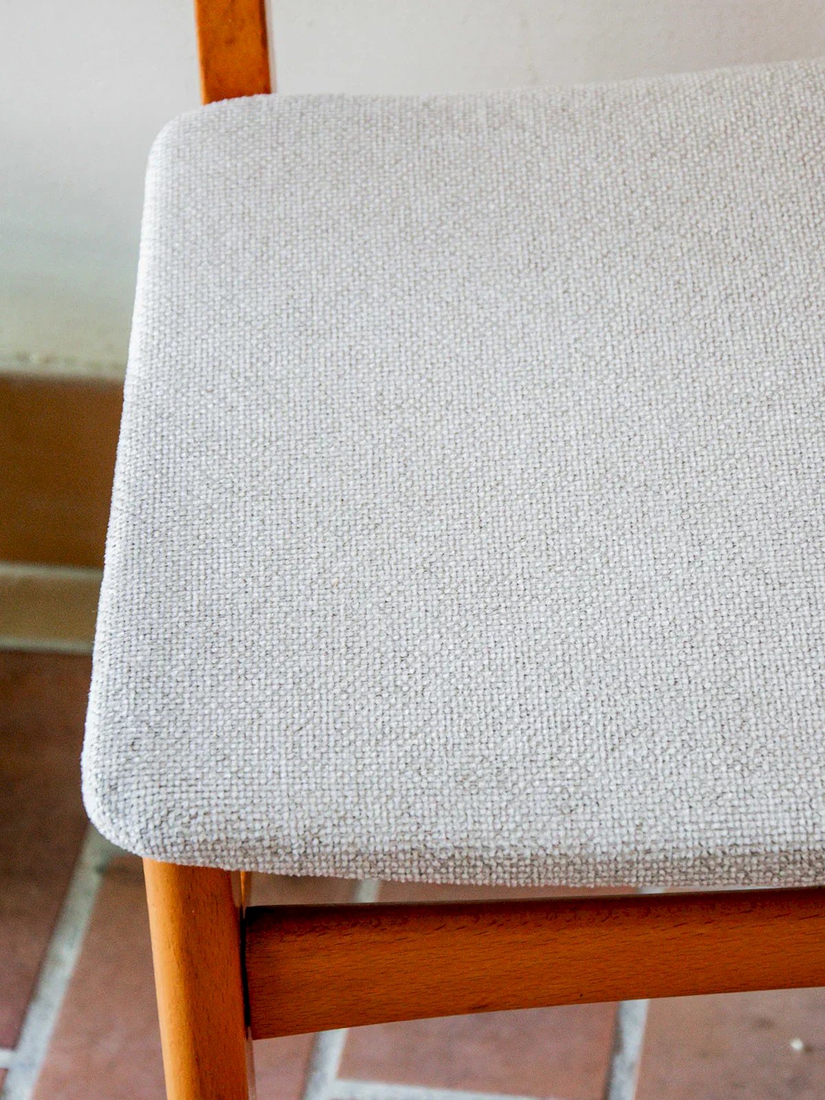 Adopt this lovely set of two light gray fabric chairs with light wood, featuring a subtle blend of materials that creates a soft and natural ambiance. The backrest, composed of four wavy bars, offers an elegant and airy design, while the curved seat ensures immediate comfort for everyday meals. Compact and well-proportioned, they fit perfectly around a kitchen table as well as in a work corner or relaxation space. In good overall condition. Length: 44 cm Height: 88 cm Seat height: 43 cm Depth: 46 cm Condition: Used: Item has been used. Item shows some superficial signs of wear, fully operational and functioning properly. It may be a display model or an item returned to the store after a short period of use. Any possible imperfections. Color: Multicolor Height: Fabric, Wood Width: Chairs Brand: Debongout Type: Thrifted product Material: Fabric, Wood Style: Country