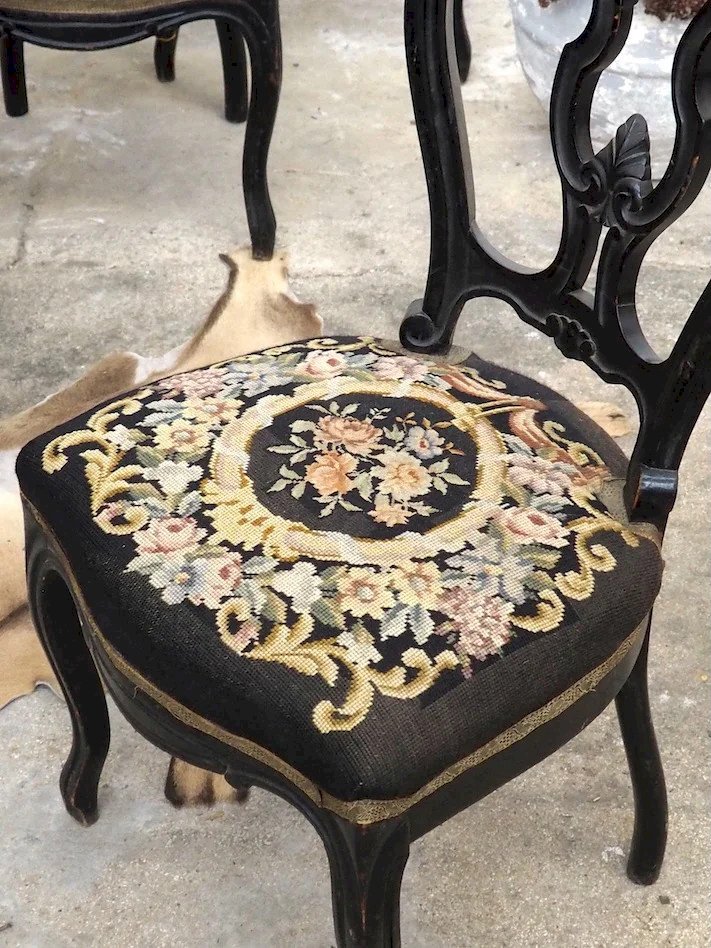 Adopt four Napoleon III-style chairs with black painted wood and original tapestry in canvas, which bring classic elegance to your dining room or a cozy corner. Their high silhouette and careful proportions offer a strong presence without overwhelming the space, while the original fabric imparts warmth and historical patina. These chairs pair well with both contemporary interiors and vintage decor, creating a refined and inviting atmosphere. Width: 47 cm Depth: 52 cm Seat depth: 44 cm Height: 92 cm Seat height: 46 cm Condition: Used item. Item shows some superficial signs of wear... Used item. Item shows some superficial signs of wear, fully operational and functioning correctly. It may be a display model or an item returned to the store after a short period of use. any possible imperfections. Color: Multicolor Height: Wood, Fabric Width: Chairs Brand: Debongout Type: Thrifted product Material: Wood, Fabric Style: Country