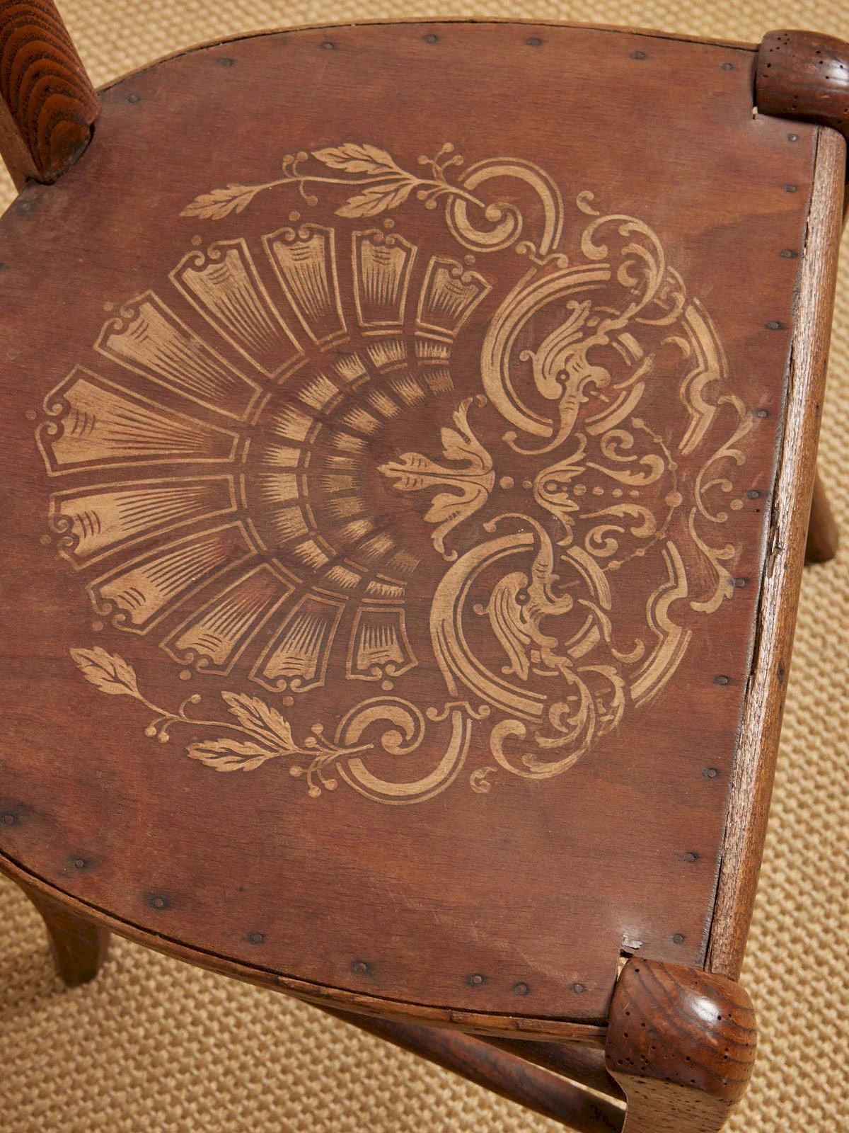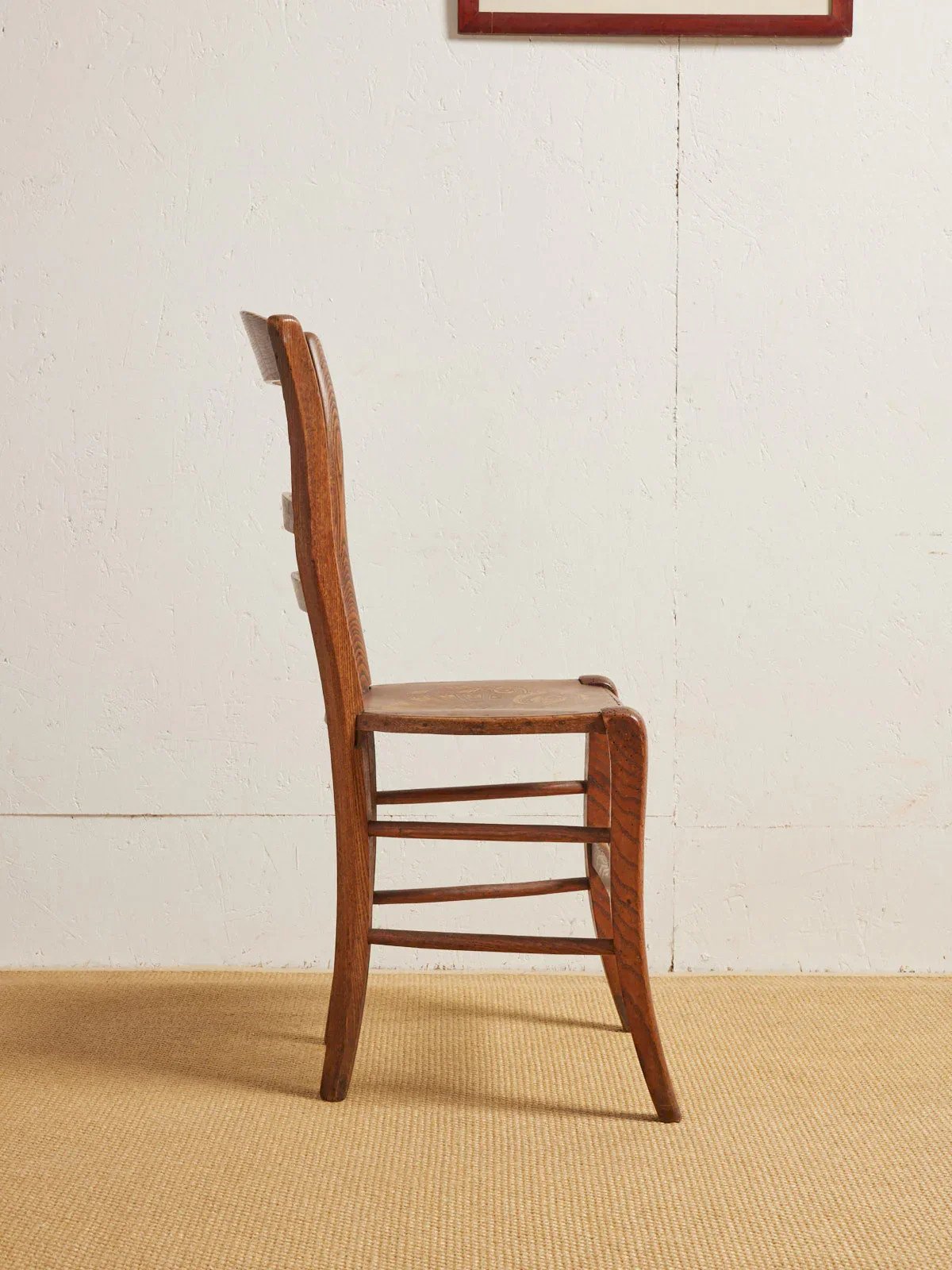 Adopt this set of 4 Luterma chairs made of dark wood, delicately woodburned, which suggest an aesthetic dated from the late 19th to the early 20th century. Their proportions and well-thought-out seating make them ideal for a dining table or to furnish an intimate dining nook, while the woodwork brings a warm and elegant presence. Patinated and worn by time, they are a true piece of history around the table. Chairs sold in sets of 4, with 2 sets available. Length: 38 cm Width: 38 cm Height: 84 cm Seat height: 44 cm Seat depth: 38 cm Seat width: 38 cm Condition: Used: Item has been used. Item shows some signs of superficial wear ... Used: Item has been used. Item shows some signs of superficial wear, fully operational and functioning properly. It may be a display model or an item returned to the store after a short period of use. Any imperfections. Color: Multicolor Height: Wood Width: Chairs Brand: Debongout Type: Vintage product Material: Wood Style: Country