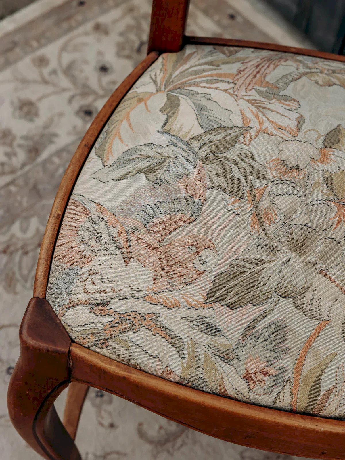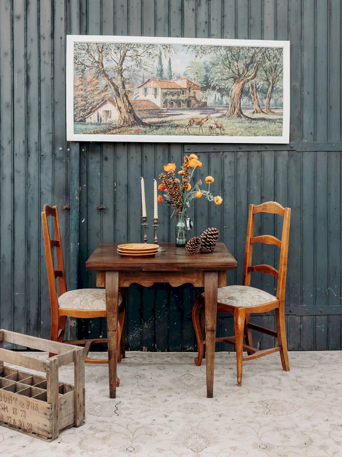 Add a set of four dark wood chairs with a two-bar backrest and a round seat covered in comfortable fabric. Their slender silhouette and balanced proportions fit well around a dining table as well as in a more intimate dining corner, bringing warmth and a contemporary classic charm. The dark wood and textile seating create a welcoming and understated atmosphere, ideal for elegant and friendly interiors. Light signs of wear are present. Length: 44 cm Width: 40 cm Height: 103 cm Seat height: 52 cm Condition: Used: Item has been used. Item shows some superficial signs of wear, fully operational and functioning correctly. It may be a display model or an item returned to the store after a short period of use. Possible imperfections. Color: Multicolor Height: Wood, Fabric Width: Chairs Brand: Debongout Type: Vintage product Material: Wood, Fabric Style: Country