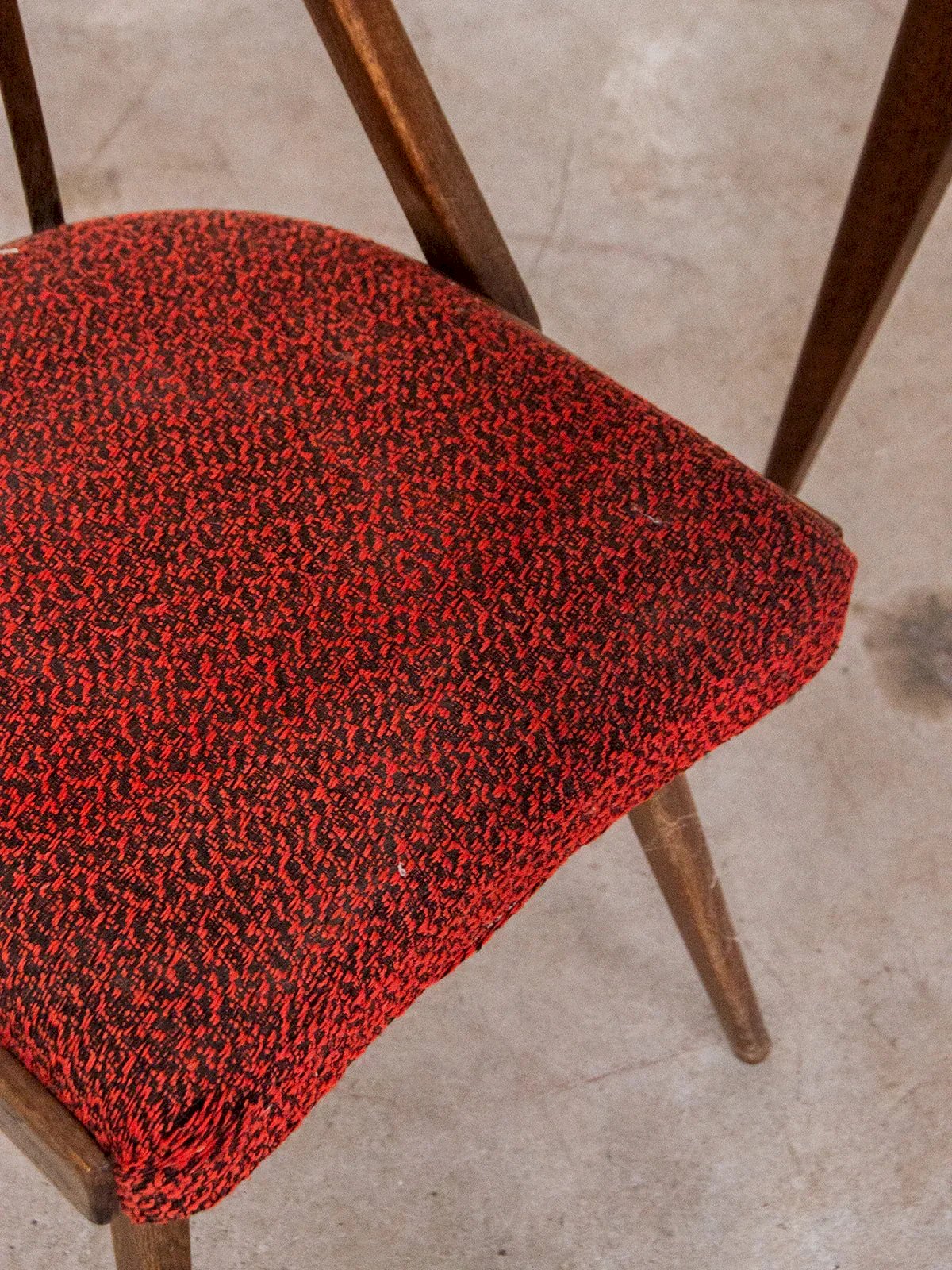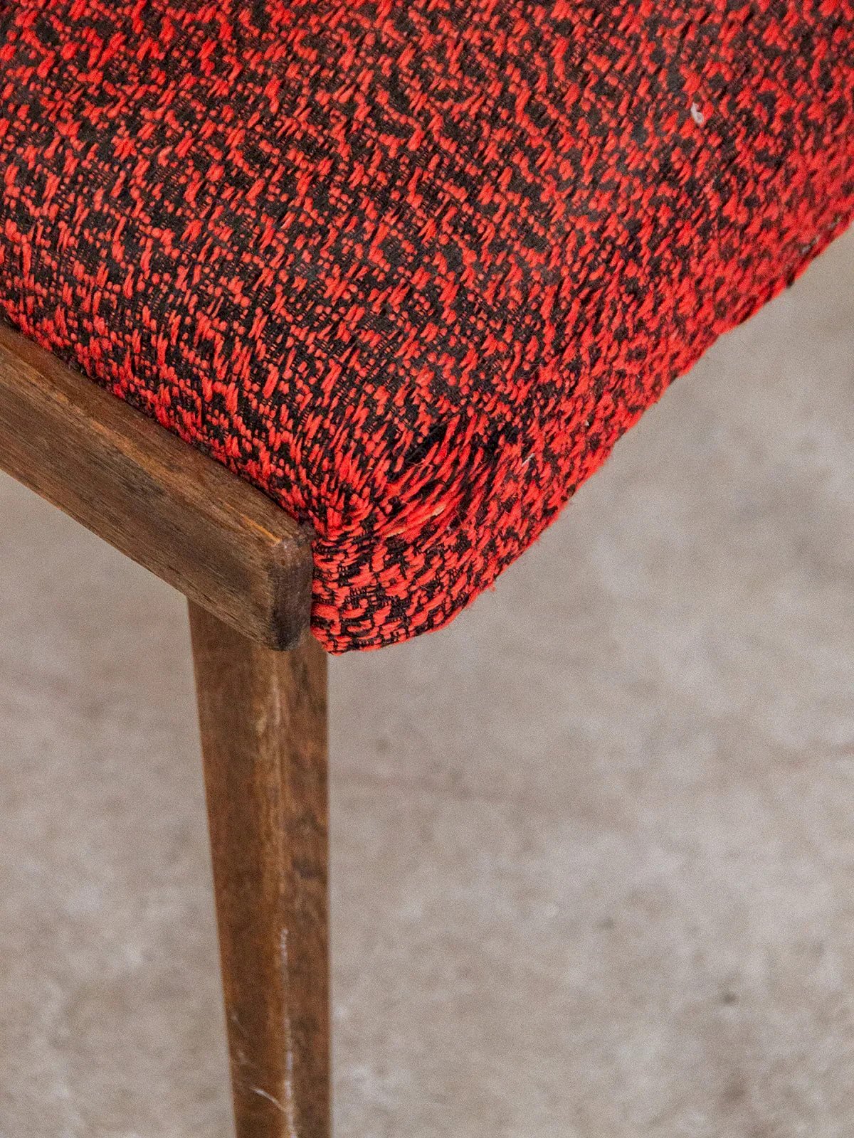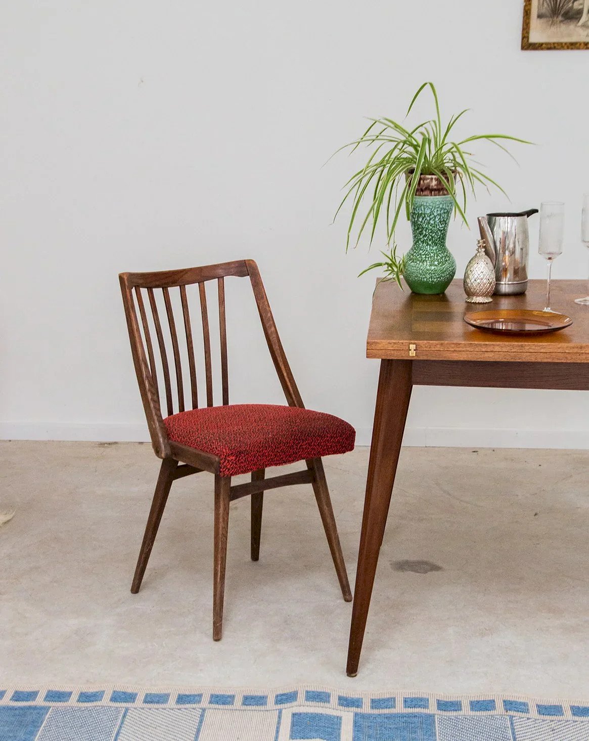 Add a warm touch to your interior with this dark wood chair featuring a backrest made of six elegant bars. Its red/orange upholstered seat, subtly highlighted with black accents, combines comfort and character. A simple yet charming piece, perfect for completing your dining room or a cozy eating nook. Sold individually, 3 pieces are available. Length: 44 cm Width: 44 cm Height: 79 cm Seat height: 48 cm Seat width: 39 cm Seat depth: 41 cm Condition: Used: Item has been used. Item shows some superficial wear marks, fully operational and functioning correctly. It may be a demonstration model or an item returned to the store after a short period of use, including possible imperfections. Color: Multicolor Height: Wood, Fabric Width: Chairs Brand: Debongout Type: Vintage product Material: Wood, Fabric Style: Country