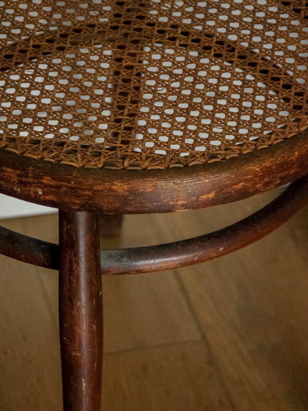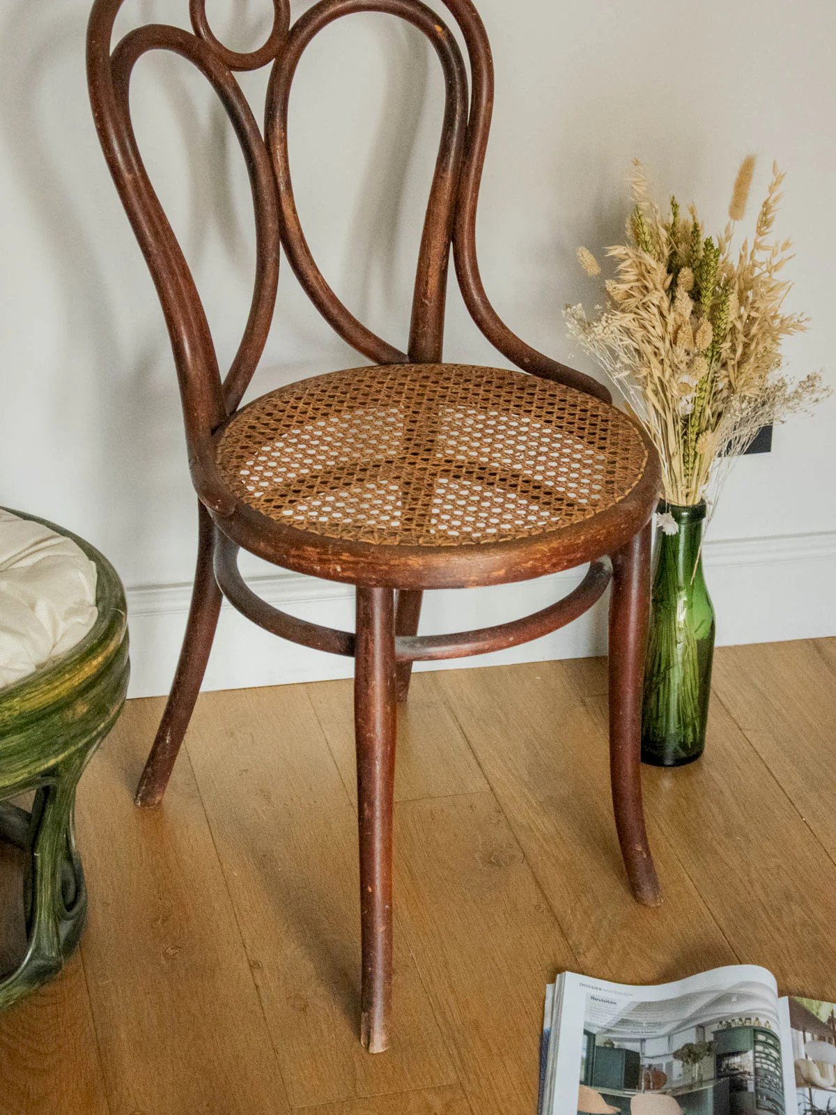 Adopt this signed Thonet chair in dark wood, whose rounded structure creates an elegant and light profile. The round caned seat offers natural comfort and pleasant breathability, making it ideal around a dining table, in a reading nook, or to recreate the atmosphere of a café. Its timeless look and fluid lines fit seamlessly into both contemporary interiors and more traditional decor. Height: 87 cm Seat height: 48 cm Seat diameter: 41 cm Condition: Used: Item that has been used. Item showing some superficial signs of wear, fully operational and functioning properly. It may be a demonstration model or an item returned to the store after a short period of use. Any potential imperfections. Color: Multicolor Height: Caning, Wood Width: Chairs Brand: Debongout Type: Vintage product Material: Caning, Wood Style: Country