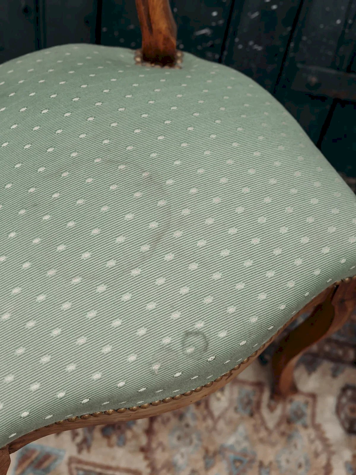 Discover this wooden chair with timeless charm. Its sturdy structure highlights beautiful details, while its green fabric seat, slightly marked as shown in the photos, adds a touch of originality and character to your interior. A piece that combines style, comfort, and conviviality, perfect for enhancing your decor. Width: 42 cm Height: 88 cm Seat height: 48 cm Depth: 50 cm Seat depth: 41 cm Condition: Used: Item has been used. Item shows some superficial signs of wear, ... Used: Item has been used. Item shows some superficial signs of wear, fully functional and operating correctly. It may be a display model or an item returned to the store after a short period of use. possible imperfections. Color: Multi-color Height: Wood, Fabric Width: Chairs Brand: Debongout Type: Vintage product Material: Wood, Fabric Style: Country