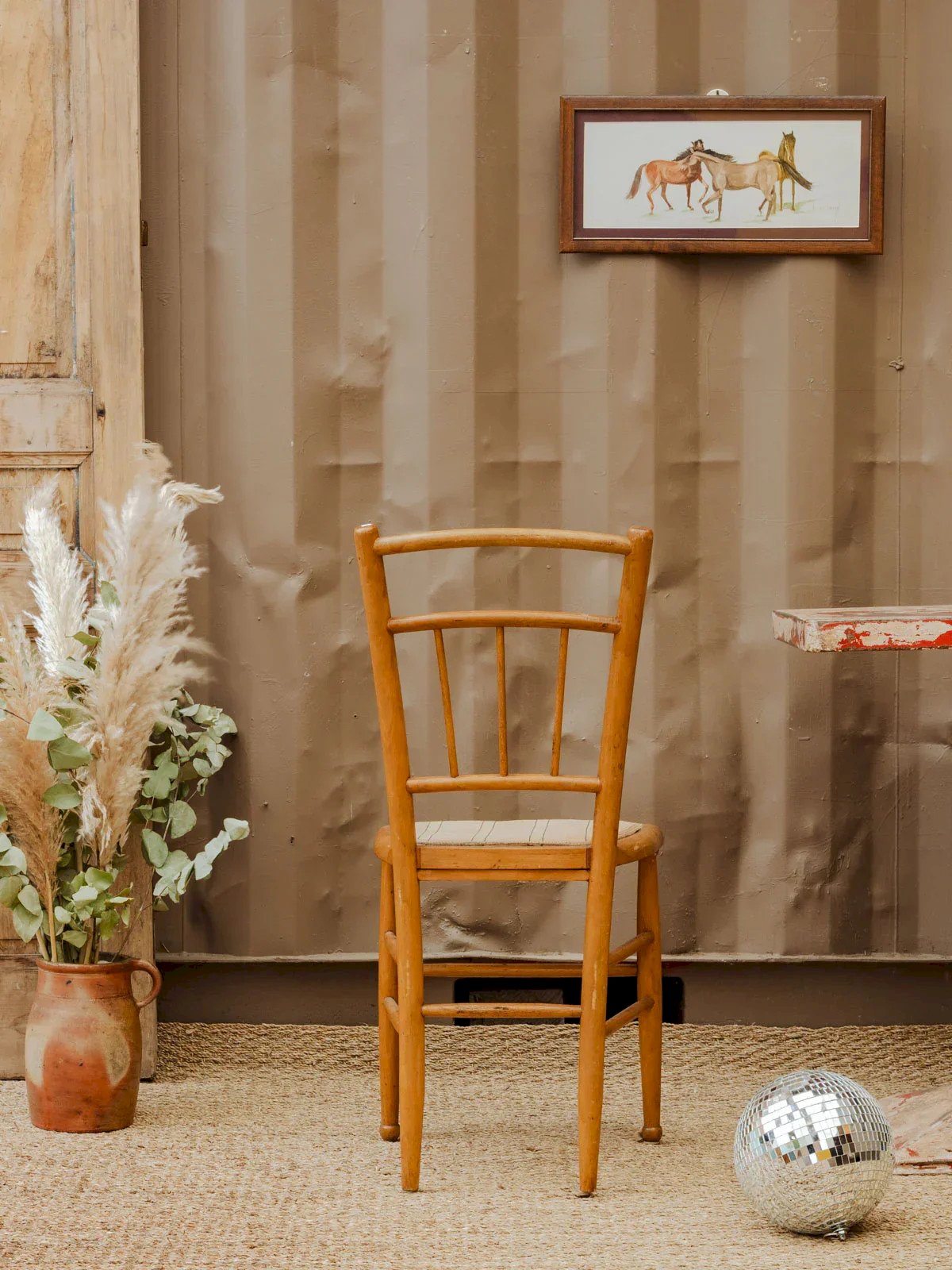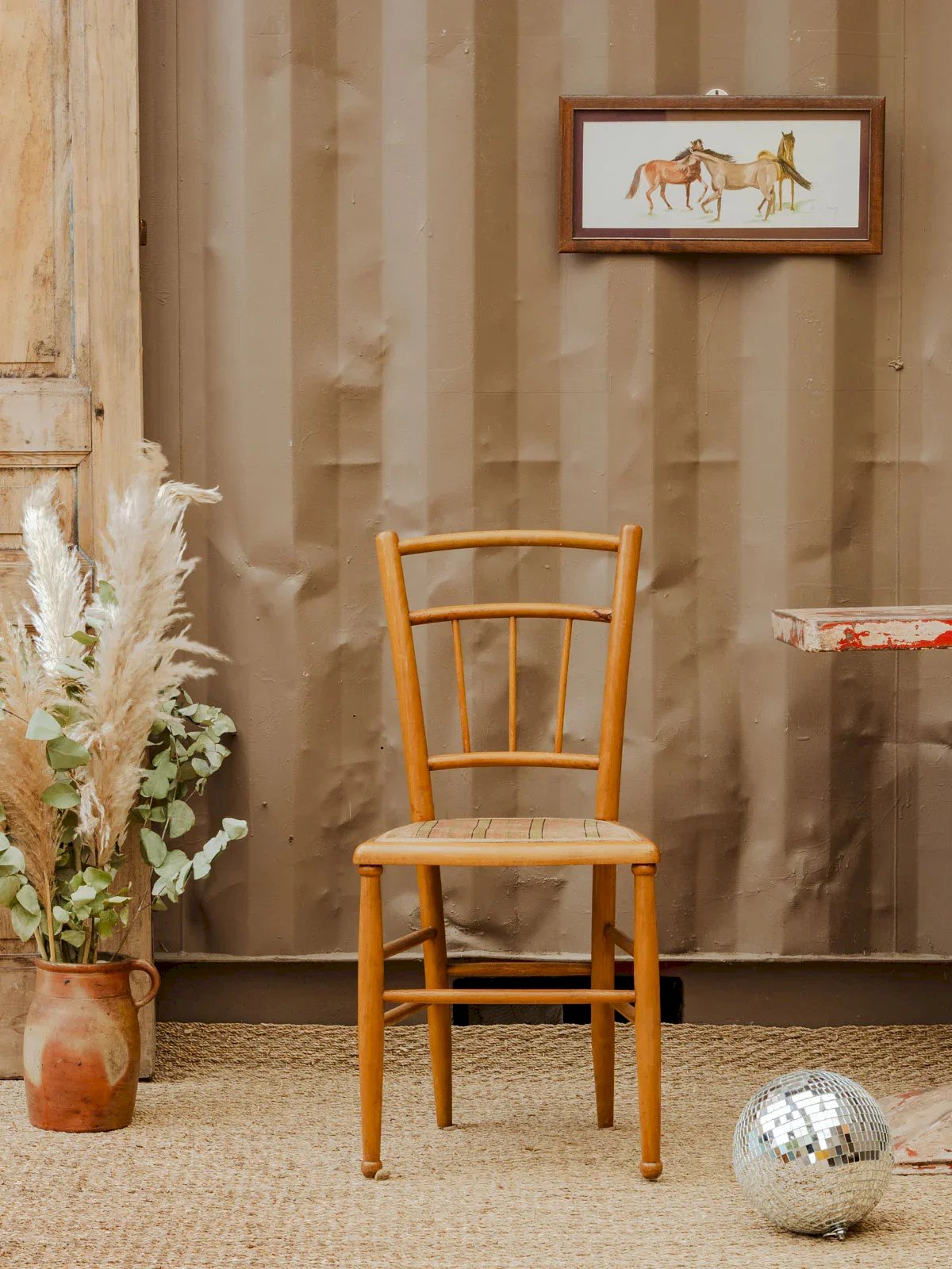Discover this vintage beech chair, perfect for adding an authentic touch to a dining room or breakfast nook. Its light wood structure features balanced lines and a firm seat covered in the original fabric, elegantly bordered with a trim that highlights the detail. Light signs of wear contribute to its charm. Two pieces available, sold individually. Perfect for creating a harmonious duo. Length: 40 cm Width: 36 cm Height: 86 cm Seat Height: 45 cm Condition: Used: Item has been used. Item shows some superficial signs of wear, fully operational and working correctly. It may be a display model or an item returned to the store after a short period of use. Any possible imperfections. Color: Multicolor Height: Beech, Fabric Width: Chairs Brand: Debongout Type: Vintage Product Material: Beech, Fabric Style: Countryside