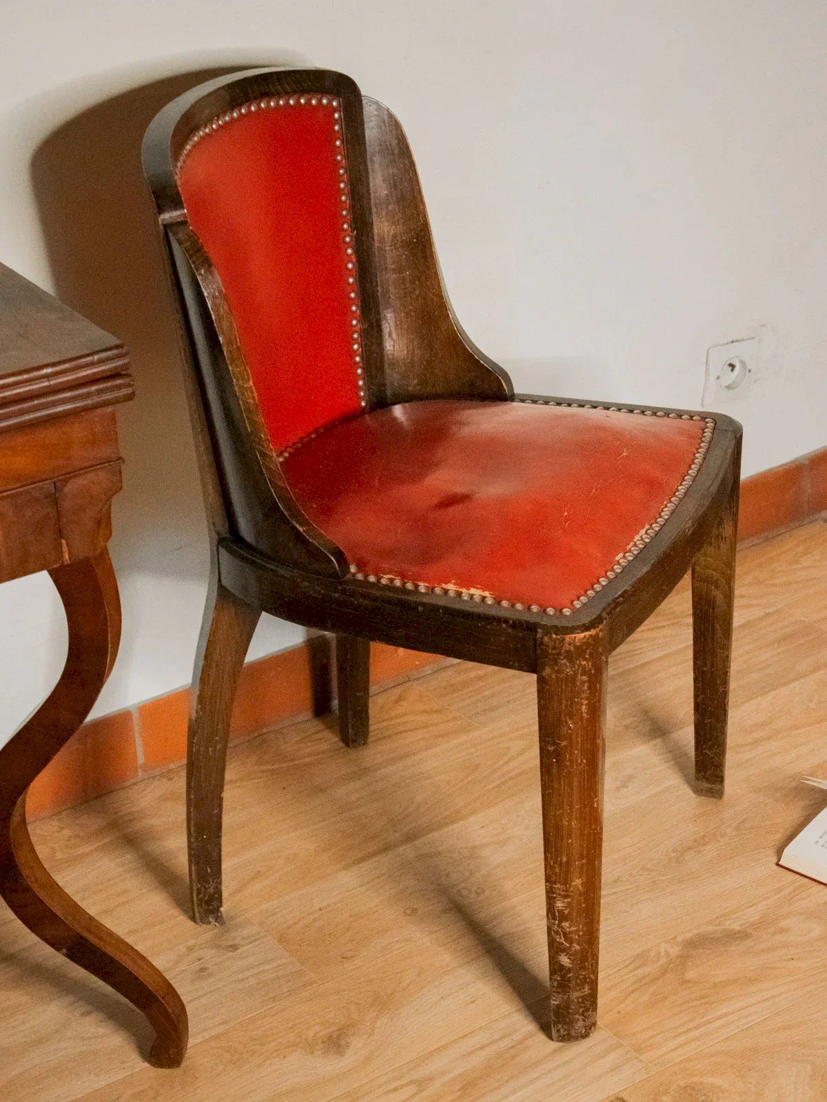 Embrace this Art Deco armchair upholstered in studded red leather, featuring a rounded backrest that evokes retro elegance. The seat, supported by springs, promises firm and lasting comfort, while the wooden structure reveals warm, sculptural lines, ideal for a living room or dining area in search of character. Its compact proportions make it easy to integrate as an accent chair or centerpiece. Signs of aging on the wood and leather. Length: 48 cm Width: 55 cm Height: 78.5 cm Seat height: 45 cm Seat depth: 42 cm Seat width: 42 cm Condition: Used: Item that has been utilized. Item shows some signs of superficial wear, fully operational and functioning correctly. It may be a demonstration model or an item returned to the store after a short period of use. any possible imperfections. Color: Multicolor Height: Wood, Leather, Metal Width: Chairs Brand: Debongout Type: Vintage product Material: Wood, Leather, Metal Style: Country