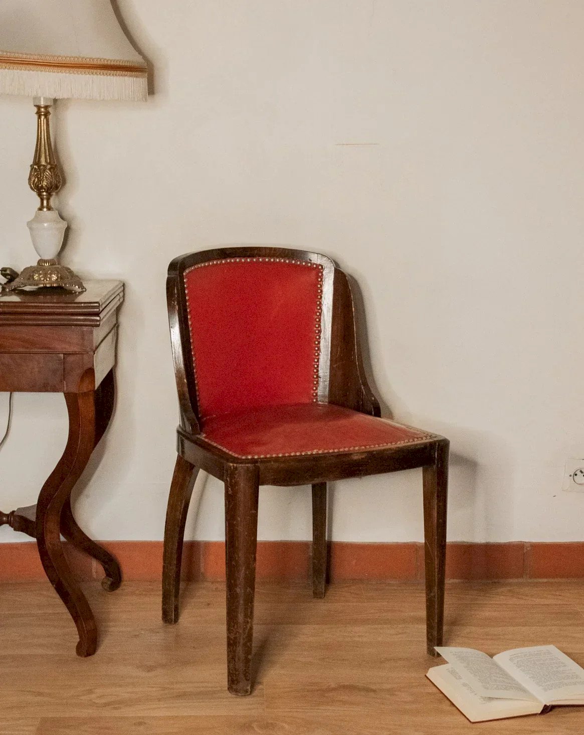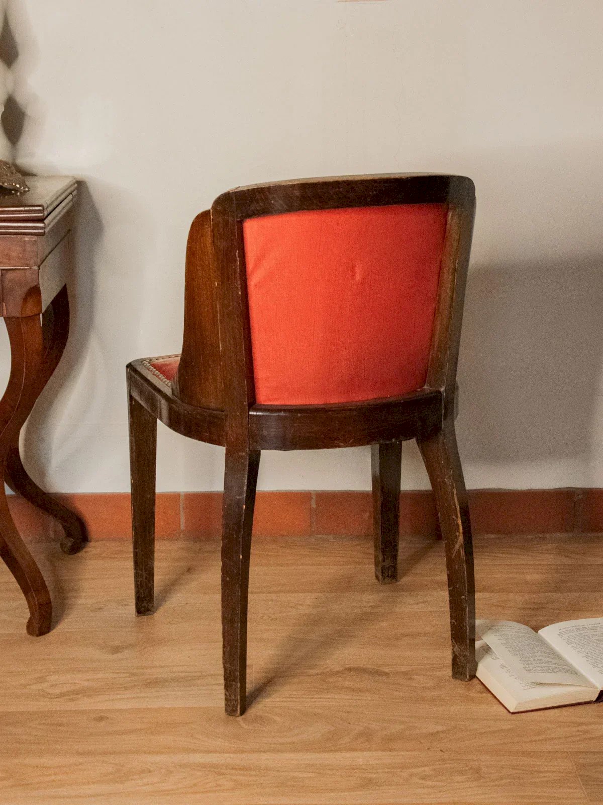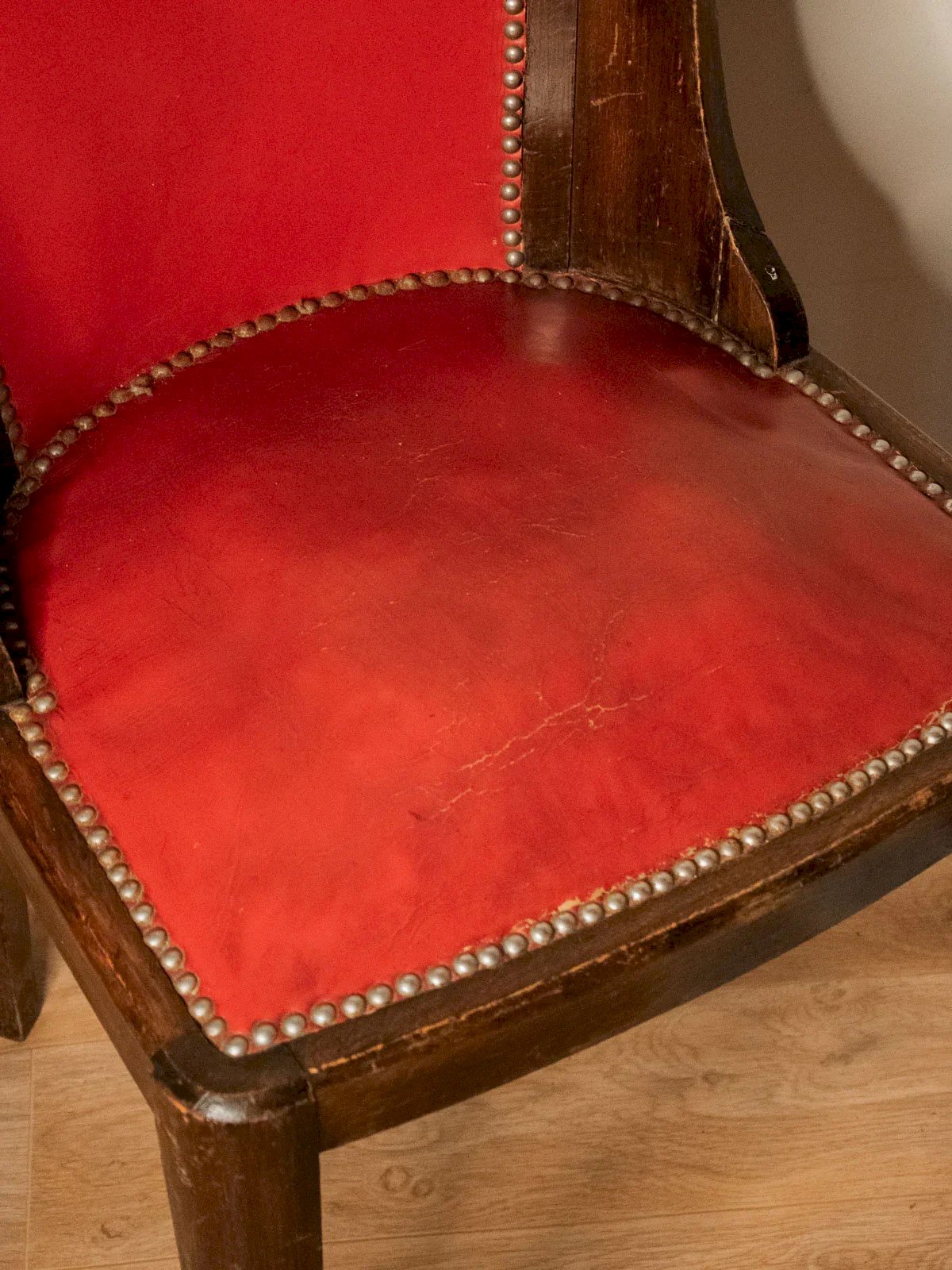 Adopt this red studded Art Deco armchair with generous lines and a rounded backrest, which adds a warm presence to a living room or library. Designed in wood and leather, it combines the elegance of the studs with a seat equipped with springs for sustained comfort, while its proportions remain controlled to easily fit into a contemporary interior. Its patina gives off a welcoming and narrative atmosphere. Signs of time on the wood and some cracks on the leather. Length: 45 cm Width: 55 cm Height: 78.5 cm Seat height: 45 cm Depth: 55 cm Seat depth: 42 cm Seat width: 42 cm Condition: Used: Item that has been used. Item showing some superficial signs of wear, fully operational and functioning properly. It may be a demonstration model or an item returned to the store after a short period of use. Any imperfections. Color: Multicolor Height: Wood, Leather, Metal Width: Chairs Brand: Debongout Type: Vintage product Material: Wood, Leather, Metal Style: Country