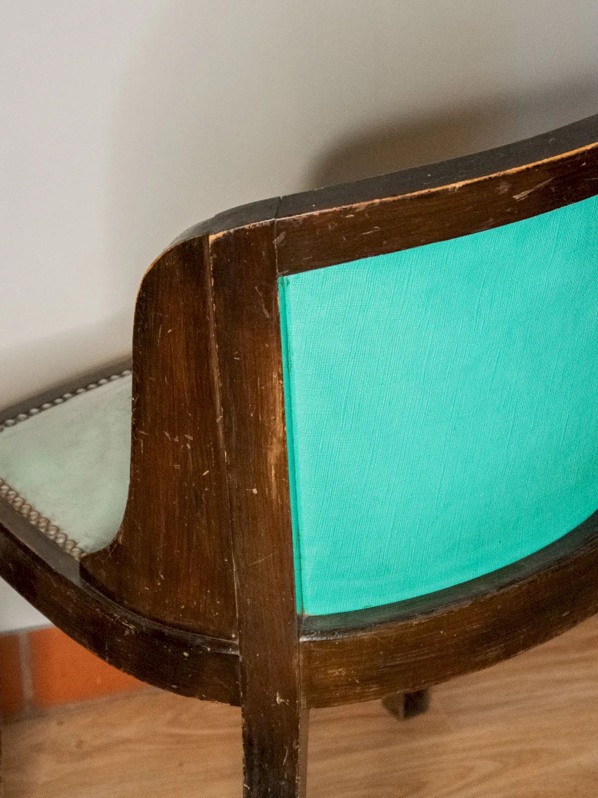 Adopt this sky blue Art Deco armchair, adorned with decorative studs and a rounded backrest, with a spring seat that ensures enveloping comfort. The combination of leather and wood highlights a retro elegance, perfect for a living room, bedroom, or reading nook where warmth and character reign. Signs of wear on the wood and some light cracks in the leather testify to its history. A few signs of use that add to its authenticity. Length: 48 cm Width: 55 cm Height: 78.5 cm Seat height: 45 cm Depth: 55 cm Seat depth: 42 cm Seat width: 42 cm Condition: Used: An item that has been used. An item showing some superficial wear marks... Used: An item that has been used. An item showing some superficial wear marks, fully operational and functioning correctly. It may be a display model or an item returned to the store after a short period of use. any potential imperfections. Color: Multicolor Height: Wood, Leather, Metal Width: Chairs Brand: Debongout Type: Vintage product Material: Wood, Leather, Metal Style: Country.