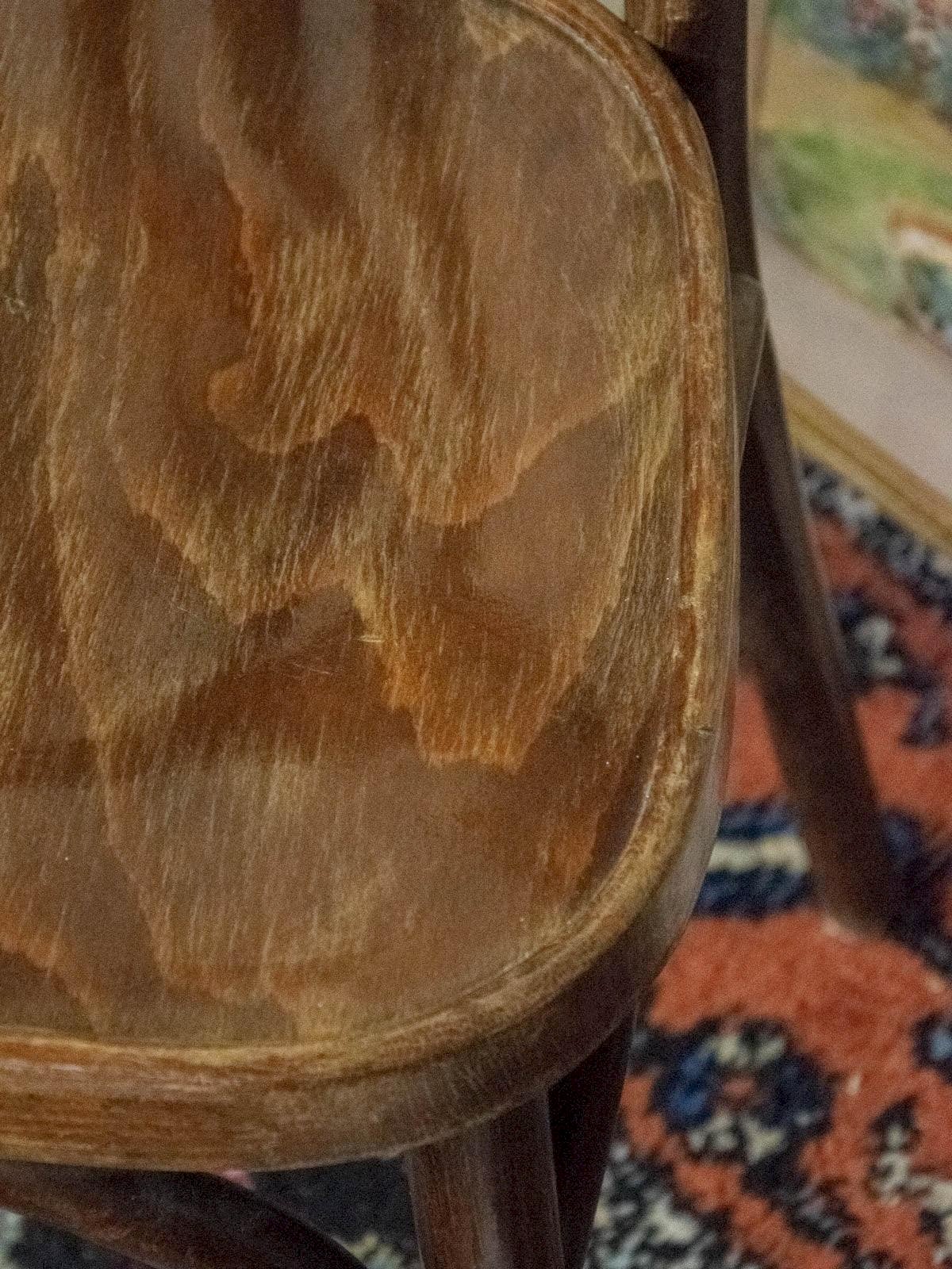 Discover this dark wood bistro chair with beautiful visible grains, simple lines, and a welcoming seat that adds a warm touch to the dining area or an intimate coffee space. Its wooden structure emphasizes a contemporary retro style, perfect for furnishing compact spaces while maintaining an elegant silhouette. The natural patina of the wood gives it an authentic presence and a great adaptability to both classic and modern settings. Light scratches and signs of wear. Length: 43 cm Width: 46 cm Height: 77.5 cm Seat height: 47.5 cm Seat depth: 39 cm Seat width: 38 cm Condition: Used: An item that has been used. The item shows some superficial signs of wear, fully operational and functioning correctly. It may be a demonstration model or an item returned to the store after a short period of use. possible imperfections. Color: Multicolor Height: Wood Width: Chairs Brand: Debongout Type: Vintage product Material: Wood Style: Country