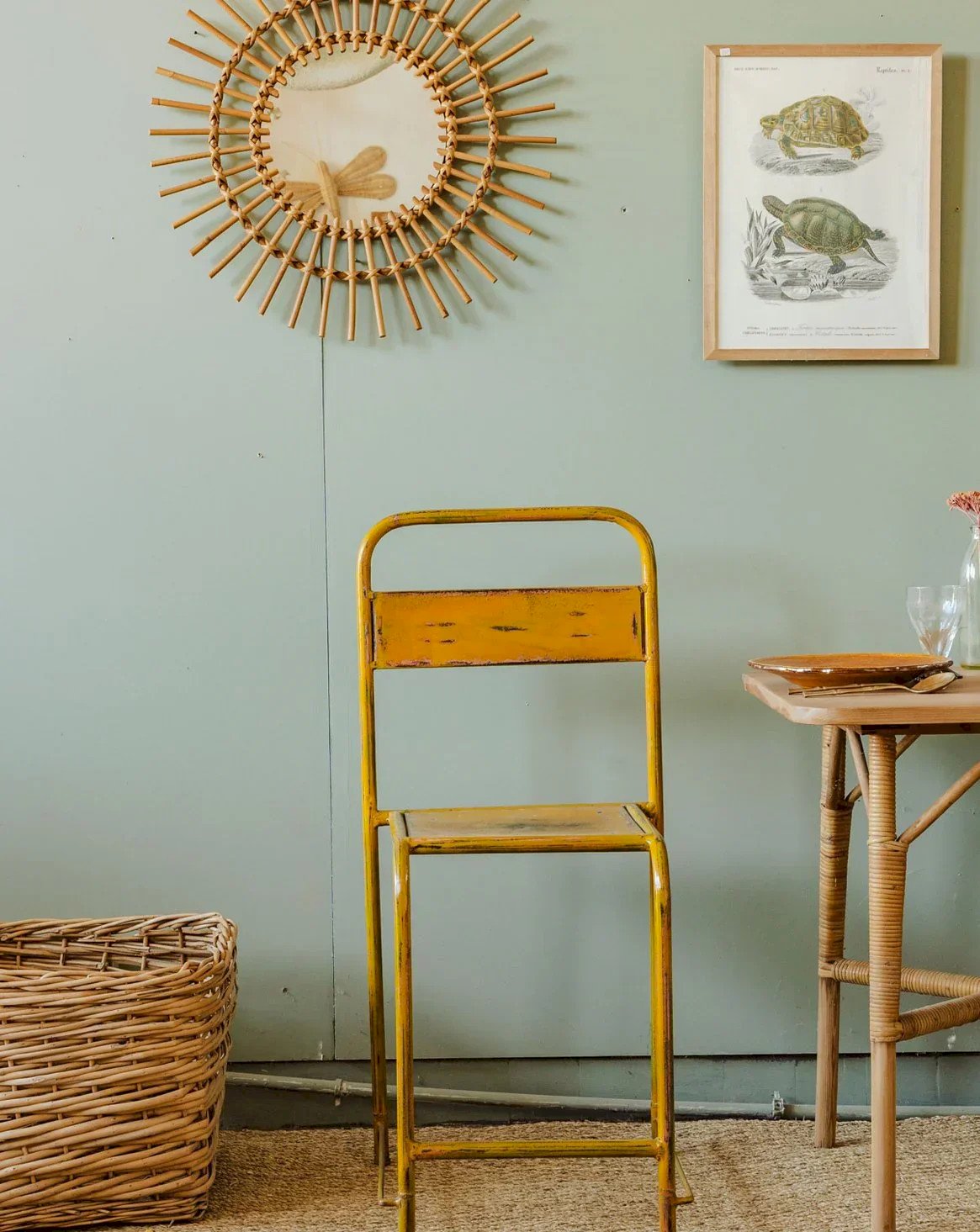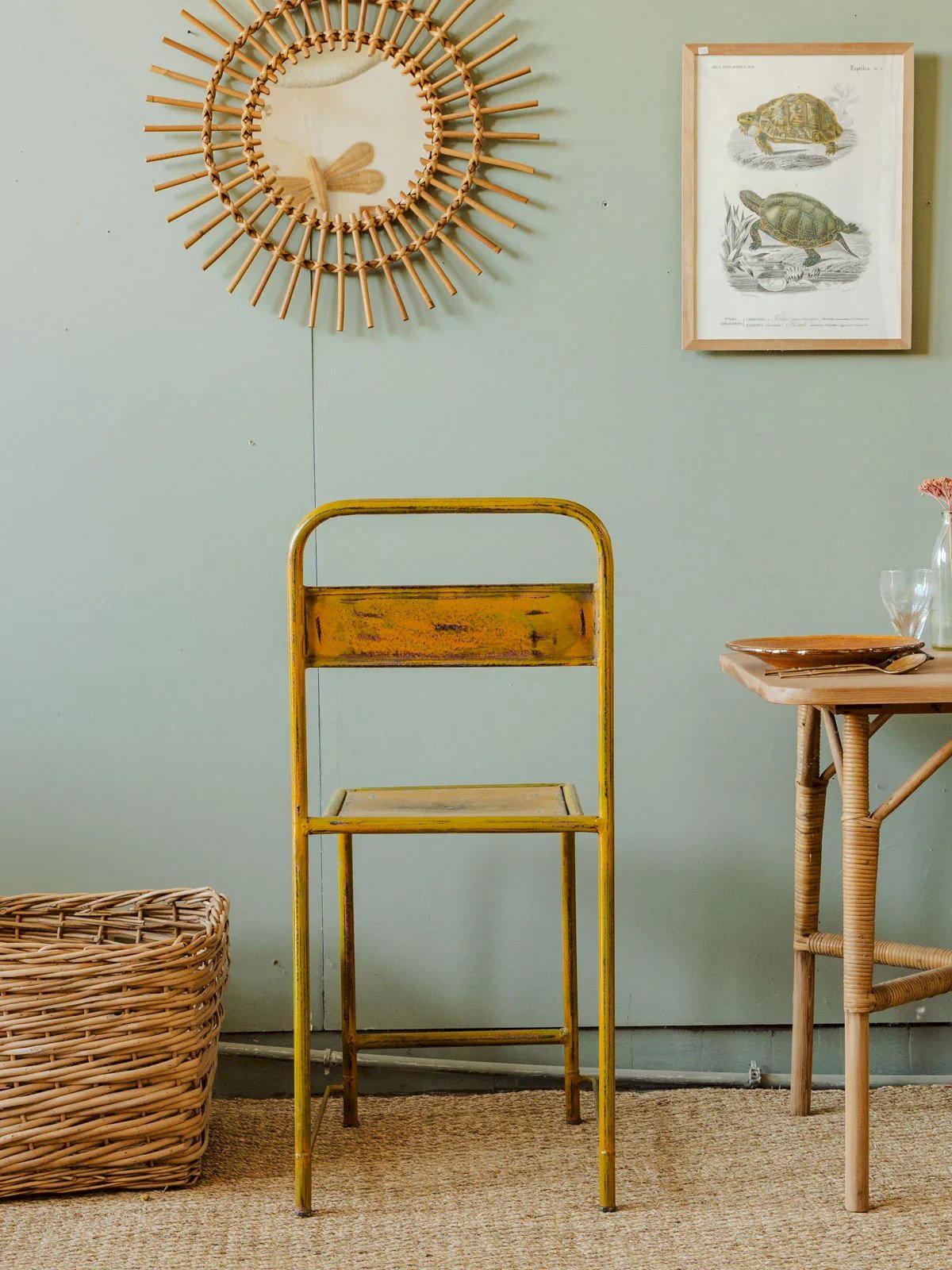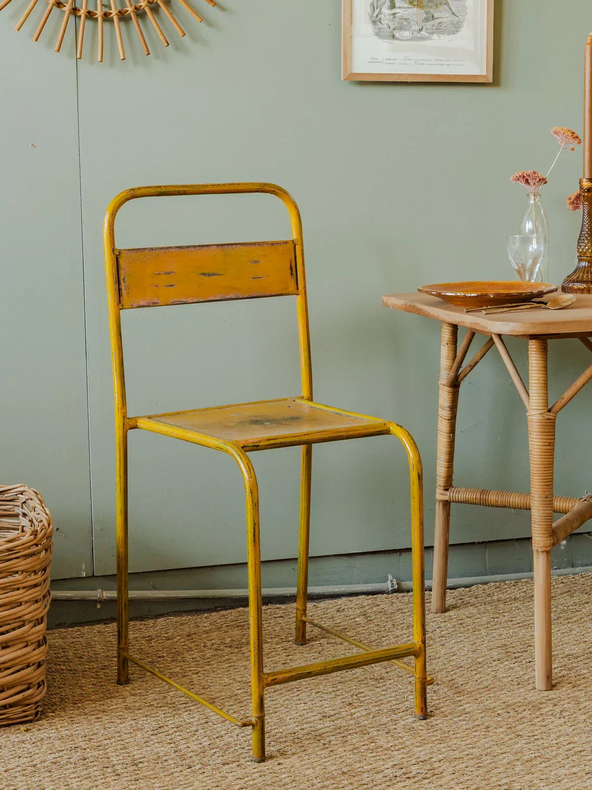 Adopt this distressed yellow chair with vintage style, made of metal, which adds an industrial and bright touch to a kitchen, an office, or a covered terrace. Its compact size and balanced proportions ensure a stable seat that is easy to move, while the slightly aged finish tells a warm story; it perfectly complements contemporary or bohemian interiors, combining raw materials and soft colors. There is a manufacturing hole on the seat. Length: 32 cm Width: 38 cm Height: 84.5 cm Seat Depth: 32 cm Niche Height: 46.5 cm Condition: Used: Item has been used. Item shows some superficial signs of wear, ...Used: Item has been used. Item shows some superficial signs of wear, fully operational and functioning correctly. It may be a display model or an item returned to the store after a short period of use with potential imperfections. Color: Multicolor Height: Metal Width: Chairs Brand: Debongout Type: Thrifted Product Material: Metal Style: Country