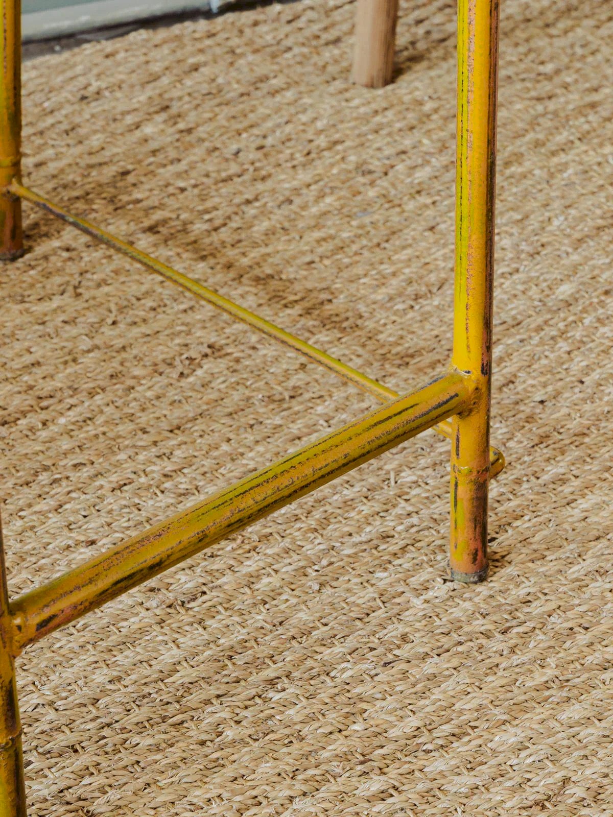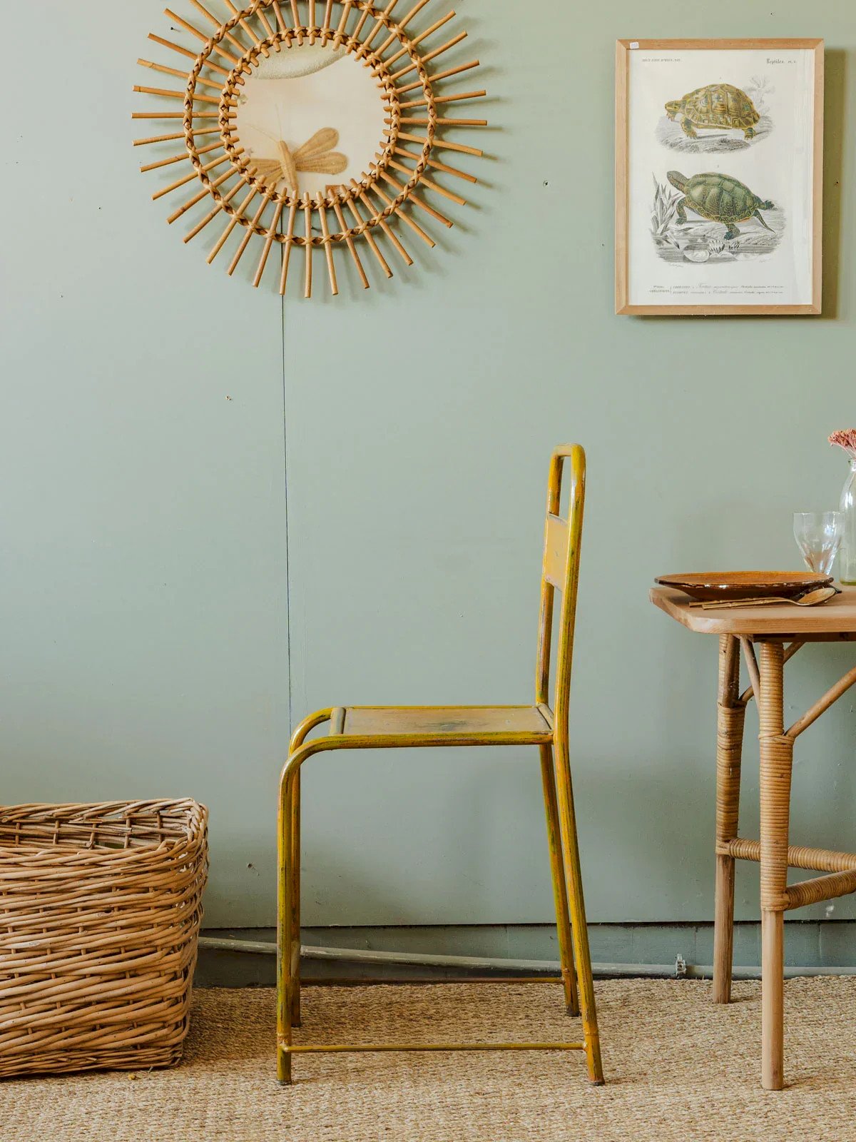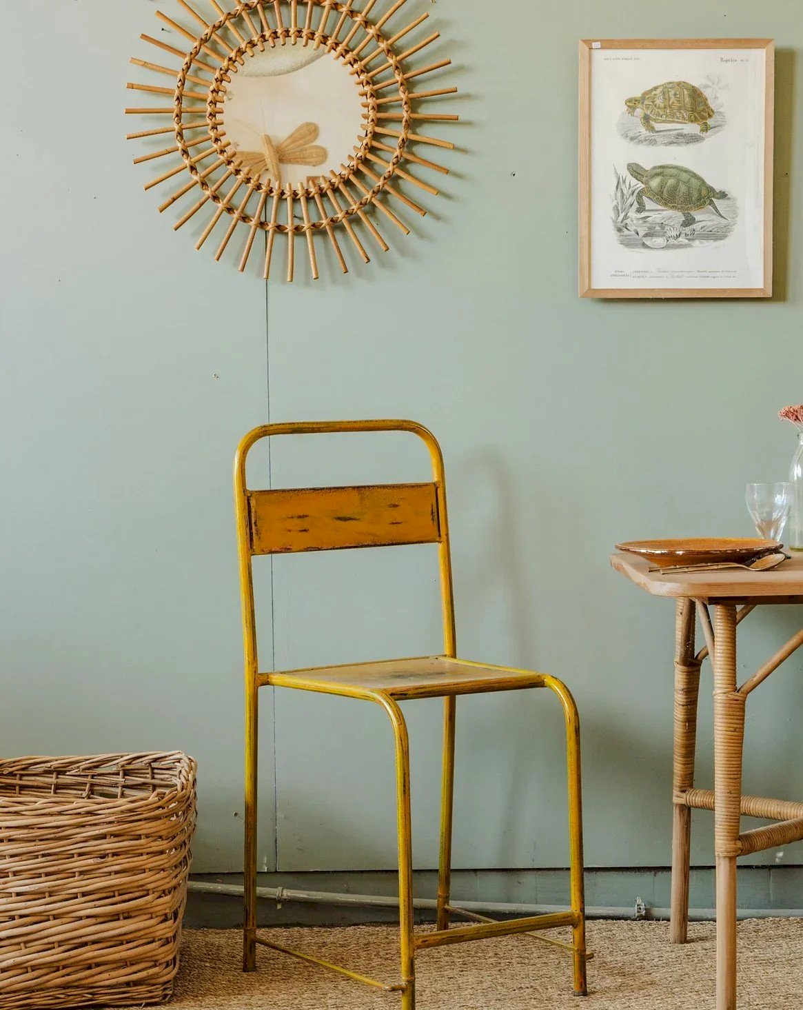Adopt this distressed yellow chair with vintage style, made of metal, which adds an industrial and bright touch to a kitchen, an office, or a covered terrace. Its compact size and balanced proportions ensure a stable seat that is easy to move, while the slightly aged finish tells a warm story; it perfectly complements contemporary or bohemian interiors, combining raw materials and soft colors. There is a manufacturing hole on the seat. Length: 32 cm Width: 38 cm Height: 84.5 cm Seat Depth: 32 cm Niche Height: 46.5 cm Condition: Used: Item has been used. Item shows some superficial signs of wear, ...Used: Item has been used. Item shows some superficial signs of wear, fully operational and functioning correctly. It may be a display model or an item returned to the store after a short period of use with potential imperfections. Color: Multicolor Height: Metal Width: Chairs Brand: Debongout Type: Thrifted Product Material: Metal Style: Country