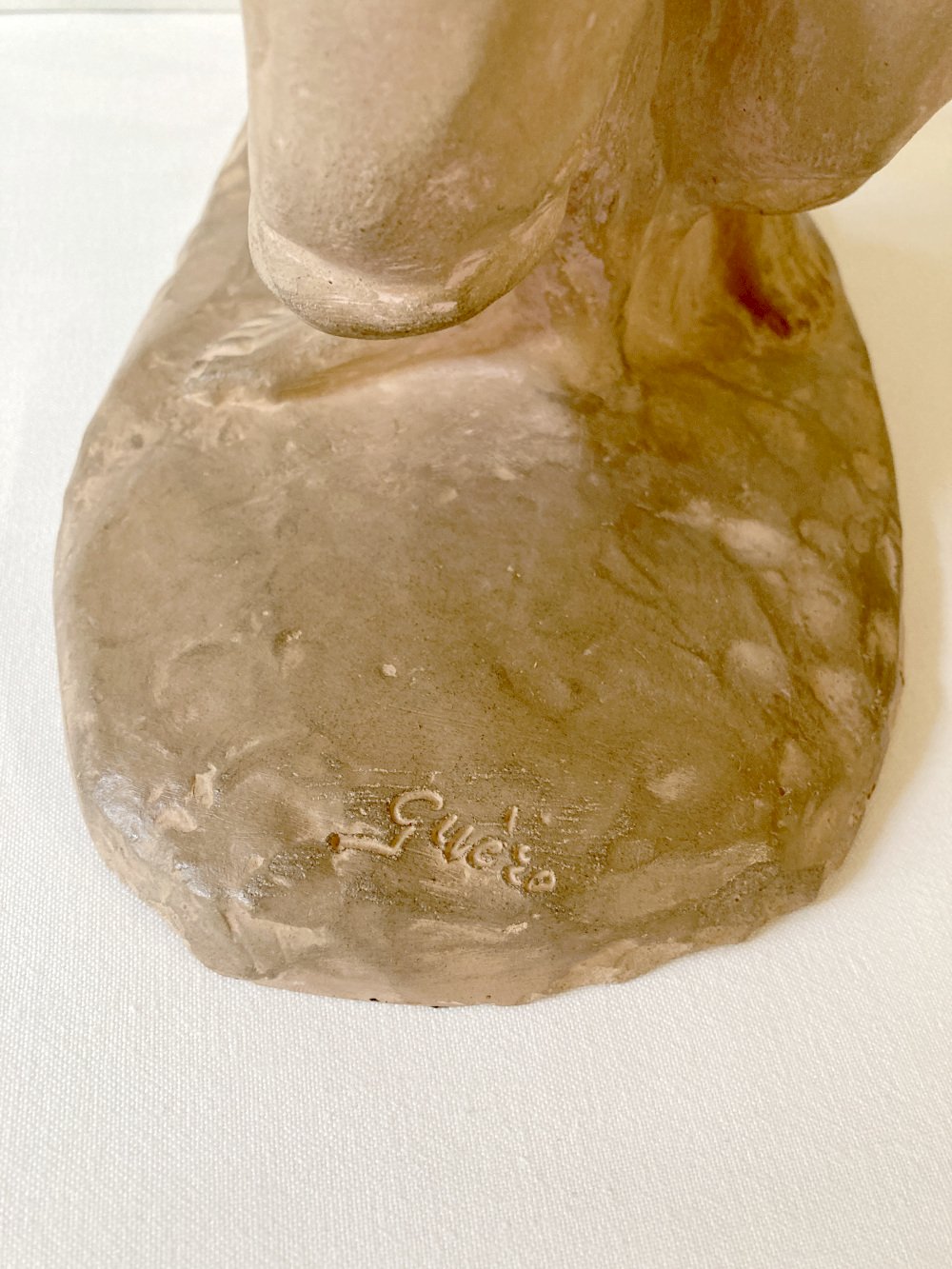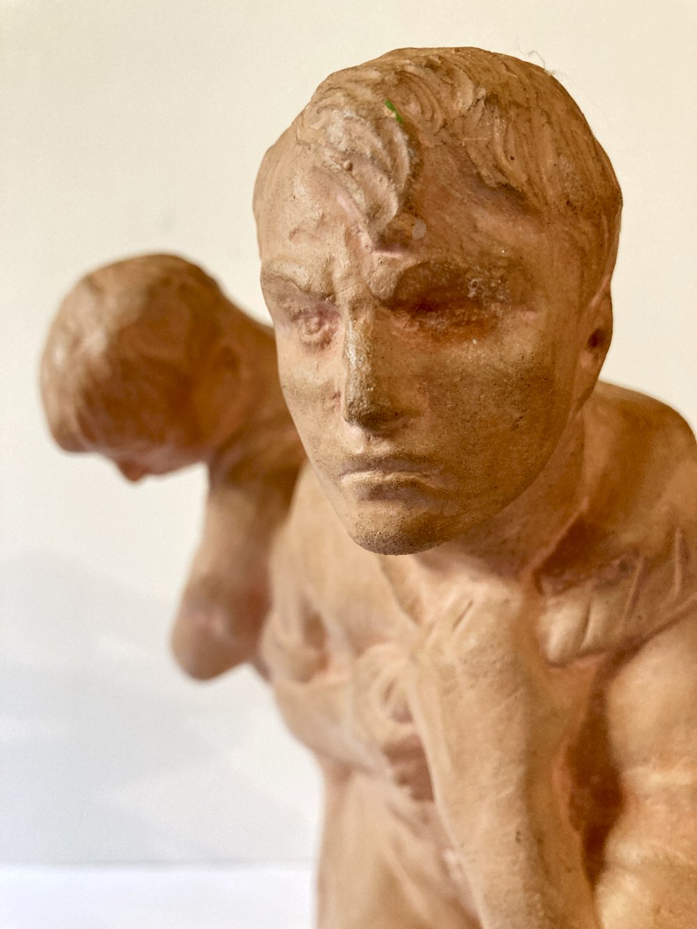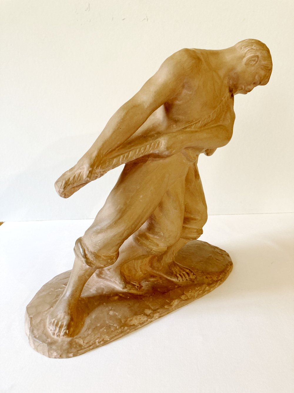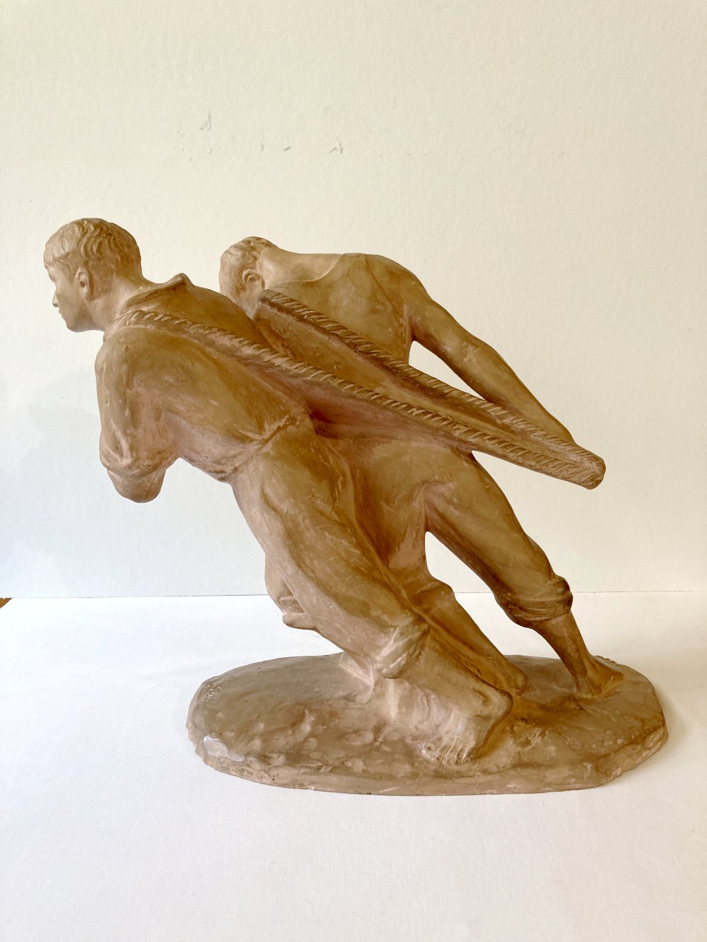 Molded terracotta sculpture, "The Haulers" by J.C. Guéro. 1920s-1930s. Guéro is known for depicting the trades of his time, showcasing physical and laborious tasks. His artistic talent accurately and sensitively captures the gestures and expressions of men (and women) during their work. He also created a superb portrait of Beethoven. This is a large-scale version of the model, in perfect condition. The sculpture is signed on its base (in photo).