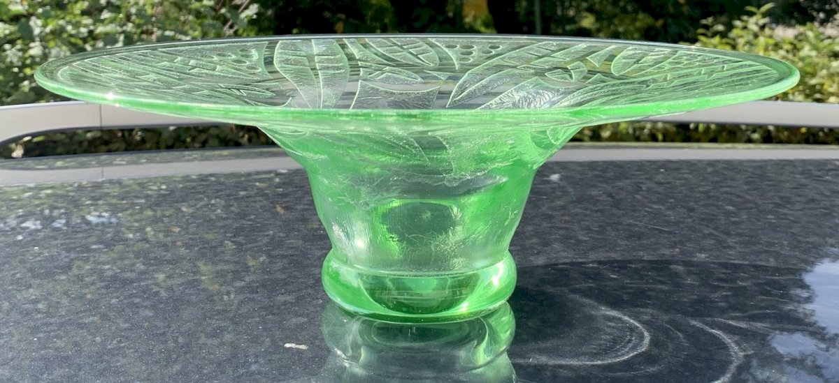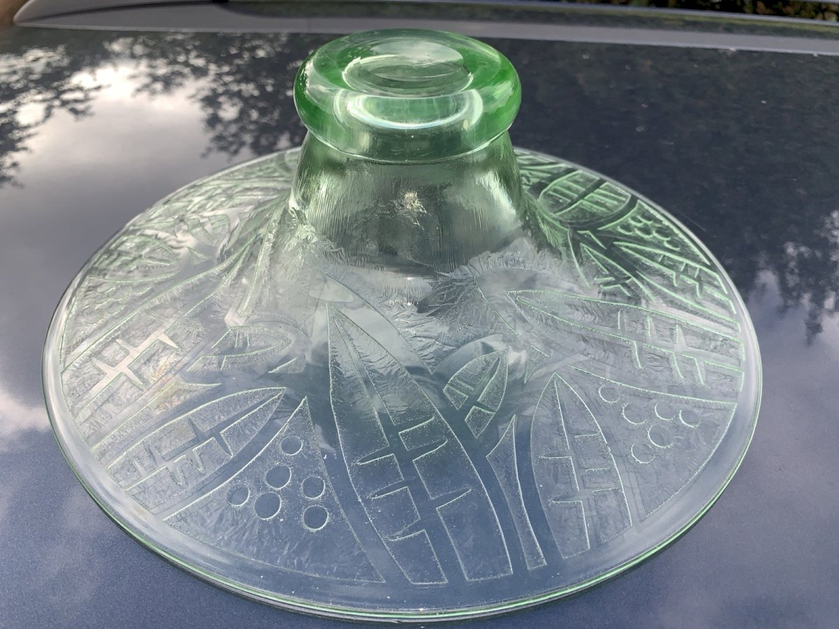 Fains Glass Signed Superb Art Deco period bowl Acid-etched glass Stylized patterns The base is made of ouraline Excellent condition Diameter: 30.8cm Height: 10.7cm Weight: 1270 grams