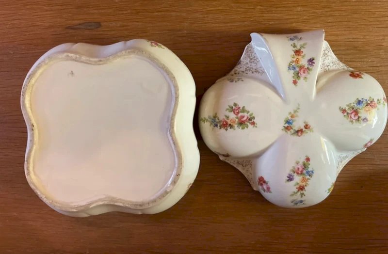 Bonbonniere / porcelain jewelry box, flower decor, clover shape