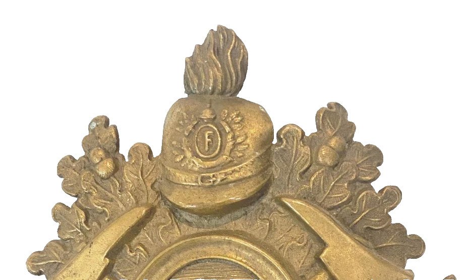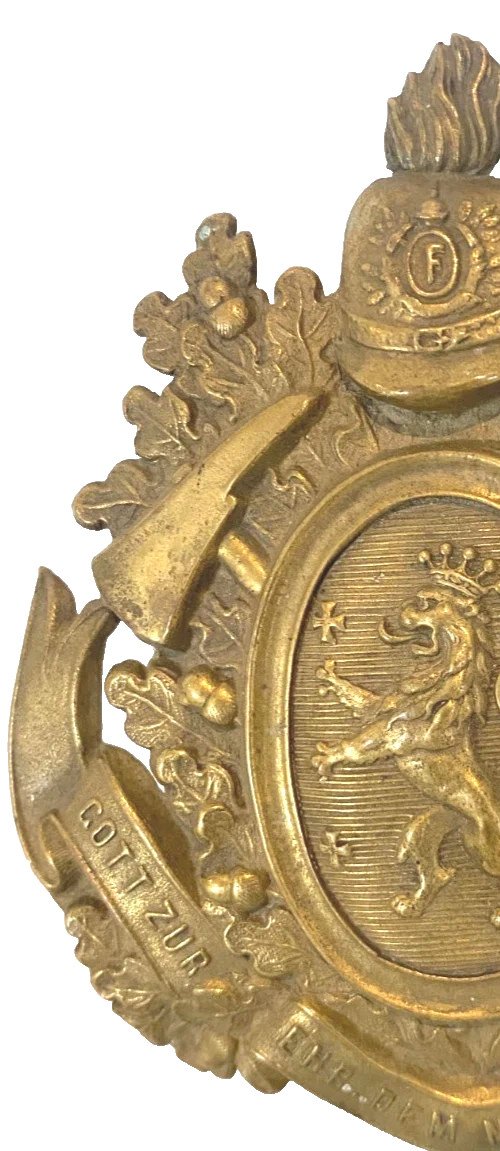 Brass embossed coat of arms crowned with a helmet The central medallion features a crowned lion Good condition Dimensions H 11 x L 9 cm XX century Type: Showcase object, Decorative Period: 20th century Design Origin: France Height: 11 Material: Brass Length: 9