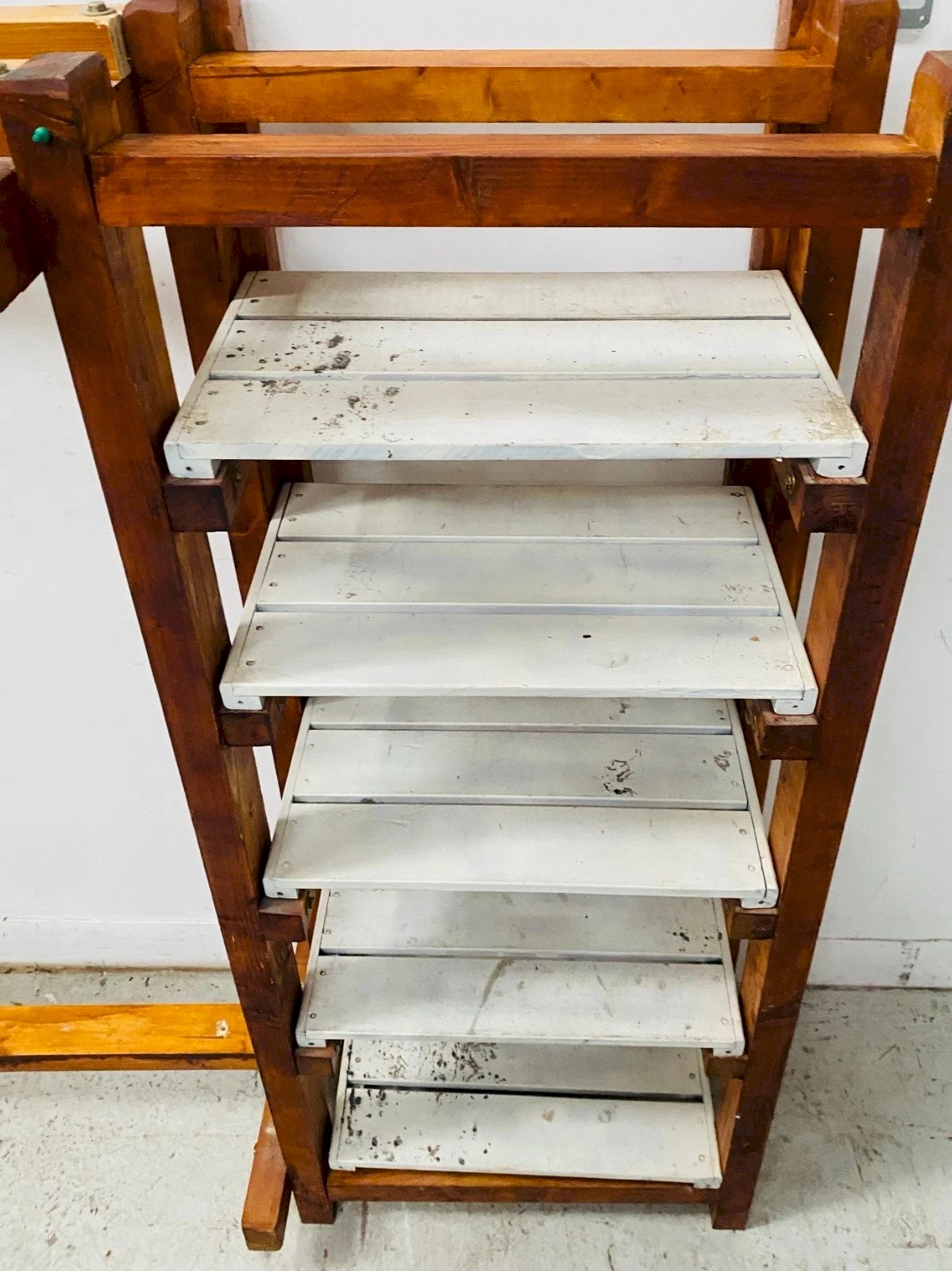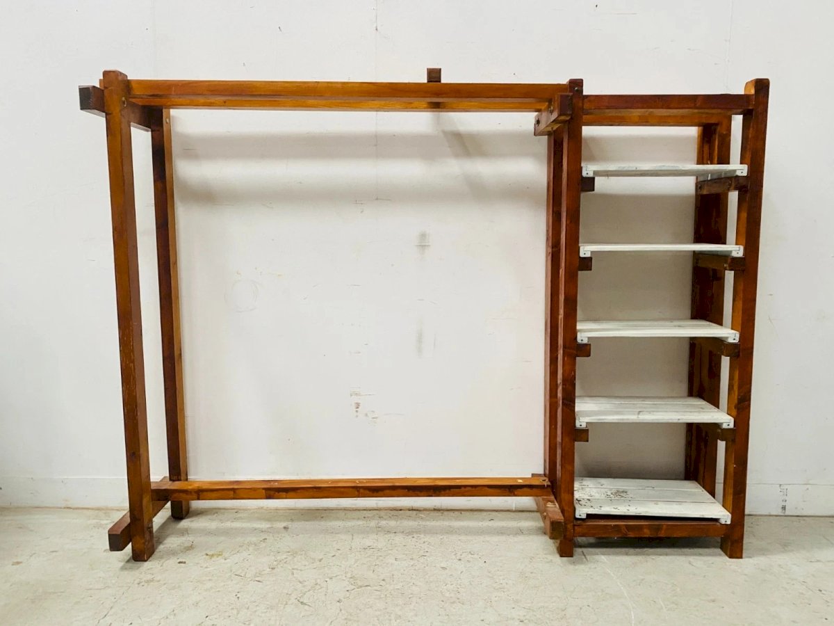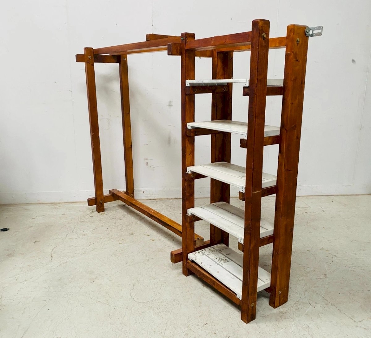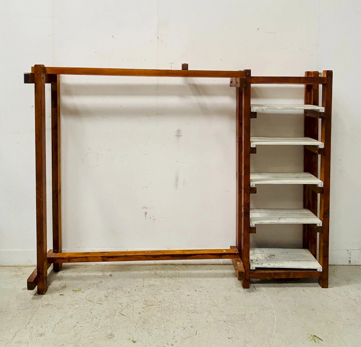 Coat rack made of solid spruce A stand and a row of shelves Good condition Dimensions H 152 x L 200 x 35 cm 20th century Type: Clothing rack Origin: France Height: 152 Length: 200 Width: 35
