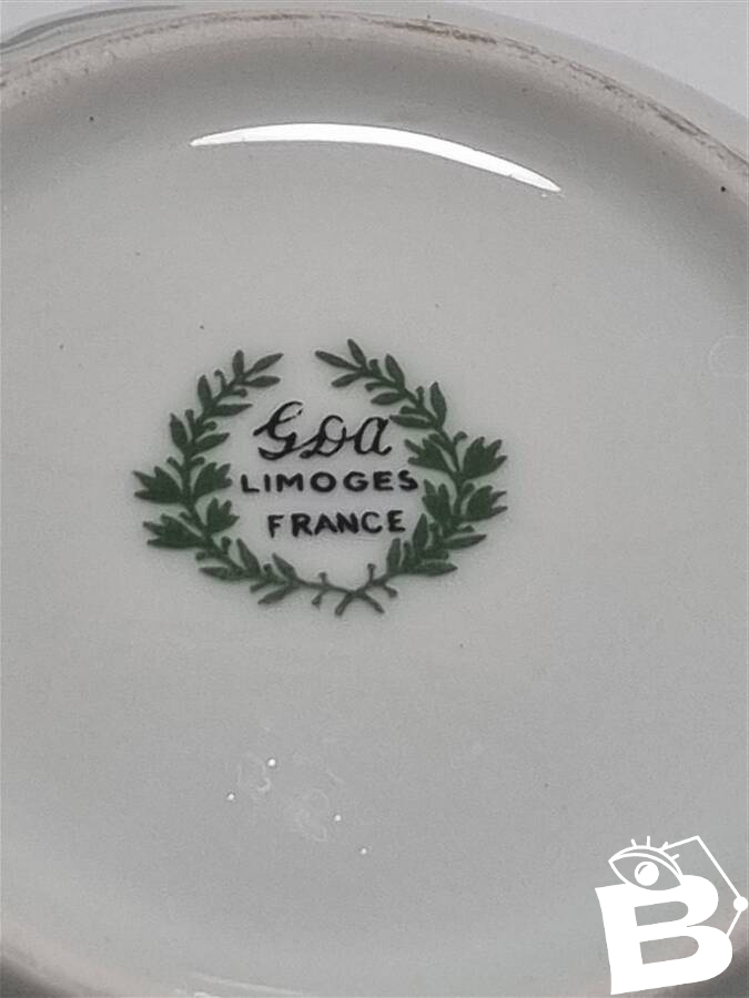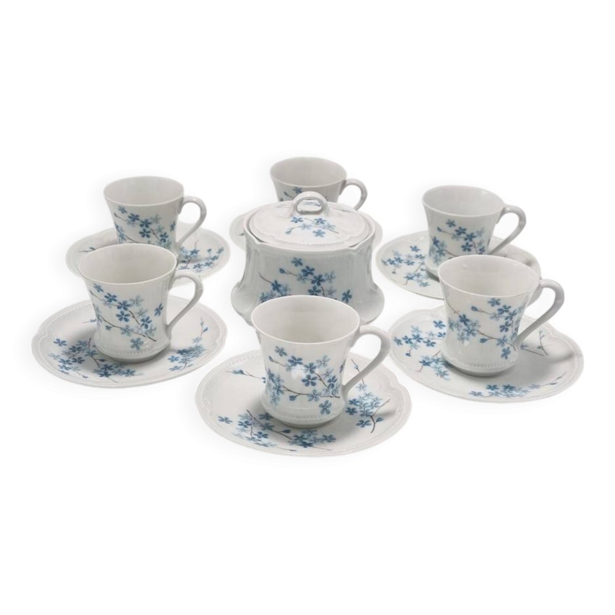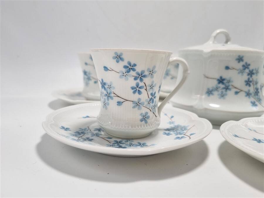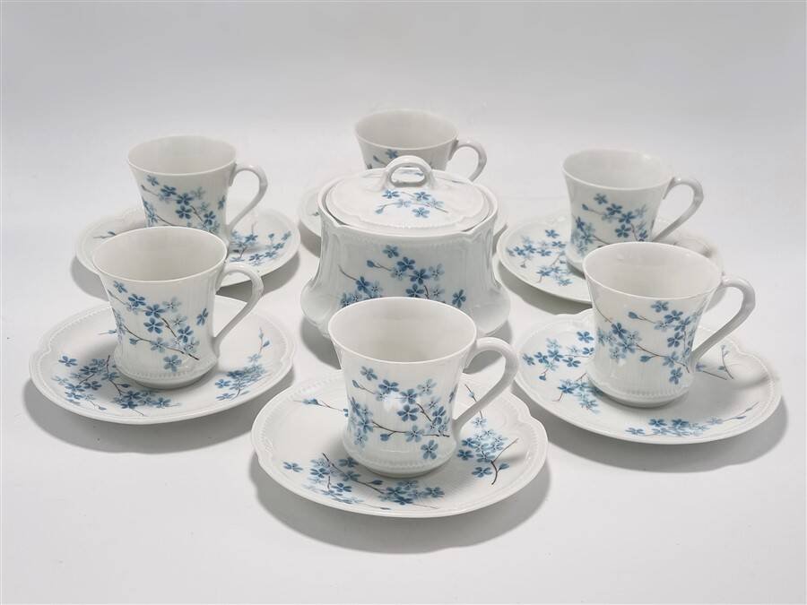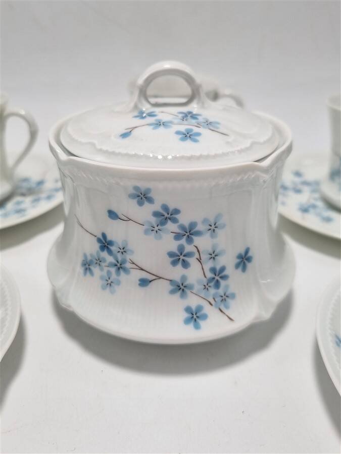 White porcelain service with blue forget-me-not decoration, 6 cups, their saucers, and a sugar bowl. Dimensions of the cups: 6.3 X 6.3 cm. Diameter of the saucers: 13 cm. Dimensions of the sugar bowl: 11 X 8 cm. Weight: approximately 1 kg. L: 6 W: 6 H: 6