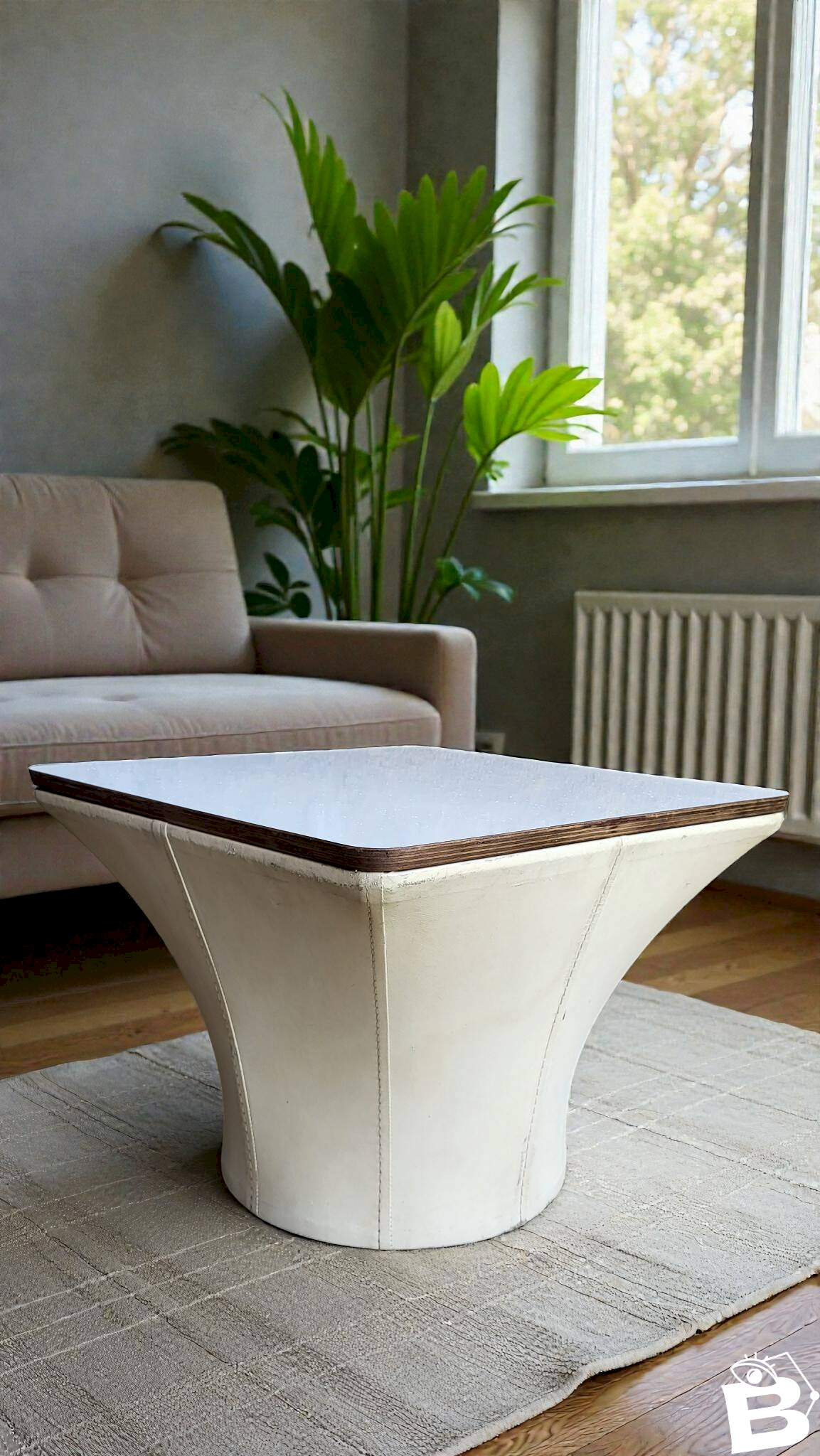 Mushroom end table by Bernard Brunier / 1960s / white melamine top, Ionic legs wrapped in off-white leather/Alcantara. The product is of good quality / handcrafted. It is noted to be in good used condition with signs of wear and age. A restoration on one of the tables is visible in the photo. The two are not completely identical. One is entirely made of leather and the other is composed of leather and presumably alpaca skin, which accounts for the variation in color. The tops are in good condition. Dimensions H37 X W51 X D51. L: 51 W: 51 H: 37