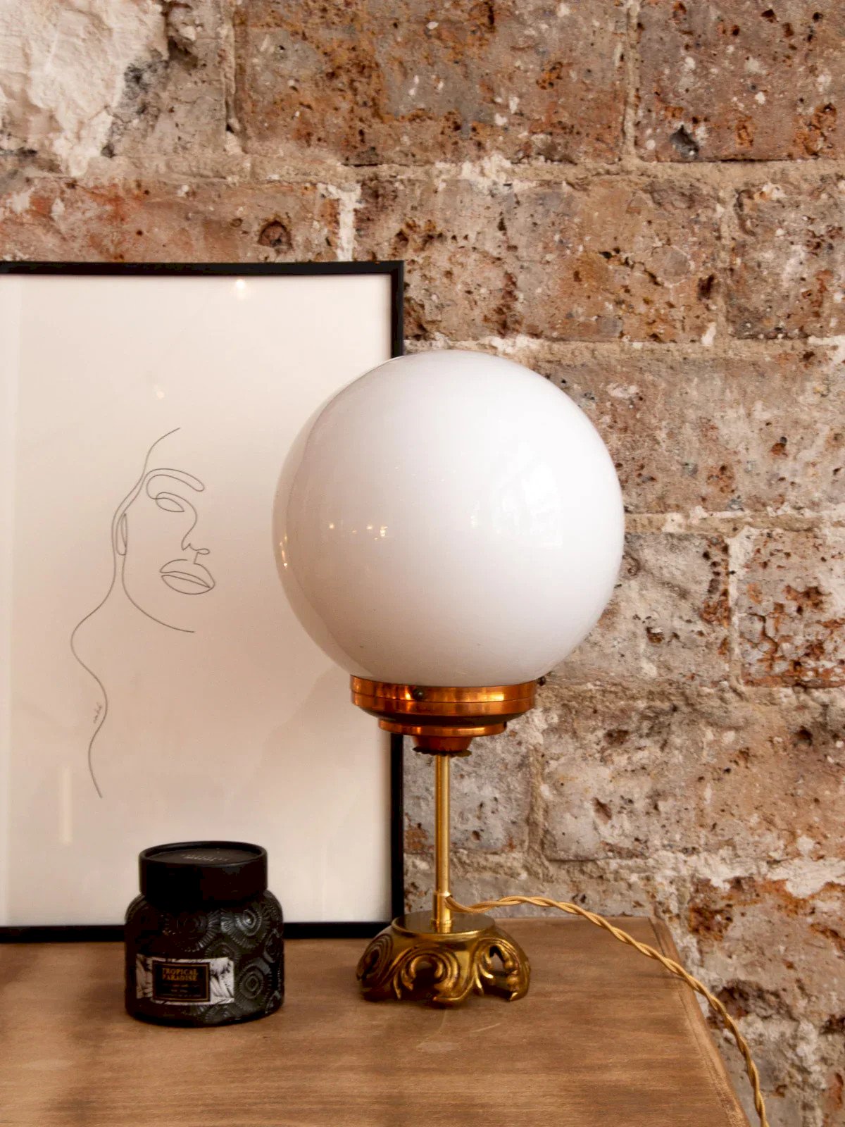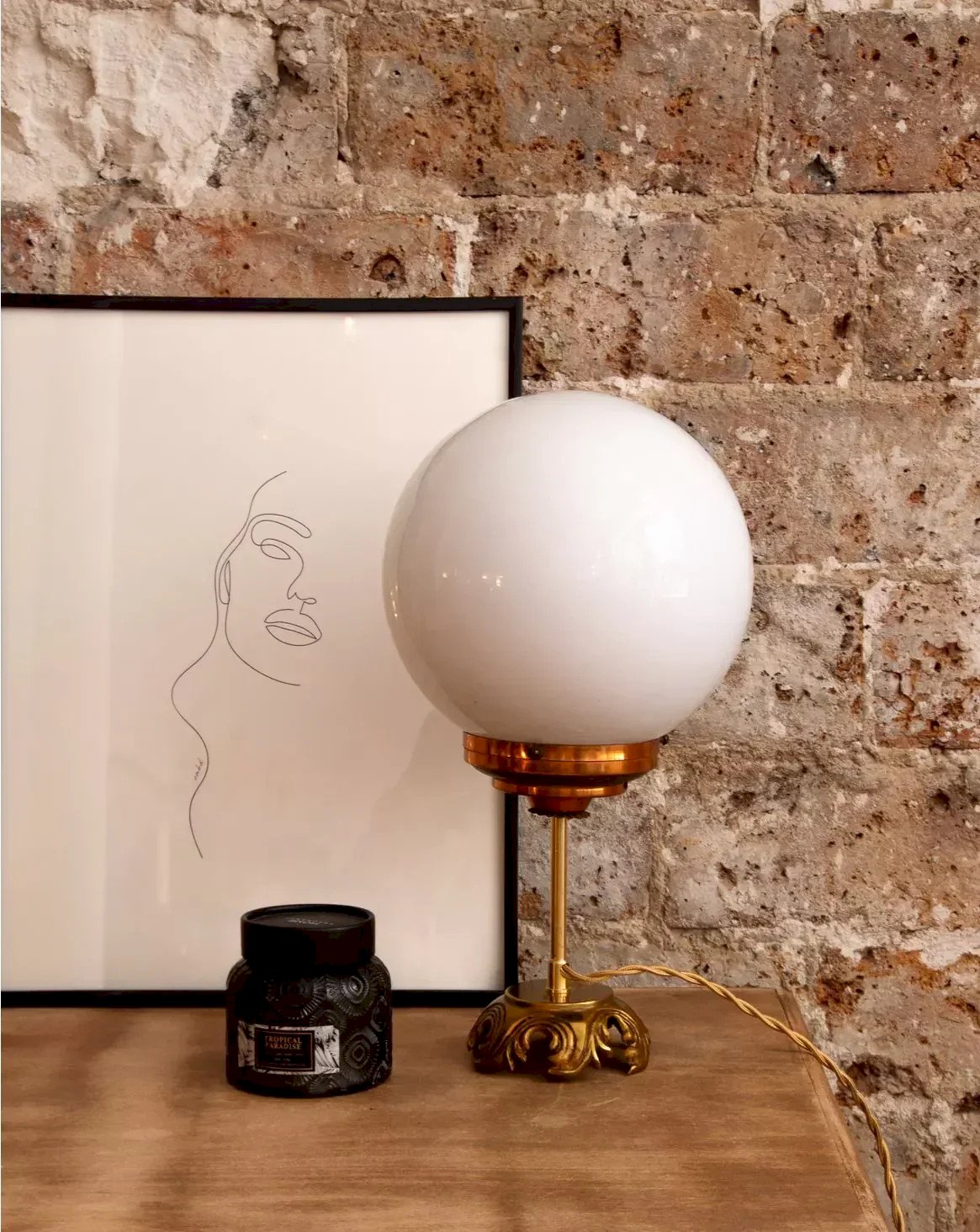 Our upcycled lamps are all unique and different! Each glass globe and brass base is sourced, then renovated and assembled by hand by our artisan in Auvergne. The electrical system is also renewed. The little vintage and sophisticated touch is perfect for styling a bedroom or living room, adding charm to your interior. The added bonus is a lovely braided cord that doesn’t need to be hidden! We love this Colette for its original brass base. Use a filament bulb that offers a low-intensity yellow light for a lovely brightness that will highlight your Colette. Sold without a bulb. Width: 20 cm Height: 36 cm Condition: Used: Item that has been used. Item showing some superficial signs of wear... Used: Item that has been used. Item showing some superficial signs of wear, fully operational and functioning correctly. It may be a demonstration model or an item returned to the store after a short period of use. Any imperfections. Brand: Debongout Type: Sourced product Style: Country Material: Brass, Glass Vintage: Yes
