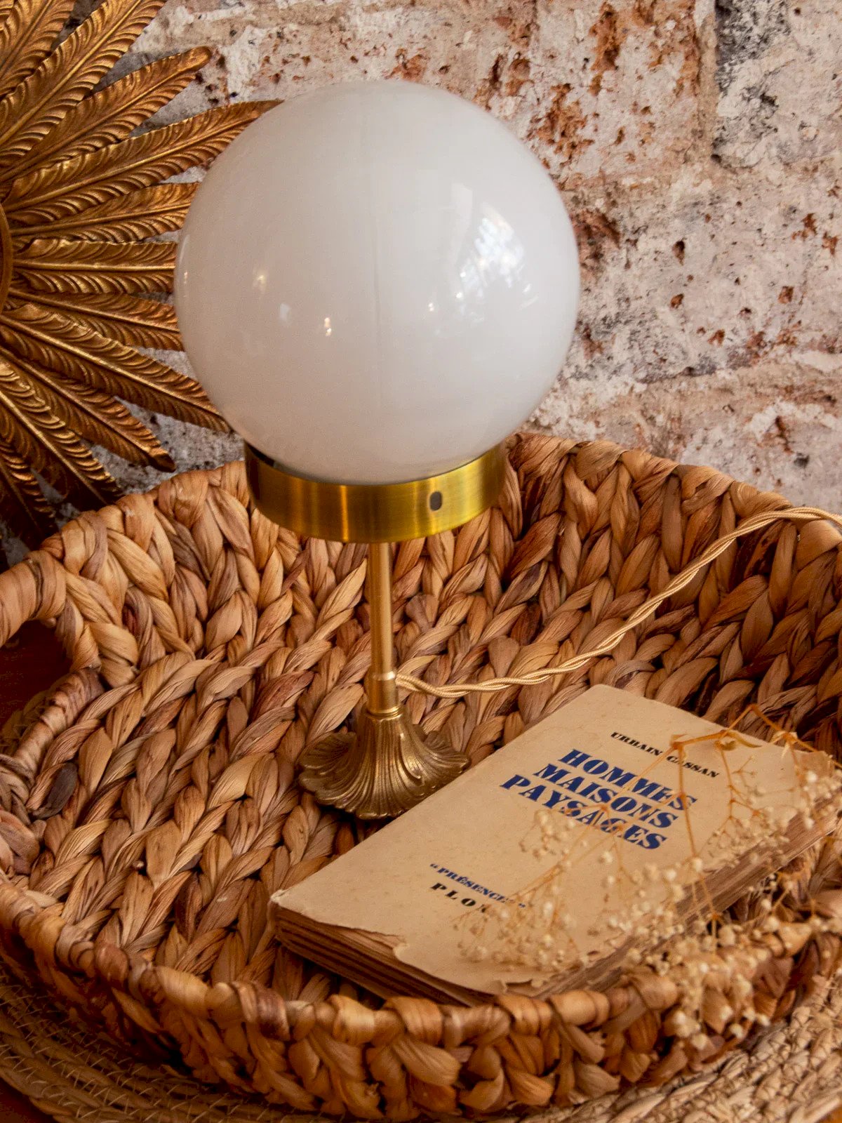 Our upcycled lamps are all unique and different! Each glass globe and brass base is sourced, then renovated and assembled by hand by our artisan in Auvergne. The electrical system is also refurbished. The small vintage and sophisticated touch is perfect for styling a bedroom or living room, adding charm to your interior. The bonus is a lovely braided cord that doesn't need to be hidden! We love this Colette for its engraved base with fine lines in golden brass. Use a filament bulb that offers a warm yellow light for a beautiful glow that will highlight your Colette. Sold without a bulb. Width: 14 cm Height: 29 cm Condition: Used: Item that has been used. Item showing some superficial signs of wear... Used: Item that has been used. Item showing some superficial signs of wear, fully operational and functioning correctly. It may be a display model or an item returned to the store after a short period of use. any potential flaws. Brand: Debongout Type: Sourced product Style: Country Material: Glass, Brass Vintage: Yes