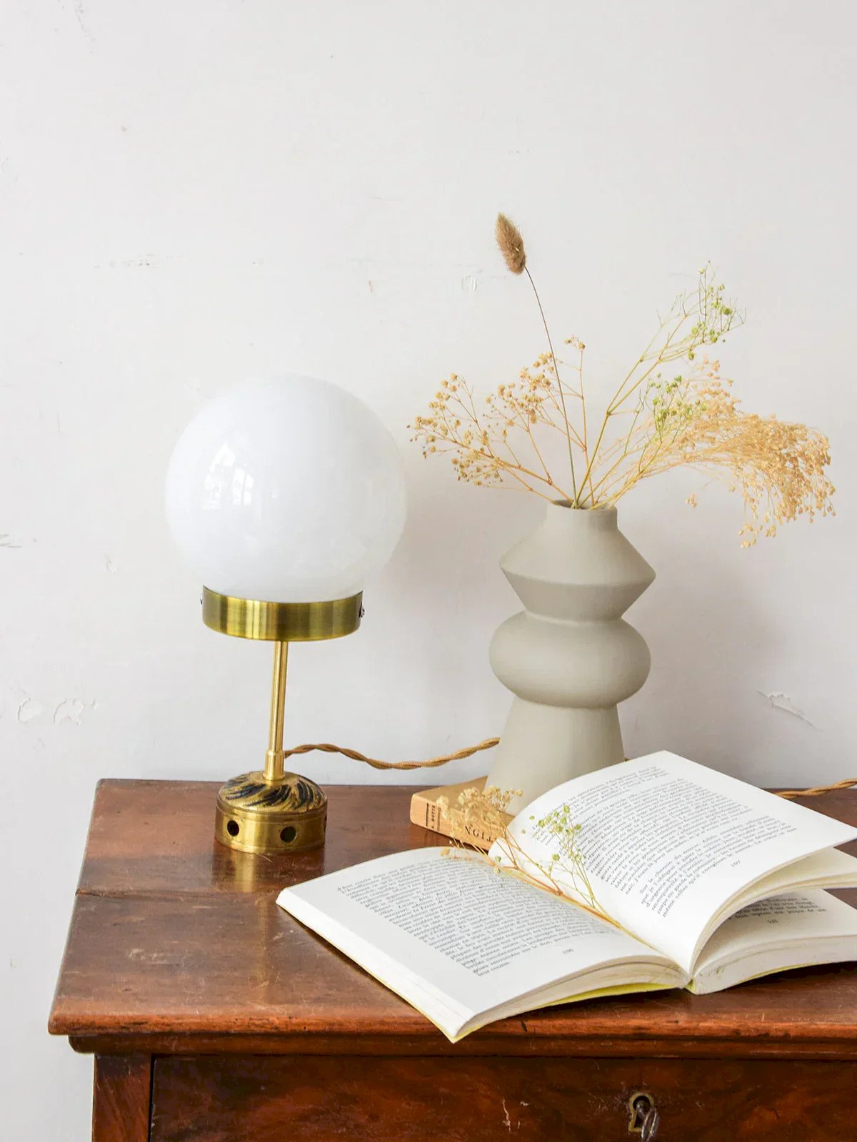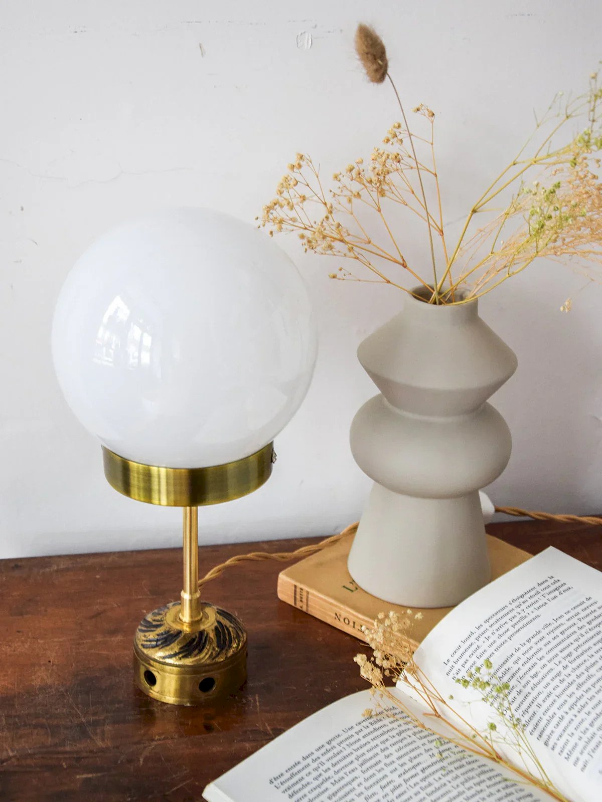 Illuminate your interior with the Colette lamp, a unique upcycled piece that combines elegance and craftsmanship. Every element, from the glass globe to the brass base, is meticulously sourced, renovated, and handmade in Auvergne, ensuring unmatched quality. The refurbished electrical system guarantees safe use, while the braided cord adds a touch of sophistication. With its bright white globe, the Colette lamp is perfect for enhancing the style of your bedroom or living room. Height: 30 cm Diameter: 15 cm Condition:Used: Item that has been used. Item shows some signs of superficial wear, ...Used: Item that has been used. Item shows some signs of superficial wear, fully operational and functioning correctly. It may be a display model or an item returned to the store after a short period of use. any possible imperfections. Brand: Debongout Type: Curated product Style: Country Material: Glass, Brass Vintage: Yes
