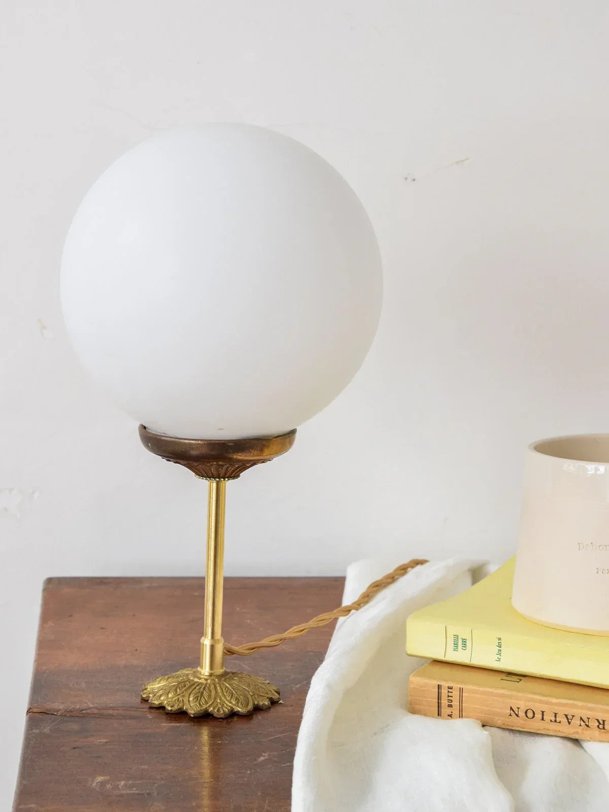 Discover our upcycled lamps, true unique pieces that will add a touch of elegance to your interior. Each glass globe and brass base is carefully sourced, renovated, and handcrafted by our artisan in Auvergne, ensuring authentic craftsmanship. The electrical system is completely refurbished for safe use. Enjoy the detail of the pretty braided cord, which enhances the whole without needing to be hidden. The Colette lamp, with its bright white globe, is ideal for stylishly elevating your bedroom or living room. Height: 29 cm Diameter: 16 cm Condition: Used: Item has been used. Item shows some superficial signs of wear...Used: Item has been used. Item shows some superficial signs of wear, fully operational and functioning correctly. It may be a display model or an item returned to the store after a short period of use. any possible imperfections. Brand: Debongout Type: Curated product Style: Country Material: Glass, Brass Vintage: Yes