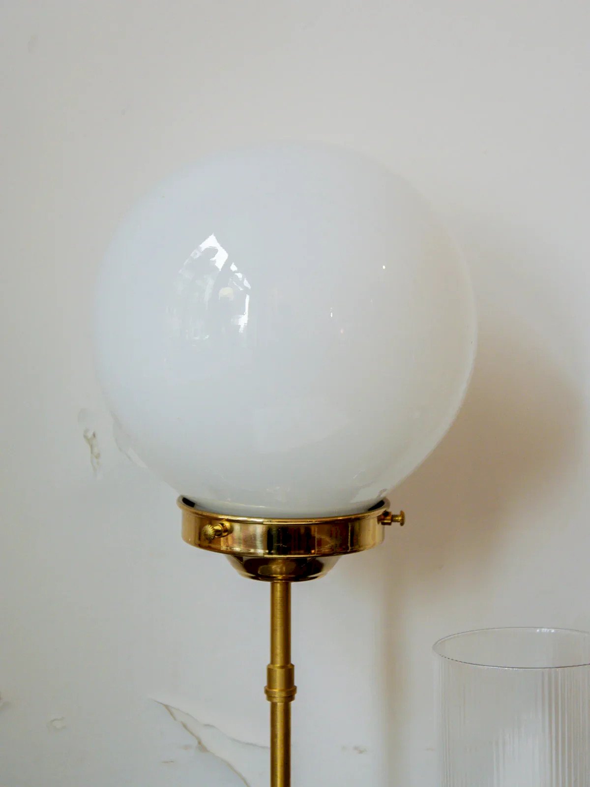 Discover our upcycled lamps, true unique pieces that will add a touch of elegance to your interior. Each glass globe and brass base is carefully sourced, renovated, and hand-assembled by our artisan in Auvergne, ensuring authentic craftsmanship. The electrical system has been refurbished for safe use. Appreciate the detail of the pretty braided cord, which enhances the whole without needing to be hidden away. Elegant and timeless, the Colette lamp combines a brass base with a round white globe that has a glossy effect, diffusing a soft and warm light to enhance your interior. Height: 36 cm Diameter: 16 cm Condition: Second-hand: Item that has been used. Item showing some superficial signs of wear, fully operational and functioning correctly. It may be a demonstration model or an item returned to the store after a short period of use, including any possible imperfections. Brand: Debongout Type: Vintage Product Style: Country Material: Glass, Brass Vintage: Yes