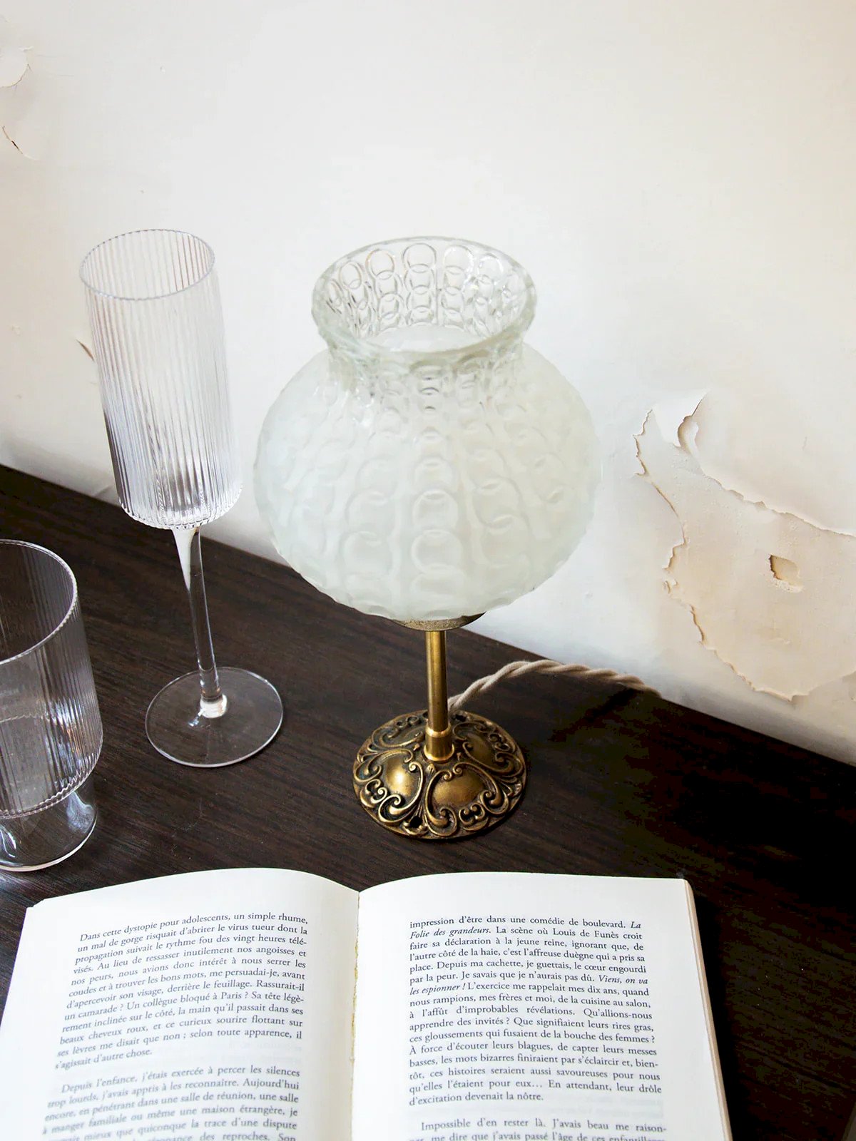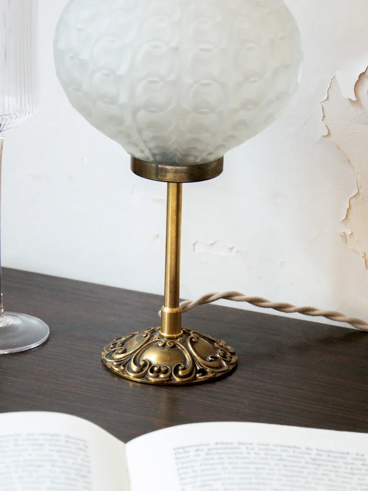 Discover our upcycled lamps, true unique pieces that will add a touch of elegance to your interior. Each glass globe and each brass base are carefully sourced, restored, and handcrafted by our artisan in Auvergne, ensuring authentic craftsmanship. The electrical system has been refurbished for safe use. Enjoy the detail of the pretty braided cord, which enhances the whole without needing to be hidden. Elegant, the Colette lamp combines a brass base with a transparent matte-finished globe, featuring a top opening and adorned with delicate details for a subtle and soothing light. Height: 27 cm Width: 13 cm Condition: Used: Item that has been used. Item showing some superficial signs of wear... Used: Item that has been used. Item showing some superficial signs of wear, fully operational and functioning correctly. It may be a display model or an item returned to the store after a short period of use, with possible imperfections. Brand: Debongout Type: Vintage find Style: Country Material: Glass, Brass Vintage: Yes