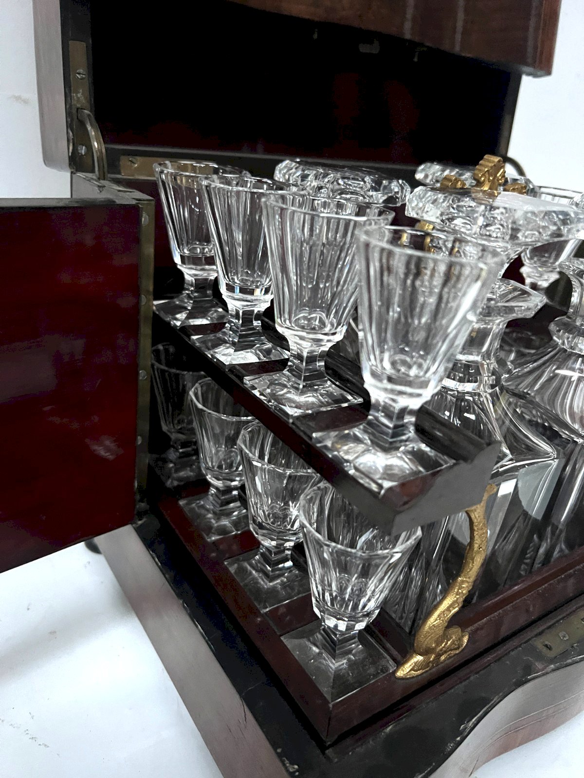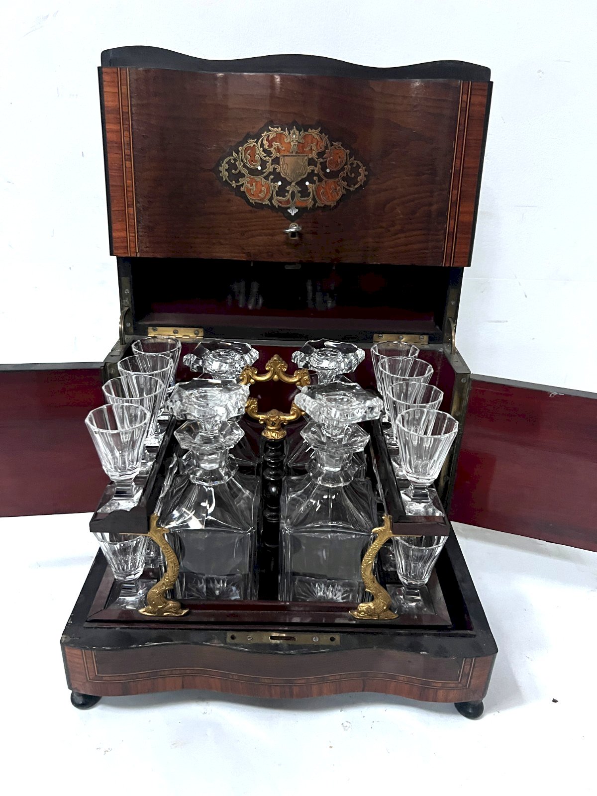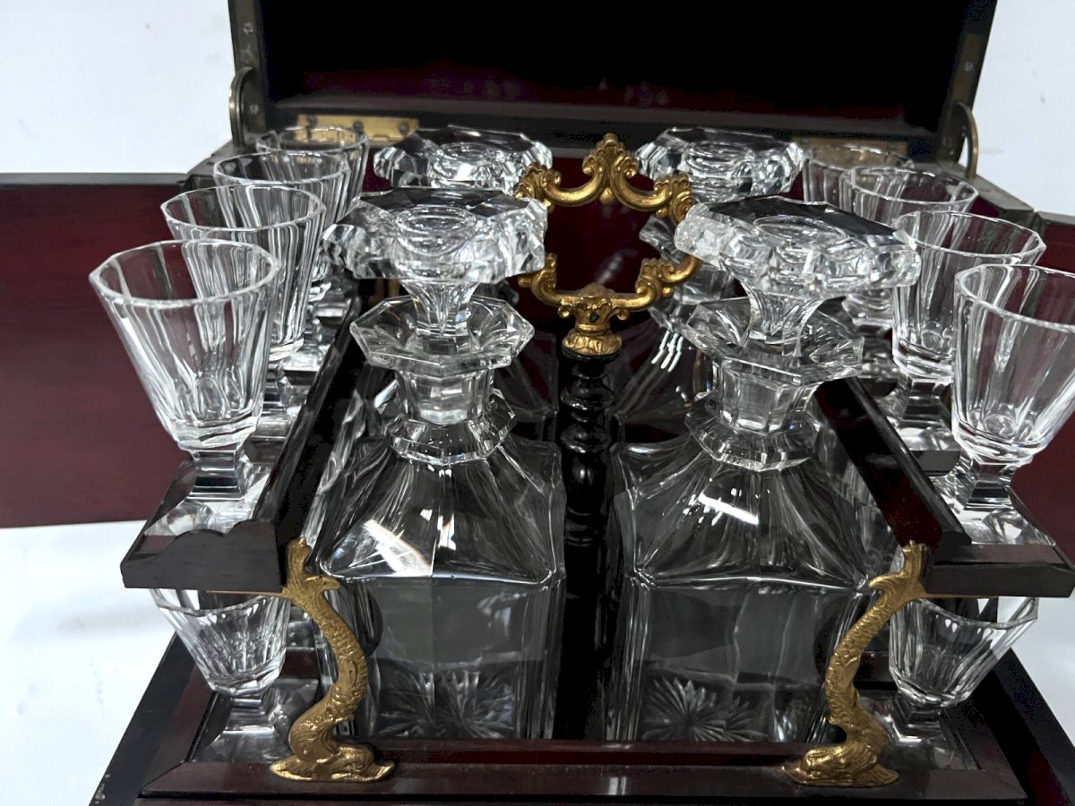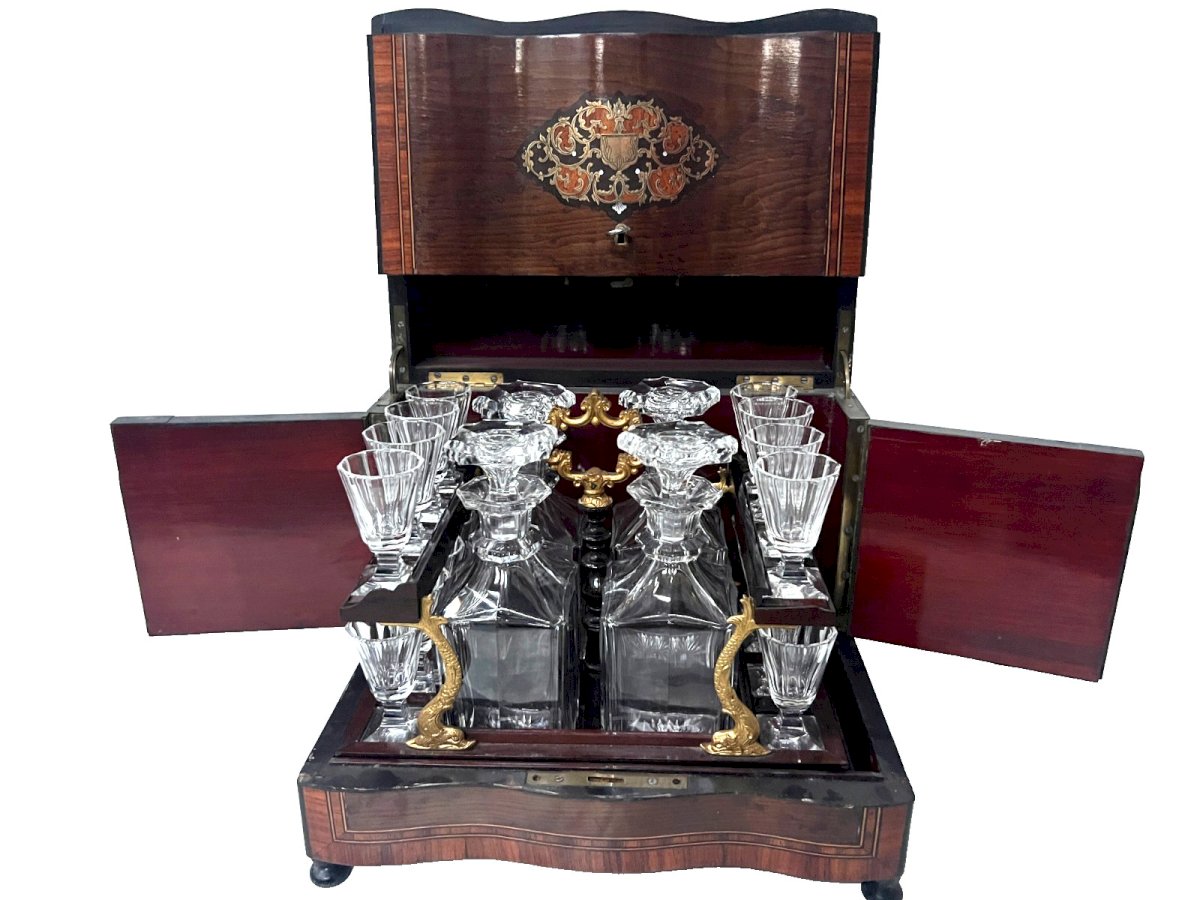 Very beautiful Napoleon III liquor cabinet. Box made of veneer from thuya burl. Mahogany interior. Two medallions in brass marquetry. Mahogany and gilded chased bronze tray. Four original decanters and 16 glasses. One restored crack at the top of the cabinet, see photos. Very good condition. Key and lock functional. 19th century period. Dimensions H 25 x L 31 x 22 cm. Type: Tableware, Kitchen Origin: France Sub-type: Box Country of origin: France Height: 33 Style: Napoleon III Material: Wood Length: 27 Width: 25