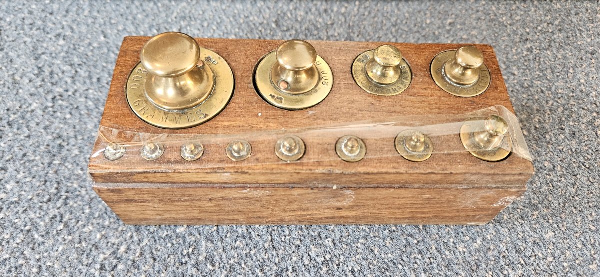For sale: complete set of 12 weights for Roberval scale, ranging from 1g to 500g. Wooden support in very good condition.