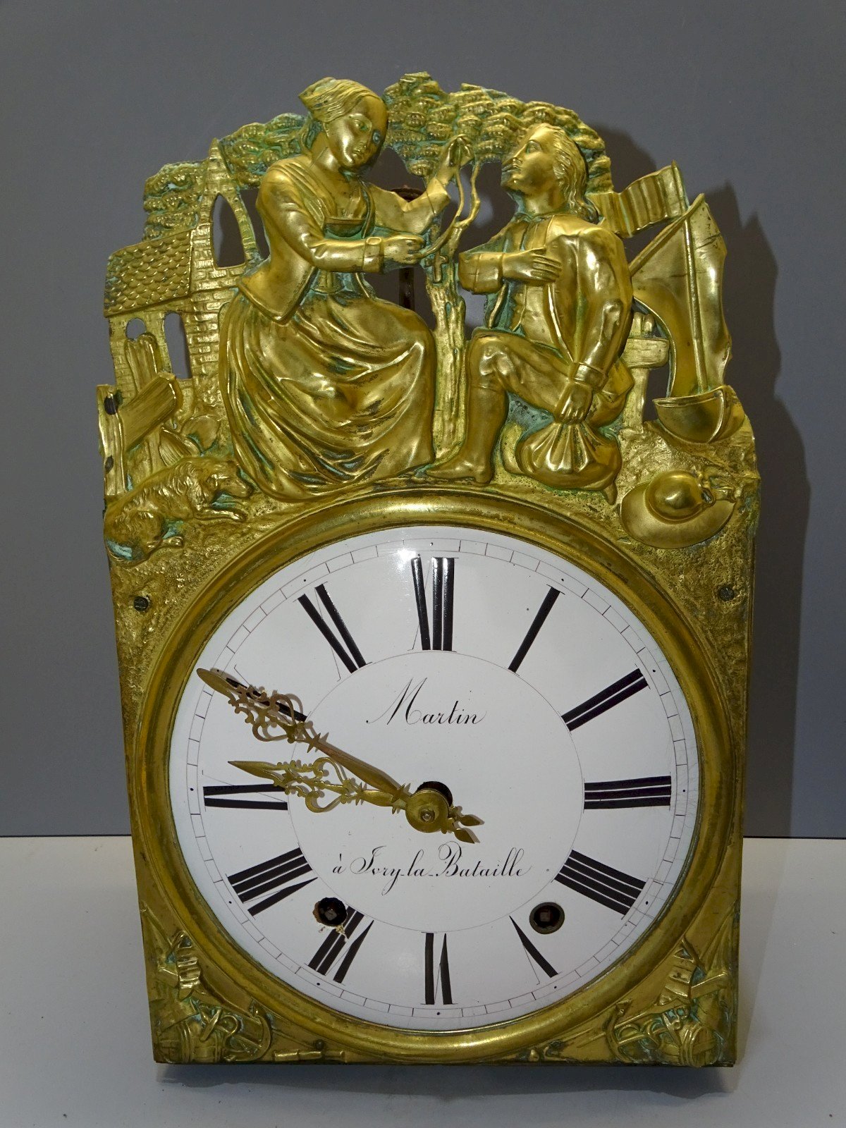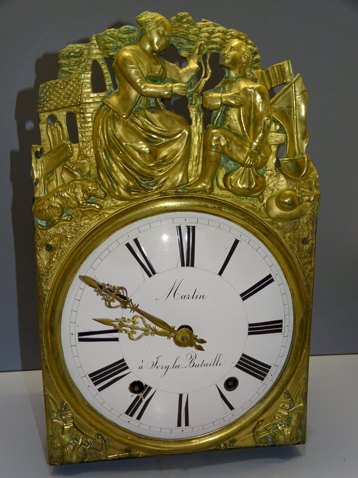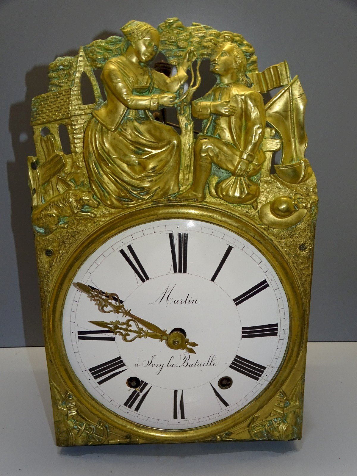 19th Century Comtoise Clock Movement, 8 days, marked Martin in Sorgy la Bataille - dial with small chipping and wear visible at the winding points as shown in the photos - missing the bell - in original condition from finds in good working order - Ref: 1V251219/82 Height 40 cm - Length 25 cm - Visible dial diameter 21.5 cm - Weight 3.900 kg SHIPPING POSSIBLE WITH MONDIAL RELAY or COLISSIMO upon request VERY GOOD PACKAGING GUARANTEED PLEASE carefully CHECK ALL PHOTOS as THEY are AN INTEGRAL PART of the DESCRIPTION and ALLOW you to SEE the OBJECT AT ITS BEST with ITS SMALL POSSIBLE DEFECTS - Color: Gold Type: Clock Movement Mechanism: Comtoise Sub-type: Mechanical Movement Style: Louis XV, Neoclassical Material: Metal and Brass Shape: Rectangular