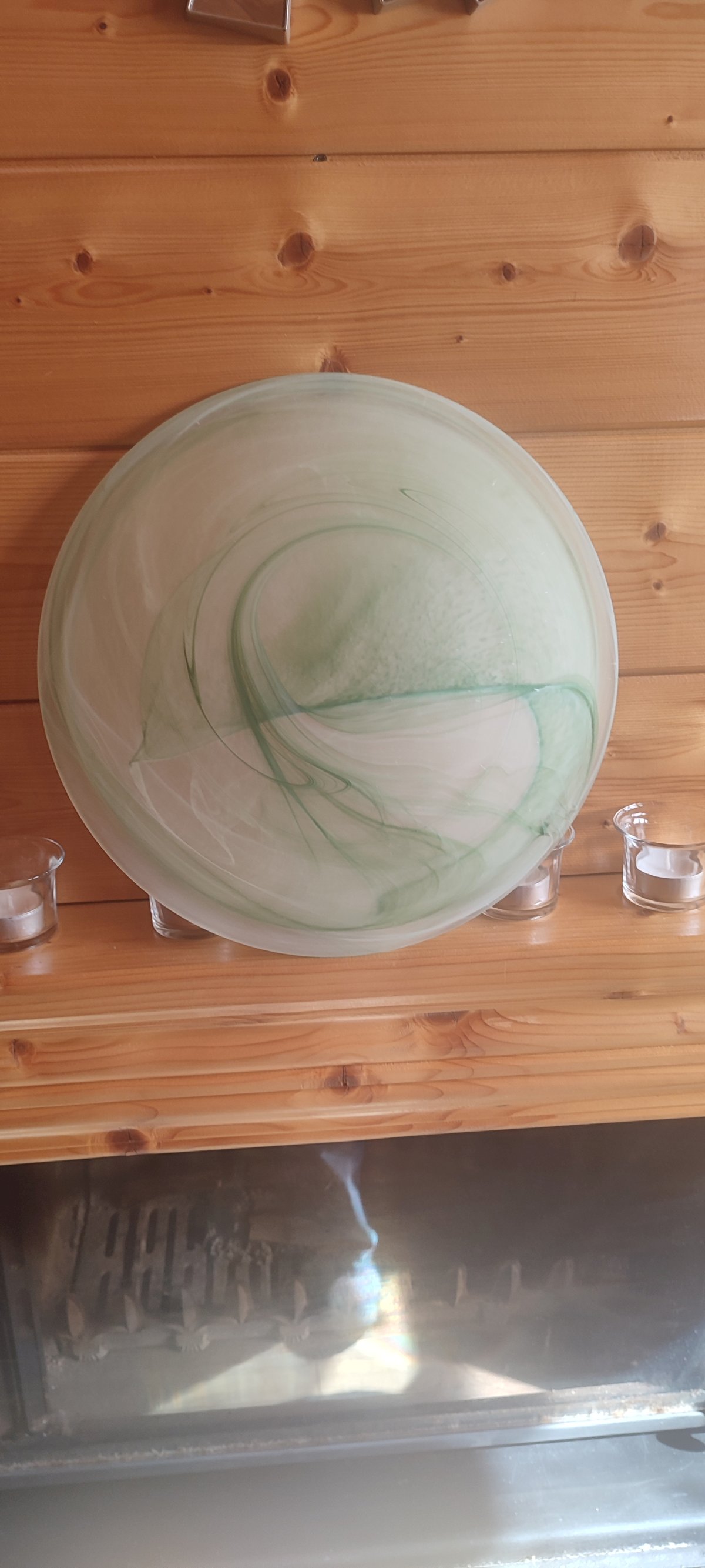 Decorative blown glass bowl with green spiral inclusions, offering a superb effect of slightly opaque transparency, veiled and satin-like depending on the light. Elegant and modern piece, ideal as a centerpiece, fruit bowl, to hang, or as a decorative object for a botanical and natural atmosphere. Handmade work in very good condition. Diameter: 30 cm Height: 7 cm