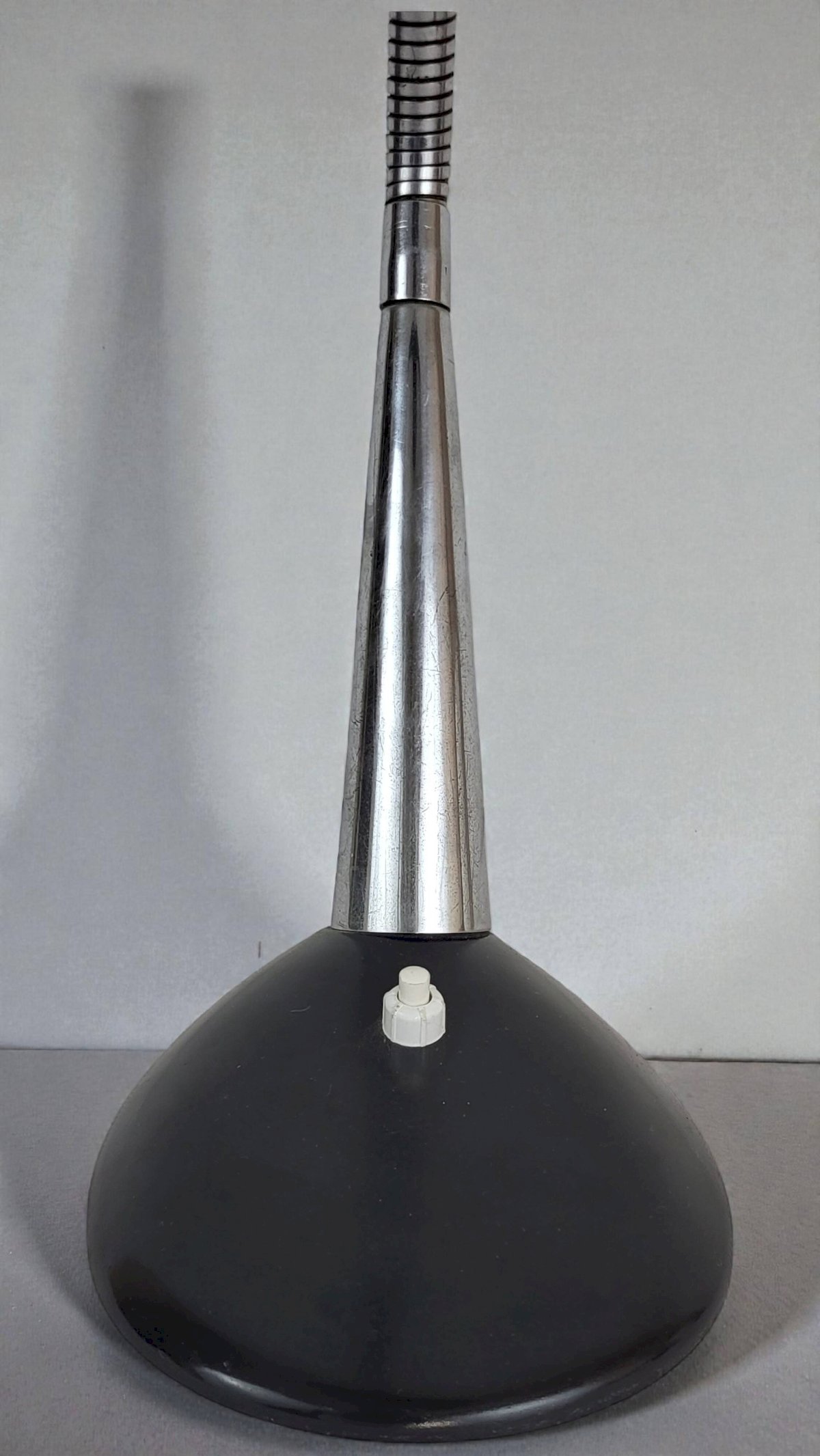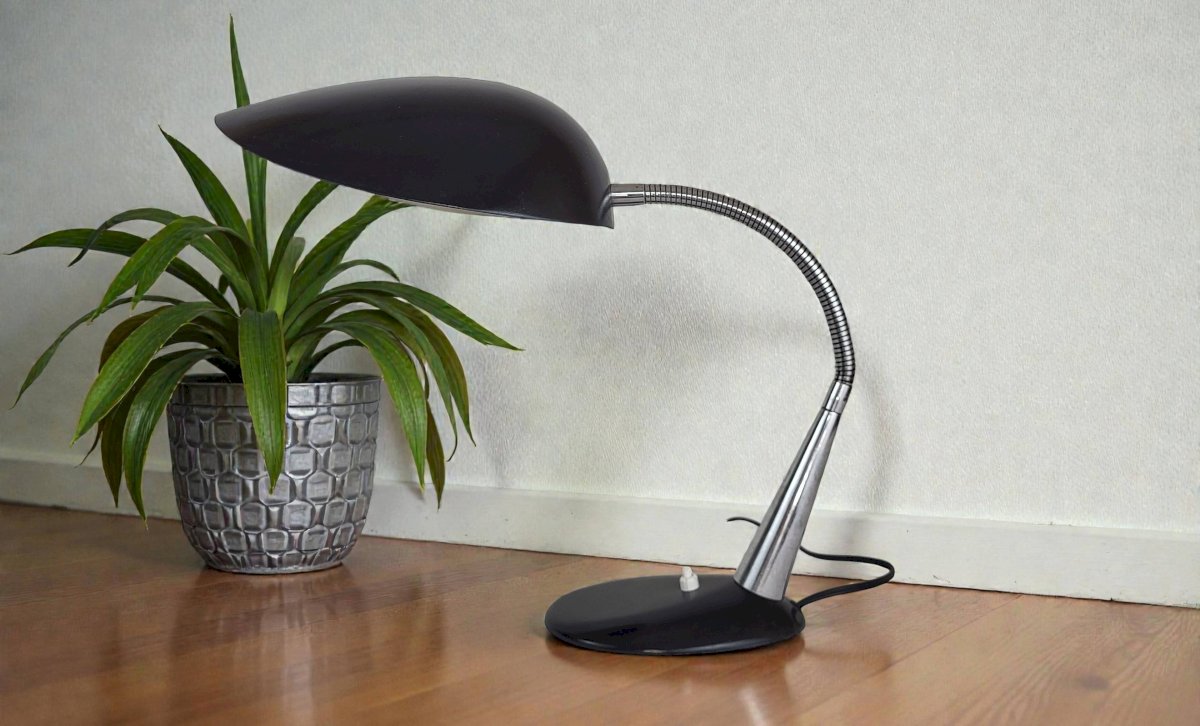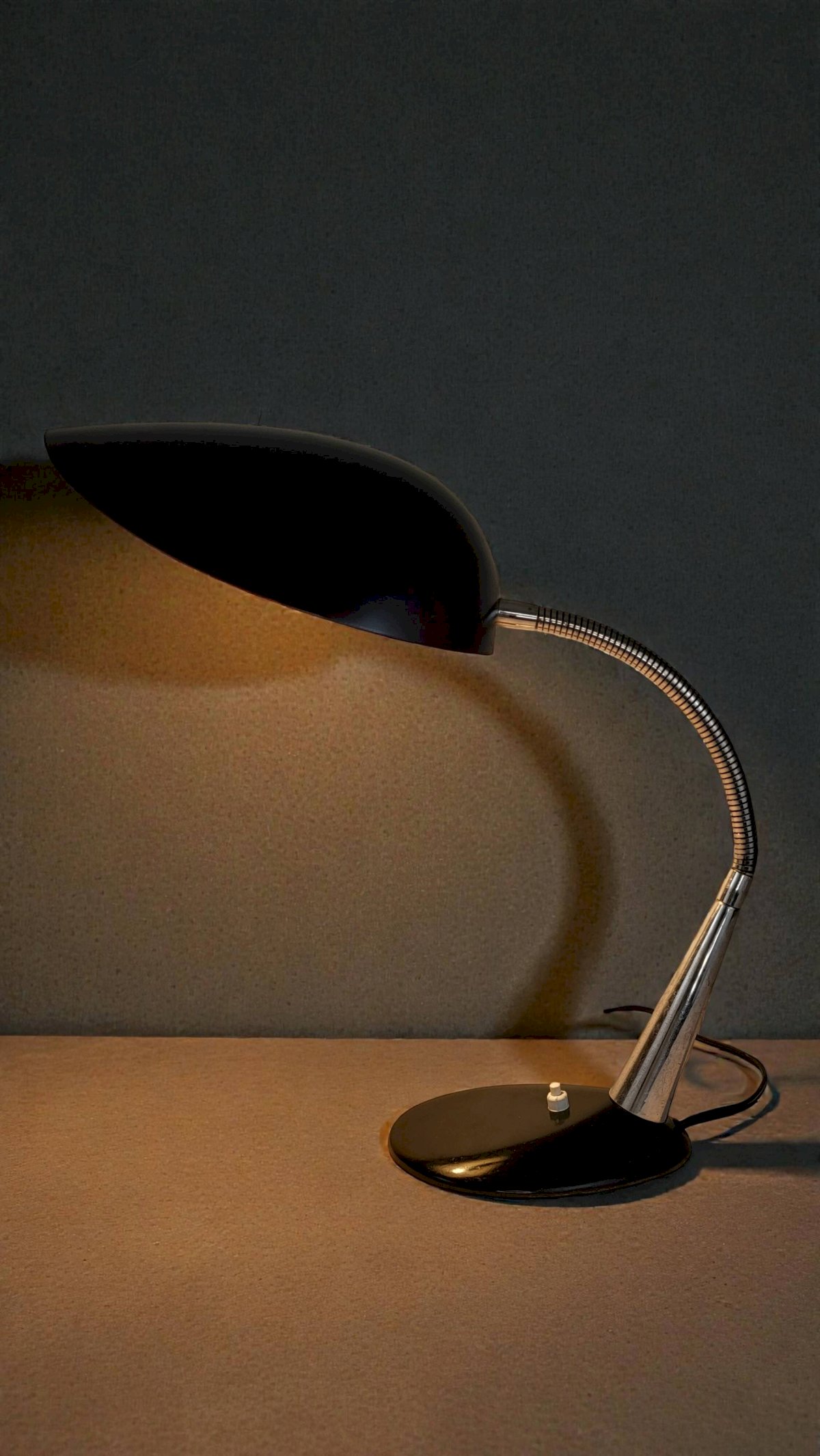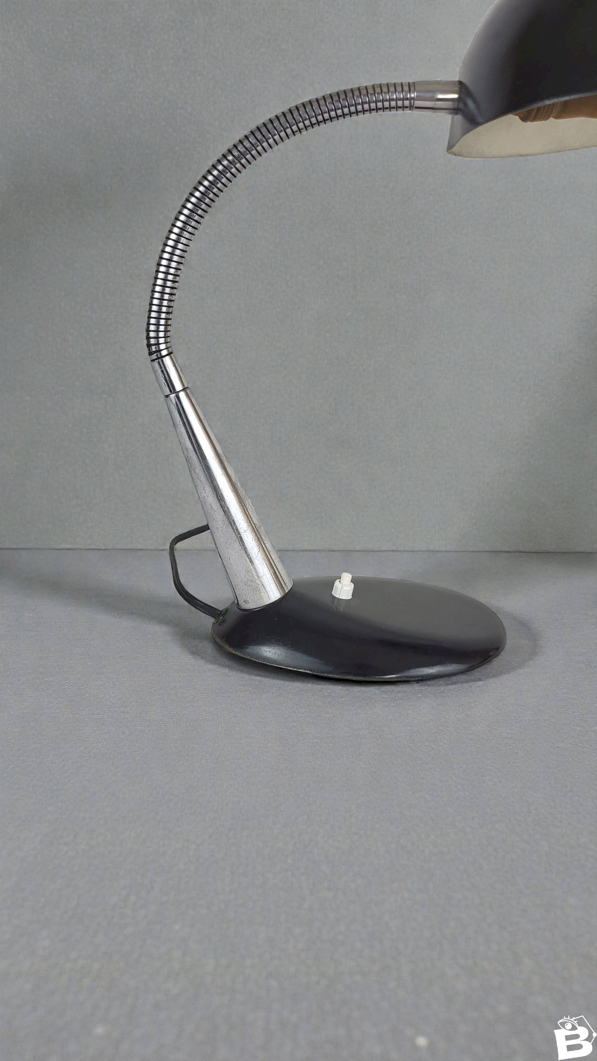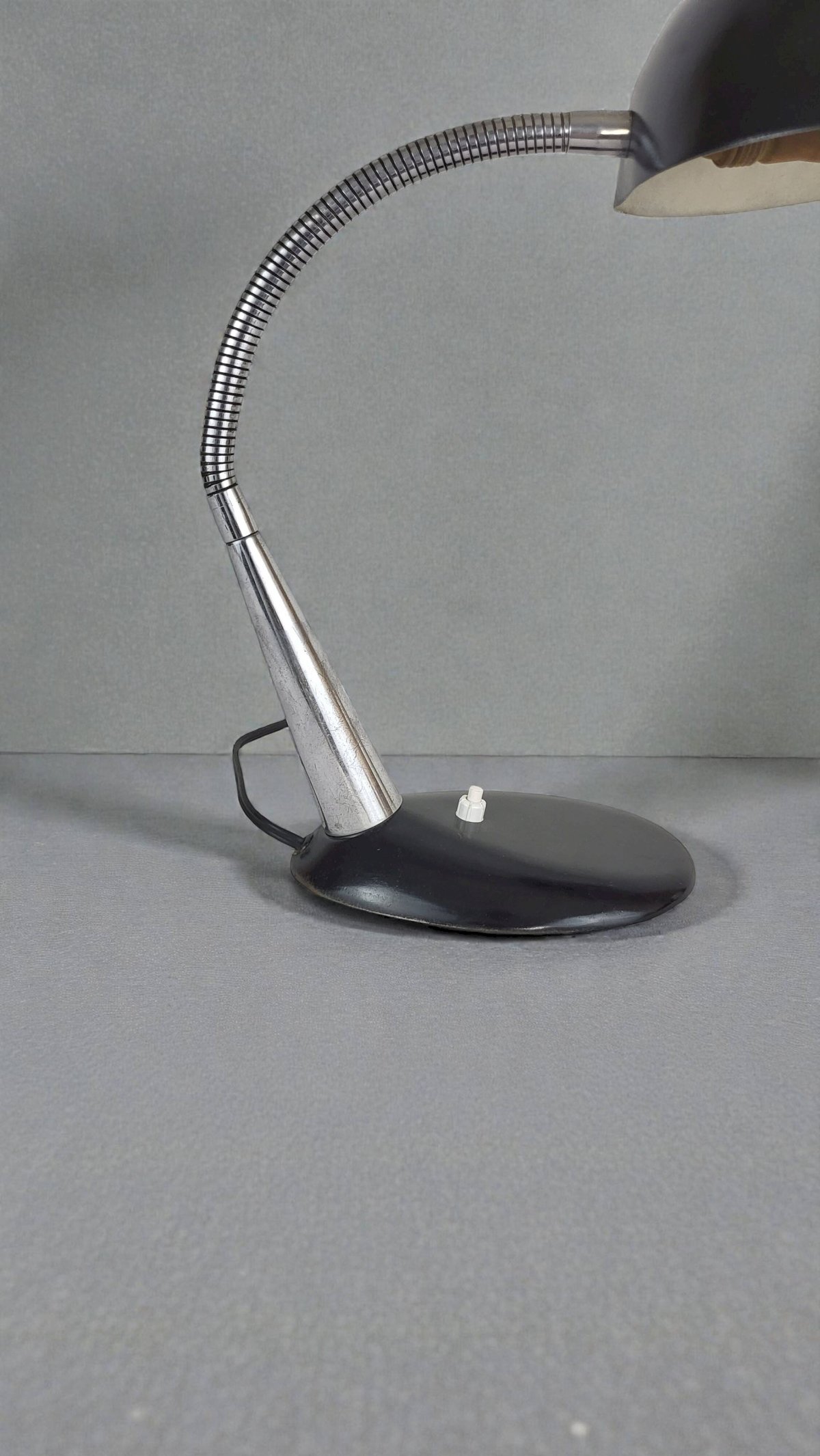 Cossack desk lamp 1950's. Manufacturer: Gebruder Cosack. Oval base in black cast iron. Conical brass tube. Chromed gooseneck. Oval lampshade in black painted aluminum, white painted reflector inside. Height 36 cm. Width 40 cm. Reflector width 20 cm. It is in good condition / usual signs of use and age. No major defects. L: 40 W: 20 H: 36