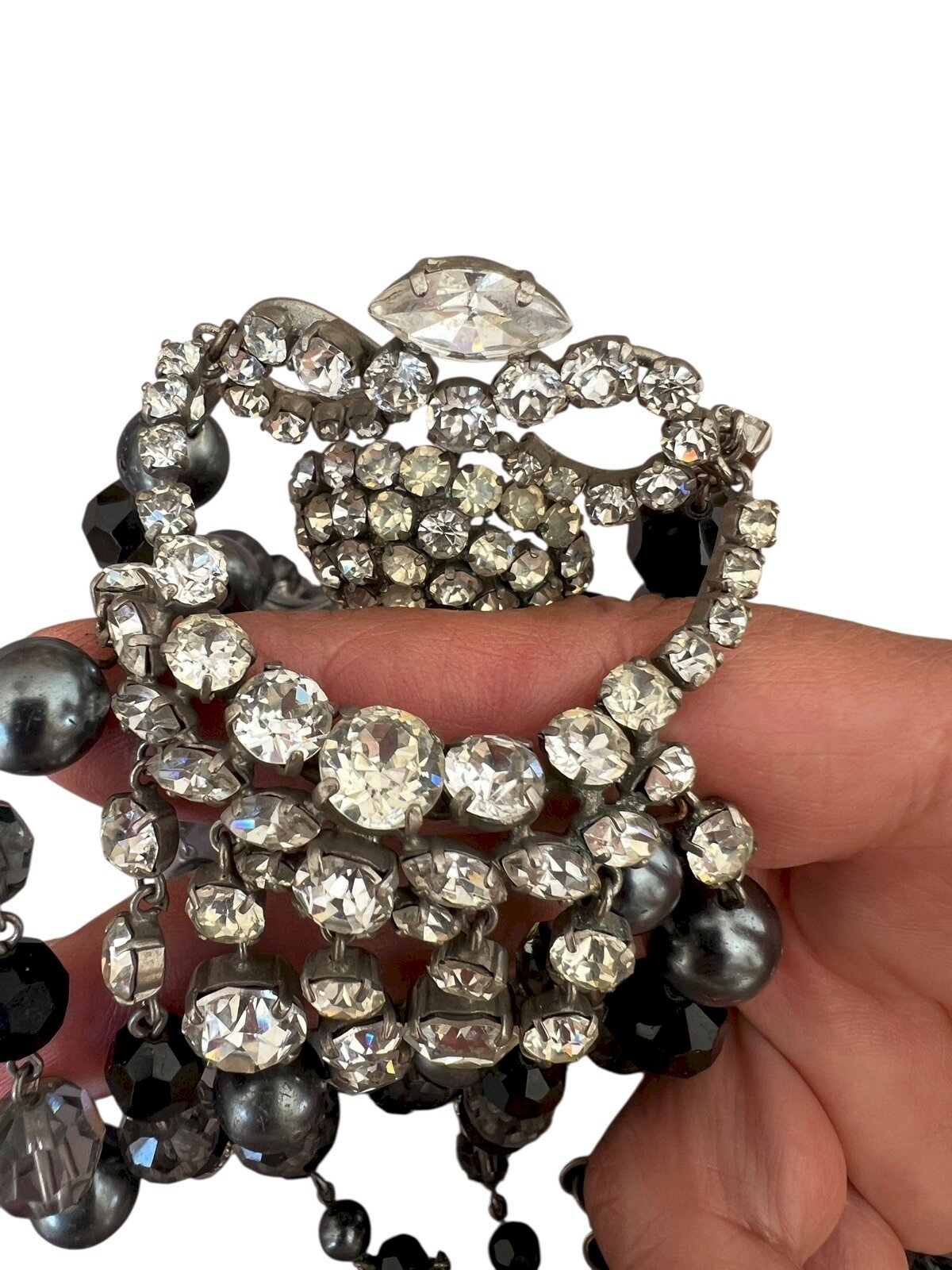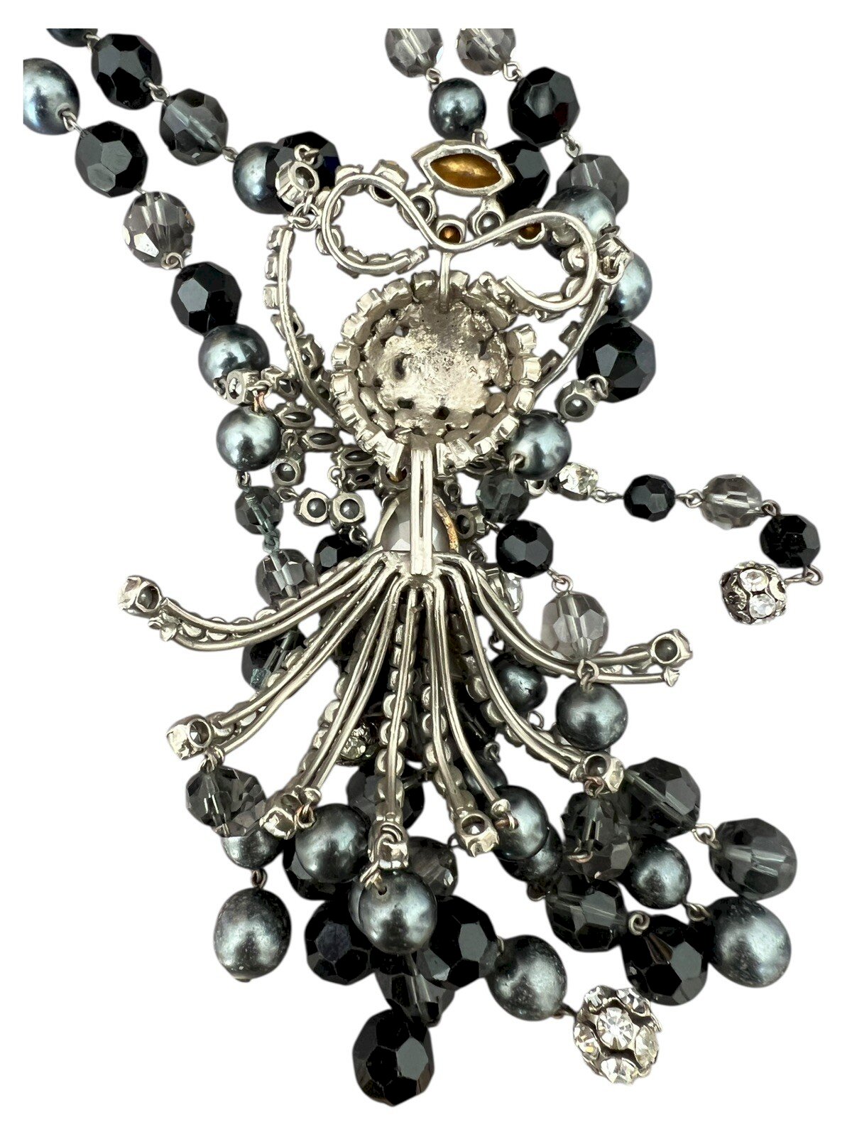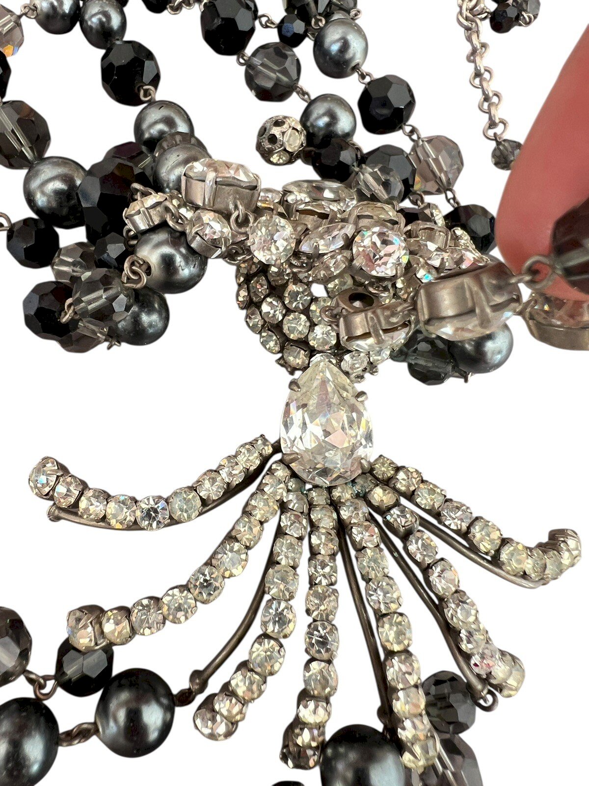 Couture Jewelry - Fabulous Necklace by Roger Scemama - Mid-century Vintage Antique. Spectacular vintage haute couture necklace signed by Roger Scemama, a rare and exceptional piece from the 1950s. This imposing jewelry showcases the French craftsmanship of the time. The necklace consists of a double strand of pearls in sophisticated shades of black and gray, punctuated by sparkling crystals. Please note slight wear on some gray pearls, reflecting its history. Its total length is 46 cm, adjustable up to 51 cm with a 5 cm extension chain. The centerpiece is a spectacular pendant approximately 15.5 cm long, featuring a double-layered construction that gives it a unique dimension and relief. Its complex and detail-rich design showcases an artistic arrangement of sparkling rhinestones and matching pearls, typical of the creative and bold style of Roger Scemama. Weighing a total of 238 grams, this necklace is a true statement of style and quality. It embodies the elegance and glamour of vintage French haute couture, making it a valuable addition to any jewelry collection. Quality: Haute couture French craftsmanship, premium materials (pearls, crystals, silver metal). Note: slight wear on some gray pearls. Designer: Attributed to Roger Scemama, an iconic figure in luxury costume jewelry from the 1950s. For shipping outside Europe, please request a quote before bidding. Condition: Pre-owned: Item has been worn. ...Pre-owned: Item has been worn. potential imperfections. Dominant stone: N Brand: Roger Scemama Type: Necklace with pendant Dominant color: Gray Material: Faux diamond Length: 46-50 cm Theme: Beauty