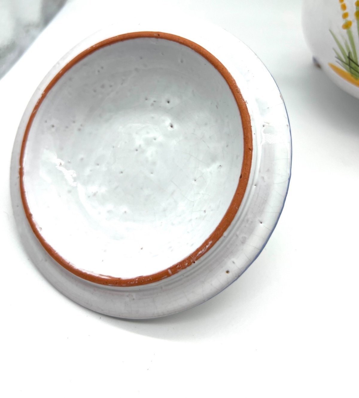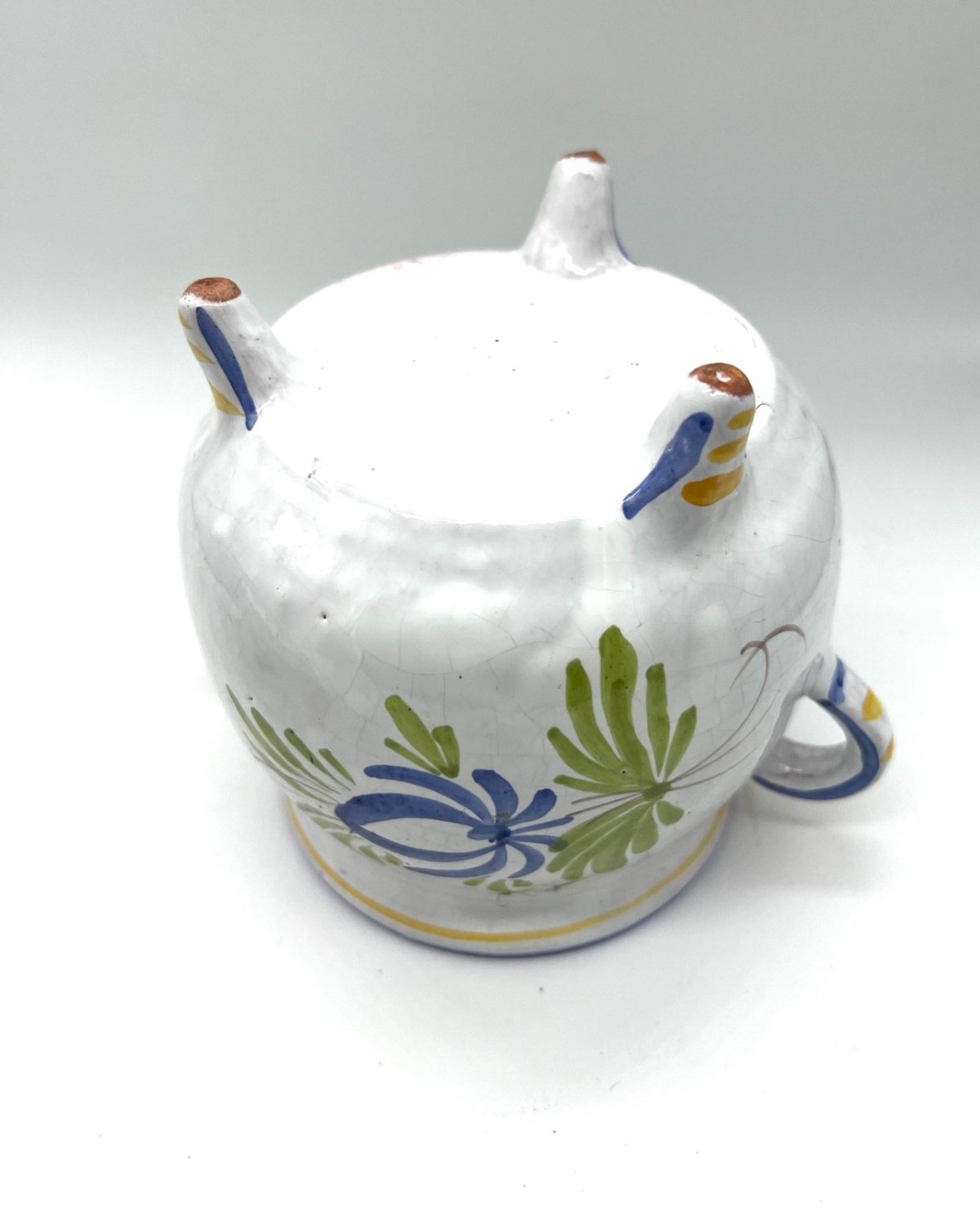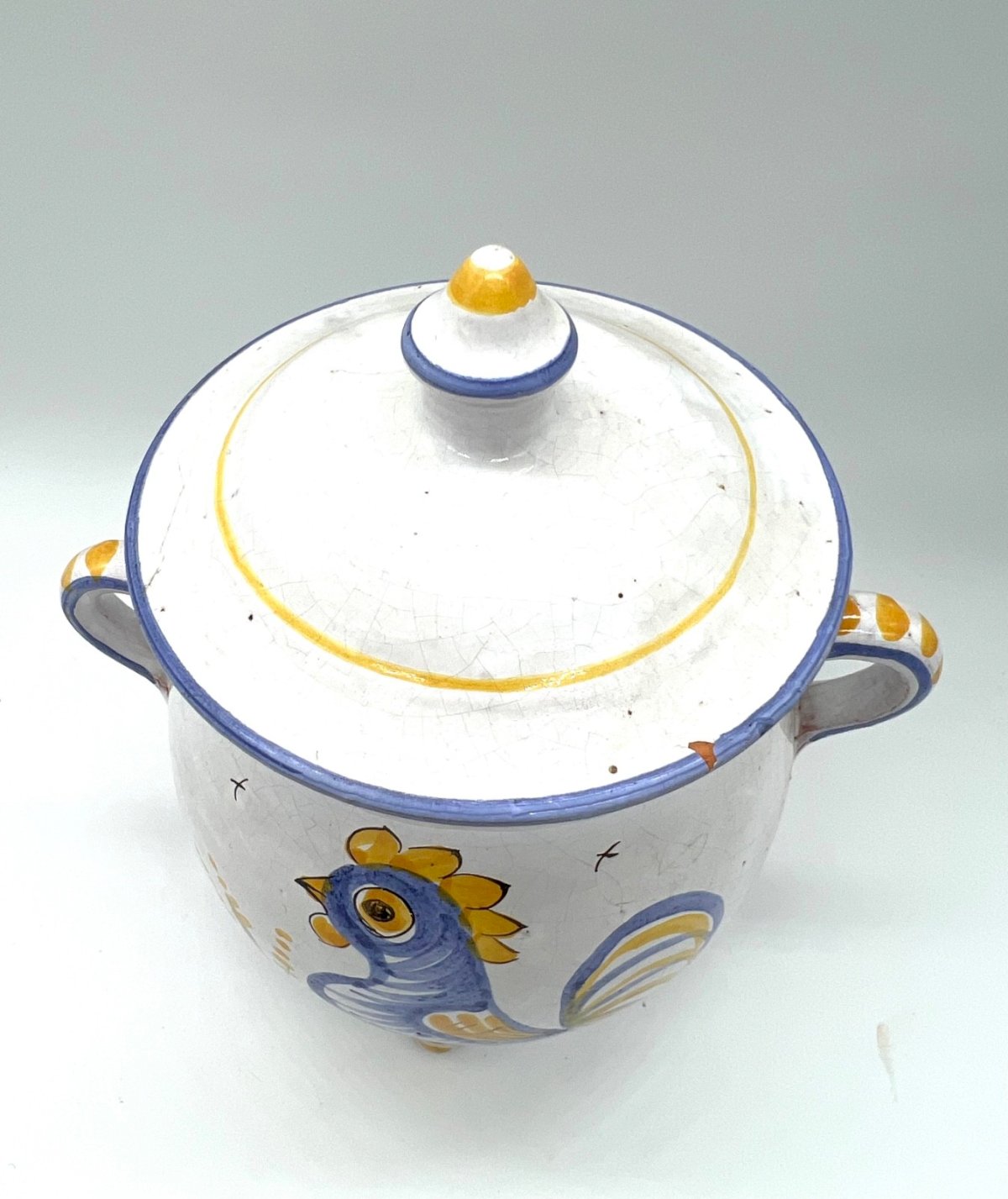 Covered pot in glazed earthenware resting on three small feet and adorned with two side handles. The hand-painted decoration features a stylized blue and yellow rooster as well as floral patterns in bright tones. The lid matches and has a painted grip knob. The glaze exhibits original crazing that gives it a lovely antique effect. A few small marks and discreet chips on the lid show signs of use, but the overall condition remains good for decorative purposes. Dimensions: height 19 cm, diameter 13 cm. Origin: France, artisanal work from the 20th century. A charming object that will find its place in a country kitchen, a family home, or a collection of rustic earthenware. Origin: France Country of manufacture: France Material: Earthenware