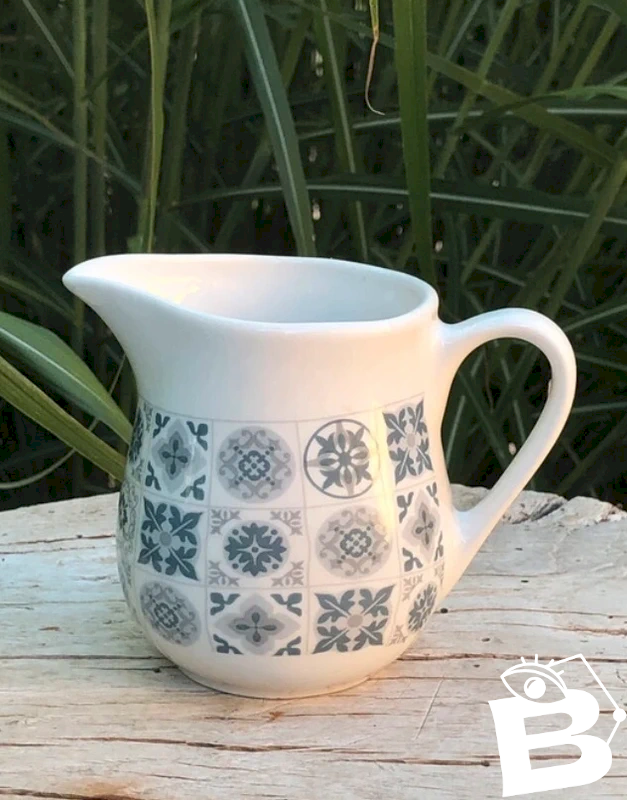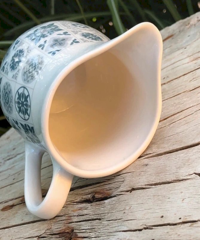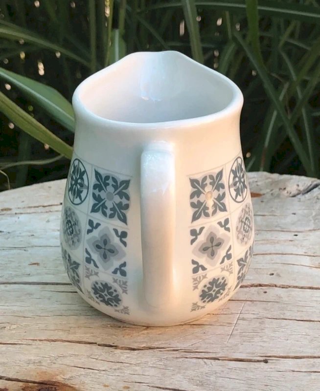 New cream jug with grey and turquoise geometric patterns. Height at the spout 9.5 cm.