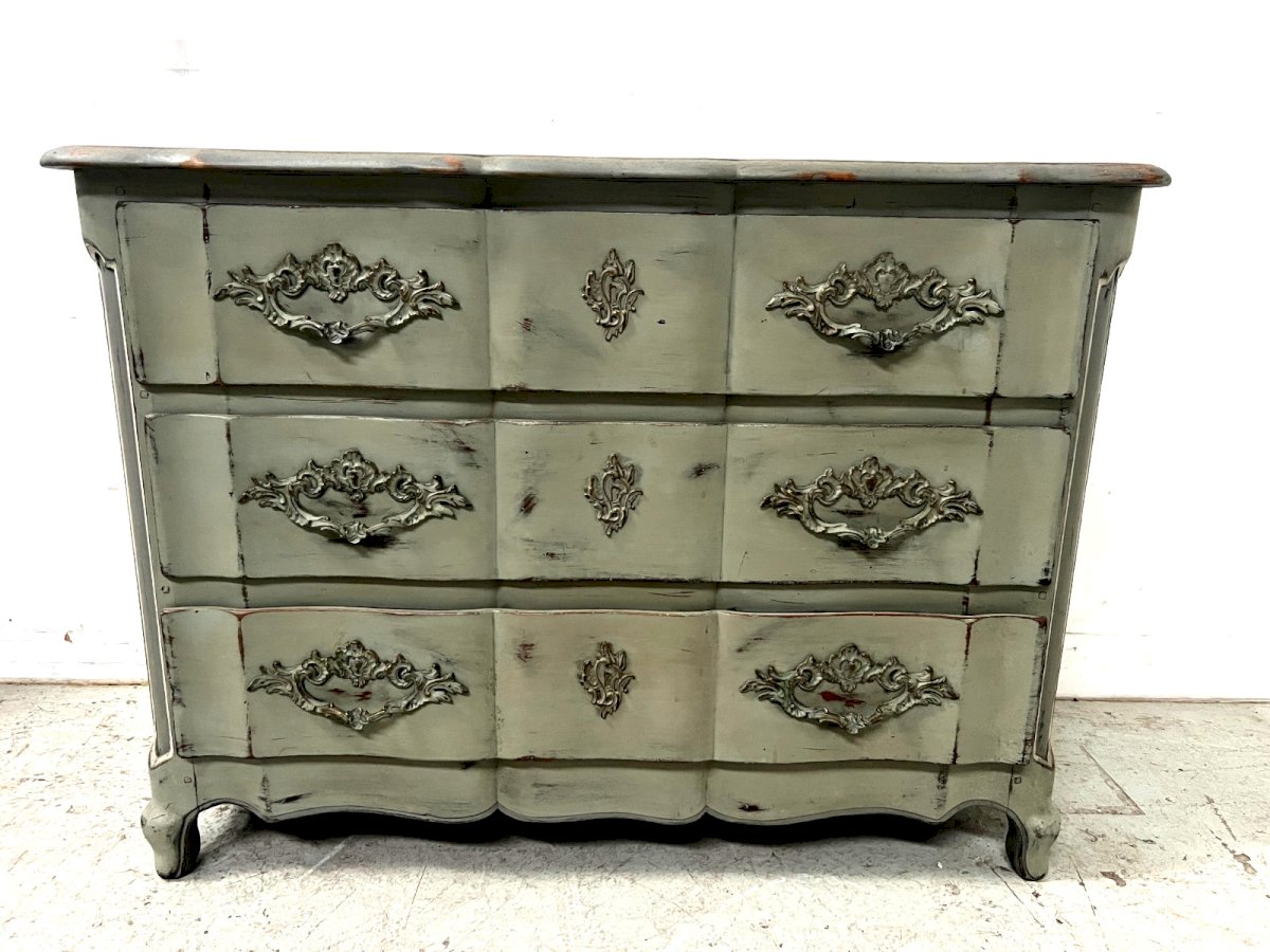 Louis XV style crossbow chest of drawers in patinated oak Three front drawers Top in patinated wood Bronze handles and lock entries Dimensions H x W x Depth Early 20th century Color: Gray Type: Chest of drawers, Lingerie Period: 20th century Design Origin: France Subtype: 3 drawers Country of origin: France Material: Oak