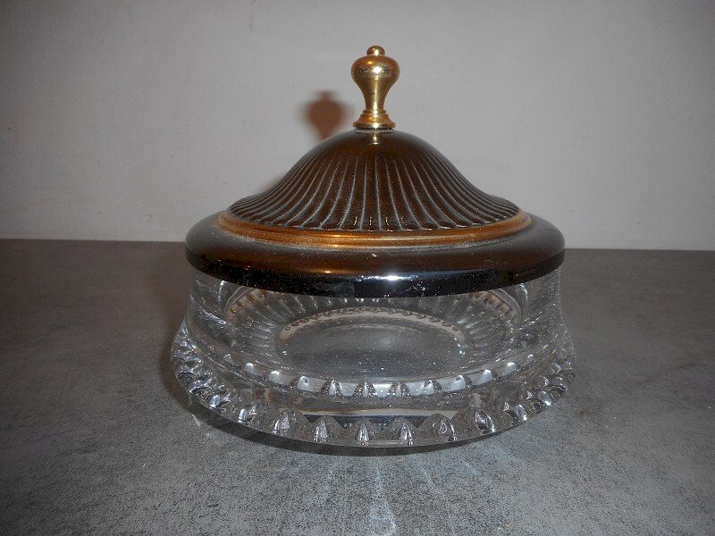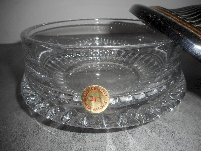 Superb crystal and silver and gold metal candy jar, it is in very good condition and still has the sticker "Bleikristal 24% Bavaria W Germany." It measures 16 cm in diameter and 6.5 cm high without the lid, and 13.5 cm high with the lid.