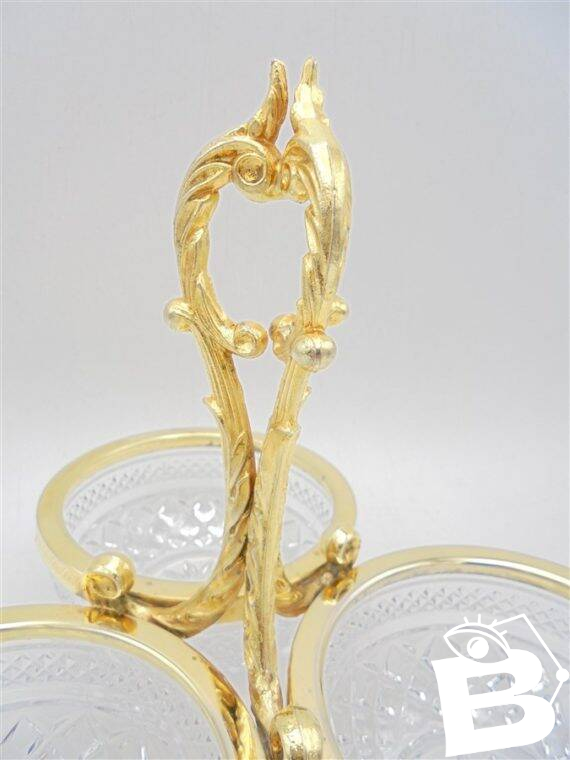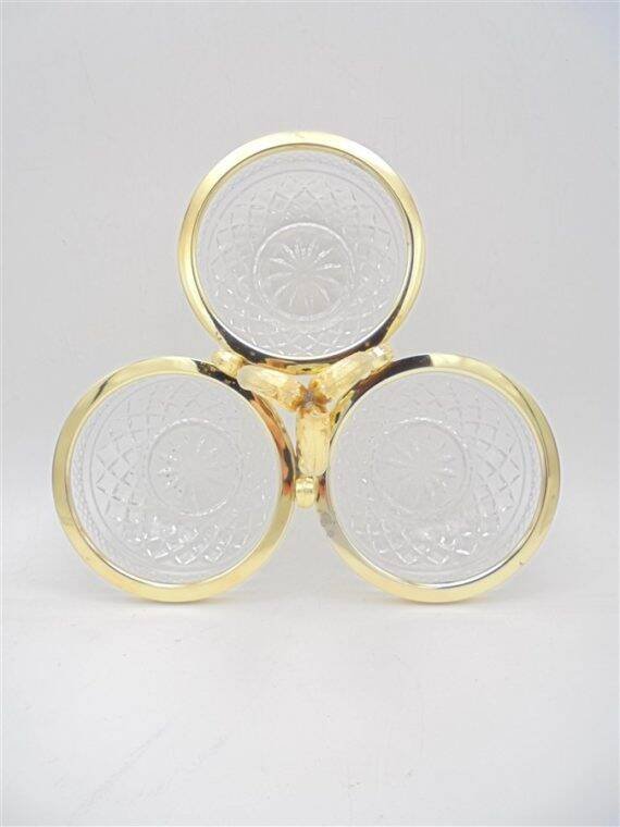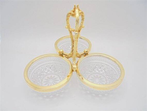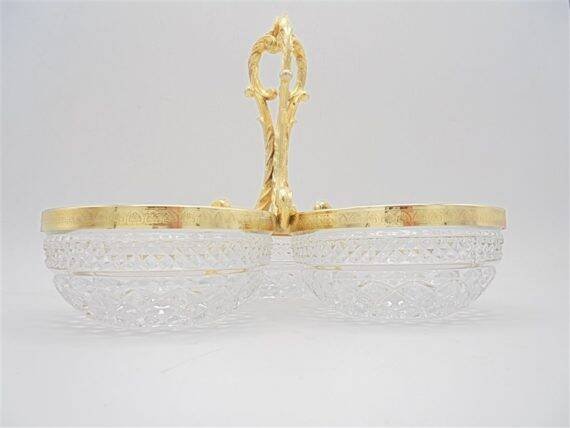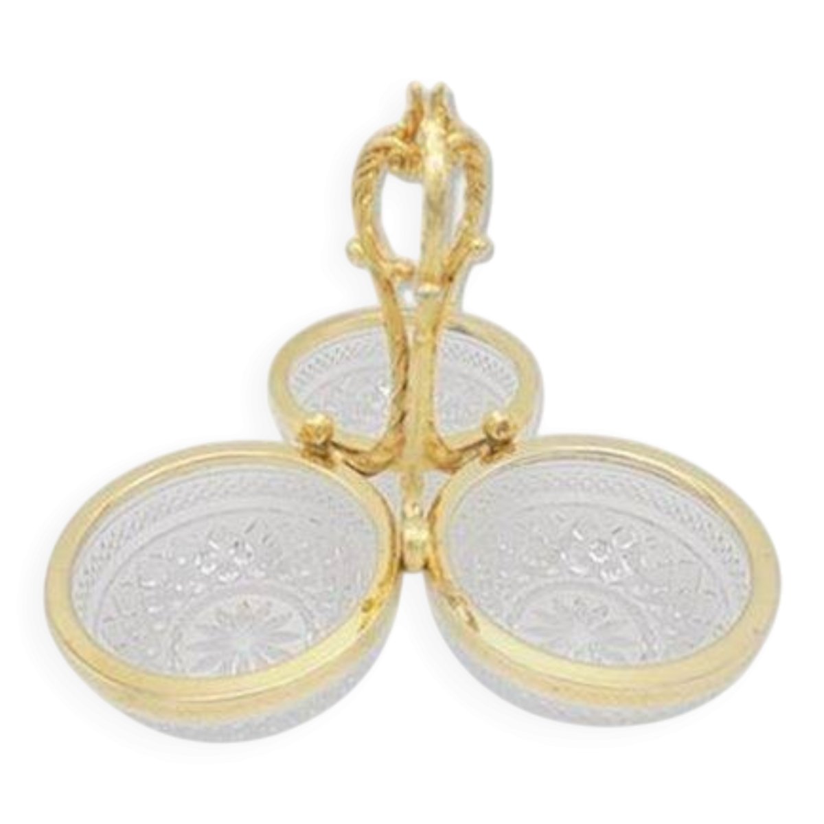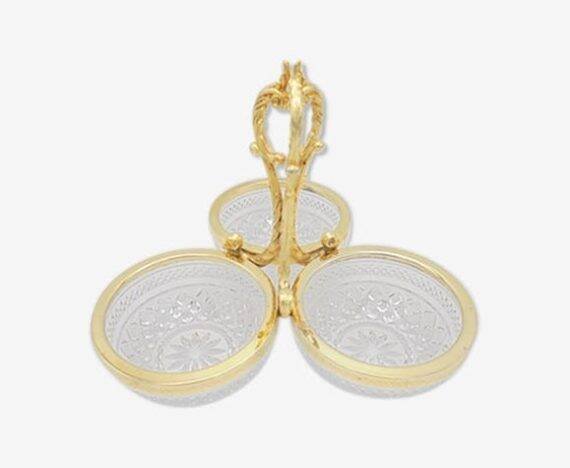 3-compartment crystal server with a gold-colored metal handle featuring slight signs of oxidation. Height: 18 cm. Width: 23 cm. Depth of the ramekins: 4.5 cm. Weight: 1 kg. L: 23 W: 4 H: 18
