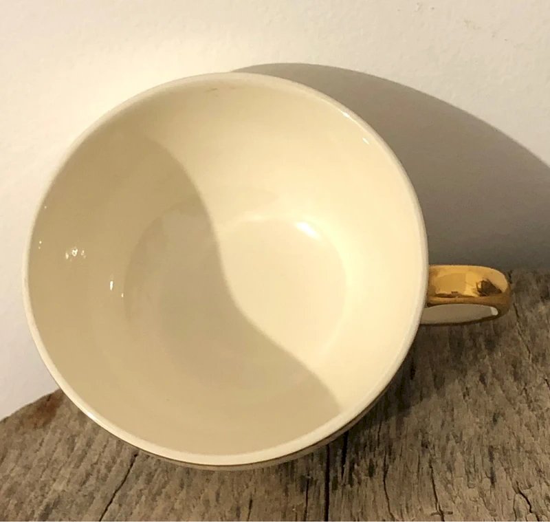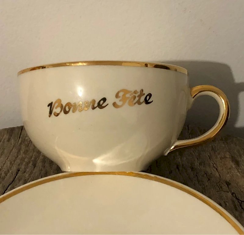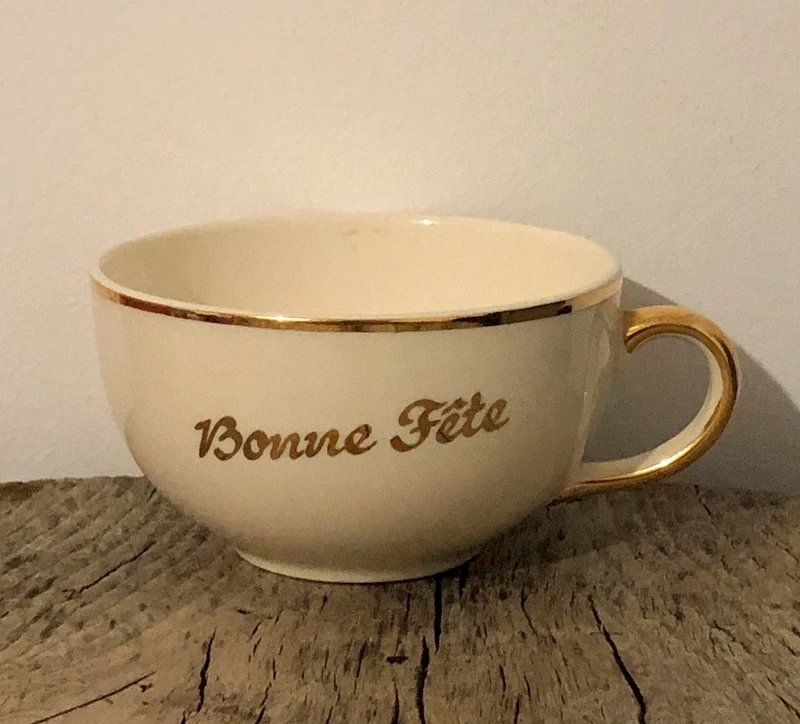 Villeroy & Boch cup and saucer in very good overall condition. Cream and gold color, inscription "Happy Holidays." Cup height 5.8 cm, cup diameter 10.5 cm, saucer diameter 17 cm.