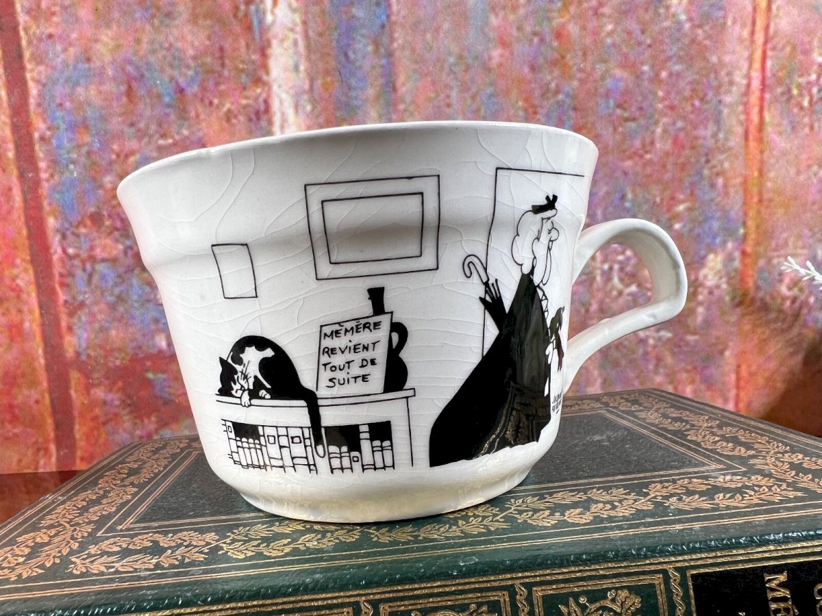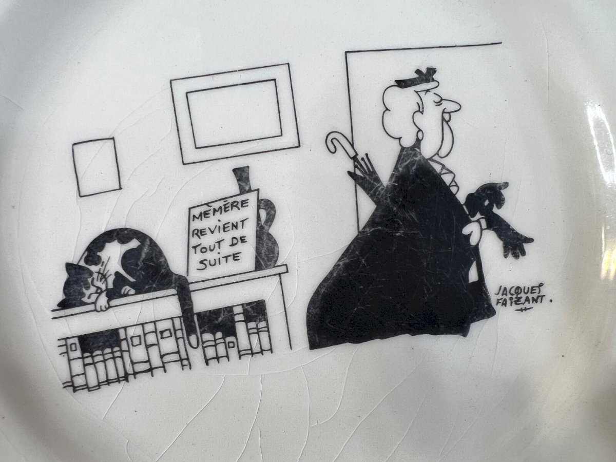 Vintage cup and saucer by Saint Amand, illustrated by Jacques Faizant – French cartoonist known for his humorous scenes. The design features an old lady and a mischievous cat with a sign “Mémère revient tout de suite” (“Grandma will be back soon”), in Faizant’s iconic line style. Measurements : • Cup : – Diameter: 11.6 cm (4.56 in) – Height: 7.5 cm (2.95 in) • Saucer : – Diameter: 16 cm (6.29 in) Condition : Very good condition – no chips, no cracks. Perfect for collectors of Faizant artwork, French tableware, or vintage humorous ceramics. Country of origin: France